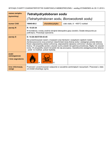 WYCIĄG Z KARTY CHARAKTERYSTYKI SUBSTANCJI NIEBEZPIECZNEJ - według 67/548/EWG do 30.11.2010 r. nazwa związku (synonimy) Tetrahydrydoboran sodu (Tetrahydroboran sodu, Borowodorek sodu) numer CAS 16940-66-2 zwroty R R: 15-25-34 charakterystyka ciało stałe, tt. ~400°C rozkład W kontakcie z wodą uwalnia skrajnie łatwopalne gazy (wodór). Działa toksycznie po połknięciu. Powoduje oparzenia. zwroty S S: 14-26-36/37/39-43-45 Nie przechowywać razem z kwasami oraz tlenkami i związkami ciężkich metali. Zanieczyszczone oczy przemyć natychmiast dużą ilością wody i zasięgnąć porady lekarza. Nosić odpowiednią odzież ochronną, odpowiednie rękawice ochronne i okulary lub ochronę twarzy. W przypadku pożaru używać suchy piasek lub gaśnicę proszkową. Nigdy nie używać wody. W przypadku awarii lub jeżeli źle się poczujesz, niezwłocznie zasięgnij porady lekarza - jeżeli to możliwe, pokaż etykietę. znaki ostrzegawcze / inne zagrożenia F inne informacje, uwagi T Przenosić i przechowywać wyłącznie w szczelnie zamkniętych naczyniach. Pracować z dala od źródeł otwartego ognia. WYCIĄG Z KARTY CHARAKTERYSTYKI SUBSTANCJI NIEBEZPIECZNEJ – zgodnie z GHS i CLP od 01.12.2010 r. nazwa związku (synonimy) Tetrahydrydoboran sodu (Tetrahydroboran sodu, Borowodorek sodu) numer CAS 16940-66-2 zwroty H H260 W kontakcie z wodą uwalniają łatwopalne gazy, które mogą ulegać samozapaleniu. charakterystyka ciało stałe, tt. ~400°C rozkład H301 Działa toksycznie po połknięciu. H311 Działa toksycznie w kontakcie ze skórą. H314 Powoduje poważne oparzenia skóry oraz uszkodzenia oczu. zwroty P P223 Chronić przed wszelkim kontaktem z wodą z powodu gwałtownej reakcji i możliwości wystąpienia błyskawicznego pożaru. P231 + P232 Używać w atmosferze obojętnego gazu. Chronić przed wilgocią. P280 Stosować rękawice ochronne/ odzież ochronną/ ochronę oczu/ ochronę twarzy. P301 + P310 W PRZYPADKU POŁKNIĘCIA: Natychmiast skontaktować się z OŚRODKIEM ZATRUĆ lub z lekarzem. P301 + P330 + P331 W PRZPADKU POLKNIECIA: wypłukać usta. Nie wywoływać wymiotów. P302 + P352 W PRZYPADKU KONTAKTU ZE SKÓRĄ: Umyć dużą ilością wody z mydłem. P305 + P351 + P338 W PRZYPADKU DOSTANIA SIĘ DO OCZU: Ostrożnie płukać woda przez kilka minut. Wyjąć soczewki kontaktowe, jeżeli są i można je łatwo usunąć. Nadal płukać wodą. P370 + P378 W przypadku pożaru: Do gaszenia stosować suchy piasek, chemiczne środki gaśnicze lub pianę alkoholoodporną. P402 + P404 Przechowywać w suchym miejscu. Przechowywać w zamkniętym pojemniku. P422 Zawartość przechowywać w gazie obojętnym. piktogramy i hasło ostrzegawcze Substancje, które w kontakcie z wodą wydzielają substancje łatwopalne (Kat. 1) / inne zagrożenia Działanie żrące na skórę (Kat. 1B) NIEBEZBIECZEŃSTWO! inne informacje, uwagi Ostra toksyczność, Skórnie (Kat. 3) Ostra toksyczność, Doustnie (Kat. 3) Przenosić i przechowywać wyłącznie w szczelnie zamkniętych naczyniach. Chronić przed dostępem wilgoci. Unikać tworzenia pyłu i aerozolu. Nie przechowywać w pobliżu źródeł zapłonu - nie palić tytoniu. Nie dopuścić do przedostania się do kanalizacji. Opracowała: Ewelina Kopeć