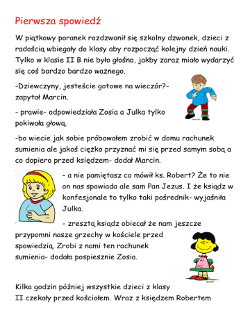 Pierwsza spowiedź W piątkowy poranek rozdzwonił się szkolny dzwonek, dzieci z radością wbiegały do klasy aby rozpocząć kolejny dzień nauki. Tylko w klasie II B nie było głośno, jakby zaraz miało wydarzyć się coś bardzo bardzo ważnego. -Dziewczyny, jesteście gotowe na wieczór?zapytał Marcin. - prawie- odpowiedziała Zosia a Julka tylko pokiwała głową. -bo wiecie jak sobie próbowałem zrobić w domu rachunek sumienia ale jakoś ciężko przyznać mi się przed samym sobą a co dopiero przed księdzem- dodał Marcin. - a nie pamiętasz co mówił ks. Robert? Że to nie on nas spowiada ale sam Pan Jezus. I że ksiądz w konfesjonale to tylko taki pośrednik- wyjaśniła Julka. - zresztą ksiądz obiecał że nam jeszcze przypomni nasze grzechy w kościele przed spowiedzią. Zrobi z nami ten rachunek sumienia- dodała pospiesznie Zosia. Kilka godzin później wszystkie dzieci z klasy II czekały przed kościołem. Wraz z księdzem Robertem weszły do środka i cichutko uklękły przed Najświętszym Sakramentem. -Zdarza się, że zasmucamy Boga - Dobrego Ojca, że nie słuchamy Go i grzeszymy. Pan Bóg nie chce, abyśmy od Niego odeszli. Czeka z utęsknieniem na powrót grzesznika. Jeżeli zawiniliście, odwracając się od Ojca, możecie do Niego wrócić przez żal za grzechy, postanowienie poprawy, szczerą spowiedź i zadośćuczynienie za swoje grzechy. Bramą powrotu jest Sakrament Pokuty.- powiedział ks. Robert. Dzieci usiadły w ławkach, kontem oka zobaczyły że w konfesjonale czeka już na nich ks. Proboszcz. - Zanim usiądę w drugim konfesjonale i zacznie się wasza pierwsza w życiu spowiedź obiecałem, że zrobię z wami rachunek sumienia. Spróbujemy wspólnie zastanowić się nad waszymi grzechami. Ja będę głośno zadawał wam pytania a wy po cichu w swoim sercu będziecie sobie odpowiadać. Dobrze? - dobrze- odpowiedziały chórem dzieci. - Przykazanie Pierwsze- Czy opuszczałem z lenistwa modlitwy codzienne? Czy podczas modlitwy myślałem umyślnie o innych sprawach? Czy zaniedbywałem naukę religii? - przykazanie drugie- Czy wymawiałem imiona święte w żartach lub w złości? Czy przeklinałem? Czy przysięgałem niepotrzebnie lub fałszywie? - przykazanie trzecie- Czy w dniu świętym opuściłem z lenistwa Mszę świętą? Czy spóźniłem się na Mszę świętą? Czy w kościele zachowywałem się źle? Czy pracowałem w dniu świątecznym? -przykazanie czwarte-Czy byłem nieposłuszny rodzicom lub przełożonym? Czy zasmucałem ich lub źle im życzyłem? Czy naśmiewałem się z ludzi starszych lub ułomnych? -Przykazanie piąte- Czy biłem kogoś? Czy przezywałem? Czy źle komuś życzyłem? Czy namawiałem bliźniego do grzechu? Czy dręczyłem zwierzęta? - przykazanie szóste i dziewiąte- Czy myślałem chętnie o sprawach nieczystych? Czy przysłuchiwałem się brzydkiej mowie? Czy patrzyłem na nieskromne rzeczy? Czy mówiłem lub myślałem nieskromnie? Czy robiłem coś bezwstydnego sam..., z kimś? Czy pragnąłem coś nieskromnego widzieć..., słyszeć..., czynić? -przykazanie siódme i dziesiąte- Czy kradłem: komu i co? Czy zatrzymałem rzeczy pożyczone lub znalezione? Czy psułem rzeczy cudze? Czy oszukiwałem: kogo i w czym? Czy chciałem kraść: komu i co? - przykazanie ósme- Czy kłamałem? Czy oczerniałem bliźniego? Czy obmawiałem? Czy posądzałem?- zakończył ks. Robert a potem po cichutku poszedł do konfesjonału. Chwilę potem dzieci kolejno zaczęły podchodzić do pierwszej swojej spowiedzi. Jakiś czas później Marcin wracał z Zosią i Julką do domu. - wiecie? To wcale nie było takie straszne jak myślałem ranopowiedział Marcin. - fajne uczucie mieć czyste serce nawet jak trzeba było przyznać się do tego co złe w naszym życiu- powiedziała Zosia. - myślicie, że jesteśmy gotowi żeby przyjąć Pana Jezusa do swojego serca- dopytywał Marcin Dziewczynki długo się nad tym zastanawiały - myślę że jesteśmy na dobrej drodze- odpowiedziała w końcu Julka. k.
