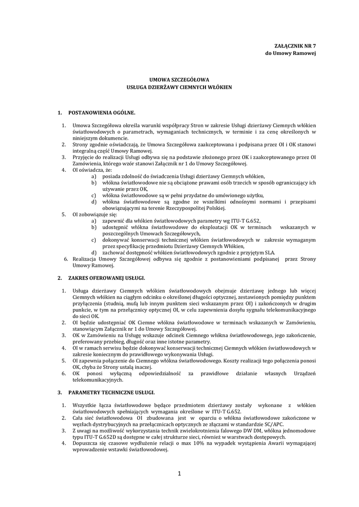 ZAŁĄCZNIK NR 7 do Umowy Ramowej UMOWA SZCZEGÓŁOWA USŁUGA DZIERŻAWY CIEMNYCH WŁÓKIEN 1. POSTANOWIENIA OGÓLNE. 1. Umowa Szczegółowa określa warunki współpracy Stron w zakresie Usługi dzierżawy Ciemnych włókien światłowodowych o parametrach, wymaganiach technicznych, w terminie i za cenę określonych w niniejszym dokumencie. 2. Strony zgodnie oświadczają, że Umowa Szczegółowa zaakceptowana i podpisana przez OI i OK stanowi integralną część Umowy Ramowej. 3. Przyjęcie do realizacji Usługi odbywa się na podstawie złożonego przez OK i zaakceptowanego przez OI Zamówienia, którego wzór stanowi Załącznik nr 1 do Umowy Szczegółowej. 4. OI oświadcza, że: a) posiada zdolność do świadczenia Usługi dzierżawy Ciemnych włókien, b) włókna światłowodowe nie są obciążone prawami osób trzecich w sposób ograniczający ich używanie przez OK, c) włókna światłowodowe są w pełni przydatne do umówionego użytku, d) włókna światłowodowe są zgodne ze wszelkimi odnośnymi normami i przepisami obowiązującymi na terenie Rzeczypospolitej Polskiej. 5. OI zobowiązuje się: a) zapewnić dla włókien światłowodowych parametry wg ITU-T G.652, b) udostępnić włókna światłowodowe do eksploatacji OK w terminach wskazanych w poszczególnych Umowach Szczegółowych, c) dokonywać konserwacji technicznej włókien światłowodowych w zakresie wymaganym przez specyfikację przedmiotu Dzierżawy Ciemnych Włókien, d) zachować dostępność włókien światłowodowych zgodnie z przyjętym SLA. 6. Realizacja Umowy Szczegółowej odbywa się zgodnie z postanowieniami podpisanej przez Strony Umowy Ramowej. 2. 1. 2. 3. 4. 5. 6. 3. 1. 2. 3. 4. ZAKRES OFEROWANEJ USŁUGI. Usługa dzierżawy Ciemnych włókien światłowodowych obejmuje dzierżawę jednego lub więcej Ciemnych włókien na ciągłym odcinku o określonej długości optycznej, zestawionych pomiędzy punktem przyłączenia (studnią, mufą lub innym punktem sieci wskazanym przez OI) i zakończonych w drugim punkcie, w tym na przełącznicy optycznej OI, w celu zapewnienia dosyłu sygnału telekomunikacyjnego do sieci OK. OI będzie udostępniać OK Ciemne włókna światłowodowe w terminach wskazanych w Zamówieniu, stanowiącym Załącznik nr 1 do Umowy Szczegółowej. OK w Zamówieniu na Usługę wskazuje odcinek Ciemnego włókna światłowodowego, jego zakończenie, preferowany przebieg, długość oraz inne istotne parametry. OI w ramach serwisu będzie dokonywać konserwacji technicznej Ciemnych włókien światłowodowych w zakresie koniecznym do prawidłowego wykonywania Usługi. OI zapewnia połączenie do Ciemnego włókna światłowodowego. Koszty realizacji tego połączenia ponosi OK, chyba że Strony ustalą inaczej. OK ponosi wyłączną odpowiedzialność za prawidłowe działanie własnych Urządzeń telekomunikacyjnych. PARAMETRY TECHNICZNE USŁUGI. Wszystkie łącza światłowodowe będące przedmiotem dzierżawy zostały wykonane z włókien światłowodowych spełniających wymagania określone w ITU-T G.652. Cała sieć światłowodowa OI zbudowana jest w oparciu o włókna światłowodowe zakończone w węzłach dystrybucyjnych na przełącznicach optycznych ze złączami w standardzie SC/APC. Z uwagi na możliwość wykorzystania technik zwielokrotnienia falowego DW DM, włókna jednomodowe typu ITU-T G.652D są dostępne w całej strukturze sieci, również w warstwach dostępowych. Dopuszcza się czasowe wydłużenie relacji o max 10% na wypadek wystąpienia Awarii wymagającej wprowadzenie wstawki światłowodowej. 1 4. REALIZACJA ZAMÓWIENIA NA USŁUGĘ. 1. W celu realizacji Usługi, OK przekaże do OI Zamówienie na Usługę dzierżawy Ciemnych włókien światłowodowych, zgodnie ze wzorem określonym w Załączniku nr 1. 2. OI udziela odpowiedzi na wolne od braków Zamówienie na Usługę w terminie do 7 (siedmiu) DR od dnia 3. 4. 5. 6. 7. 8. 9. 10. 11. 5. 6. jego otrzymania, informując OK o: a) możliwości realizacji Usługi określonej w Zamówieniu na Usługę, przesyłając warunki techniczne prowadzonych prac. b) braku możliwości realizacji Usługi określonej w Zamówieniu na Usługę wraz z uzasadnieniem oraz podaniem powodów braku możliwości realizacji tej Usługi oraz ewentualnie proponuje rozwiązanie alternatywne. Udzielając odpowiedzi pozytywnej OI dokonuje jednocześnie rezerwacji zasobów sieciowych na okres 30 (trzydziestu) DR. Przedłużenie rezerwacji zasobów na wniosek OK będzie dodatkowo płatne. Niezwłocznie po podpisaniu Umowy, Strony ustalą termin udostępnienia Usługi. Udostępnienie Usługi nastąpi na podstawie Protokołu zdawczo-odbiorczego: a) w terminie nie później niż 14 (czternaście) DR, chyba że Strony ustalą inny termin. b) w terminie wynikającym z warunków technicznych, w szczególności gdy dotyczy to rozbudowy sieci. W przypadku niepodpisania przez OK Protokołu zdawczo – odbiorczego w terminie 2 (dwóch) DR i niezgłoszenia w tym terminie przez OK, w formie pisemnej, zastrzeżeń, data podpisanego jednostronnie przez OI Protokołu zdawczo – odbiorczego, stanowiącego Załącznik nr 2, będzie uważana za udostępnienie Usługi. Niezwłocznie po rozwiązaniu lub wygaśnięciu Umowy Szczegółowej OI i OK ustalą termin zwrotu elementów Infrastruktury niezbędnych do realizacji Usługi. Termin ten przypada nie później niż 7 (siedem) DR od dnia rozwiązania lub wygaśnięcia Umowy Szczegółowej. Przekazanie i zwrot elementów Infrastruktury niezbędnej do realizacji Usługi, odbywa się na podstawie Protokołu zdawczo – odbiorczego sporządzonego i podpisanego przez Strony. OK przed zwrotem elementów Infrastruktury przywróci je do stanu pierwotnego, z uwzględnieniem zużycia wynikającego z ich prawidłowej eksploatacji. OK po zakończeniu prac instalacyjnych zobowiązany jest do dostarczenia do OI dokumentacji powykonawczej w wersji elektronicznej. Dokumentacja musi odzwierciedlać stan fakty