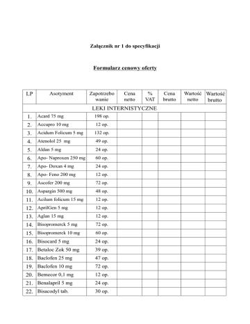 Formularz cenowy oferty LP Wartość brutto LEKI INTERNISTYCZNE