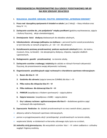 PRZEDSIĘWZIĘCIA PROZDROWOTNE DLA SZKOŁY PODSTAWOWEJ NR 69 NA ROK SZKOLNY 2014/2015 I. REALIZACJA ZAŁOŻEŃ SZKOLNEJ POLITYKI ZDROWOTNEJ „WYBIERAM ZDROWIE” 1. Praca nad dyscypliną spożywania II śniadań w szkole ( po 2 lekcji) – klasy młodsze oraz klasy IV i V, 2. Zachęcanie uczniów do „nie podjadania” między posiłkami (godziny wychowawcze, zajęcia z kultury fizycznej, akcje uświadamiające), 3. Zmniejszanie ilości słodyczy dodawanych do obiadów szkolnych, 4. Udoskonalanie zdrowego jadłospisu na stołówce – personel kuchni został przeszkolony w tym kierunku w ramach programu „6 – 10 – 14 dla zdrowia”, 5. Kształtowanie postawy prozdrowotnej podczas wycieczek szkolnych (min.: do teatru, muzeum, kina, na biwaki) - nie akceptujemy słodyczy, chipsów, napojów słodkich i gazowanych, 6. Redagowanie gazetki prozdrowotnej na terenie szkoły, 7. Zachęcanie uczniów z nadwagą i otyłością do udziału w różnych formach aktywności fizycznej, do prezentowania swojej aktywności ruchowej, 8. Organizowanie pozalekcyjnych zajęć ruchowych o charakterze sportowo-rekreacyjnym: 1. Basen dla klas II – VI 2. Godzinka dla zdrowia (zajęcia taneczne ZUMBA) dla klas I – III 3. Piłka nożna dla chłopców klas IV – VI 4. Piłka siatkowa dla dziewcząt klas IV – VI 5. PARKUR (współpraca z klubem sportowym) – zajęcia płatne 6. Zajęcia taneczne (współpraca z GABI) – zajęcia płatne 7. Gry i zabawy ruchowe ogólnorozwojowe dla klas 0 – dodatkowa godzina zajęć ruchowych dla najmłodszych, 9. Zapraszanie Rodziców do działań prozdrowotnych na rzecz swoich dzieci, poprzez: • aktywny udział w festynach sportowo-rekreacyjnych, • pomoc w przygotowywaniu akcji i przedsięwzięć prozdrowotnych na terenie szkoły, • wspieranie Szkoły w działaniach w kierunku zdrowego stylu życia na co dzień, 10. Jednolity strój gimnastyczny dla wszystkich uczniów klas I - VI celem zadbania o schludny wygląd i higienę osobistą. II. NOWE PRZEDSIĘWZIĘCIA NA TERENIE SZKOŁY Przystąpienie Szkoły do programu „Mały Mistrz” - w tym roku szkolnym program skierowany jest do uczniów klas I . Celem głównym programu jest motywowanie uczniów do aktywności fizycznej poprzez zdobywanie różnych sprawności ruchowych: min. rowerzysta – turysta, gimnastyk – tancerz, piłkarz, lekkoatleta, narciarz. Program realizowany jest w ramach planowych zajęć WF. Dzięki przystąpieniu do w/w programu Szkoła otrzymuje sprzęt sportowy dla klas młodszych o wartości 1500zł oraz karty sprawności z naklejkami dla każdego ucznia klasy I. Program będzie kontynuowany w kolejnych latach szkolnych. III. KONTYNUACJA INNYCH DZIAŁAŃ PROZDROWOTNYCH 1. „Kolorowy Dzień” - kontynuacja działań (2 x na semestr) - dzień, w którym będzie obowiązywał nie tylko ubiór, ale i dostosowany do niego kolor spożywanych zdrowych produktów, owoców lub warzyw oraz jadłospis obiadowy na stołówce szkolnej, Odpowiedzialni: SU, zespół ds. promocji zdrowia 2. „Szklanka mleka” (klasy 0 - VI) i „5 porcji warzyw i owoców” (klasy 0 – III), Odpowiedzialni: wychowawcy klas 3. „Mycia ząbków po jedzeniu” – klasy 0 Odpowiedzialni: Hanna Sobaszek i Katarzyna Torkowska 4. Konkurs czystości - prowadzenie całorocznego przeglądu czystości klas na dwóch poziomach przez Uczniowski Samorząd Szkolny. Kryteria ocen np. wyposażenie kącika czystości, noszenie chusteczek, zmiana obuwia, Odpowiedzialni: SU 5. Wycieczki rowerowe „Rowerowy Maj” odpowiedzialni: A.Sprusiński, I.Uba 6. Udział uczniów klas IV – VI w festynie „Integracja pod Żaglami” - impreza organizowana przez MOSIR Gdańsk odbywa się na terenie bazy żeglarskiej w Górkach Zachodnich Odpowiedzialny : A . Sprusiński IV. HARMONOGRAM DZIAŁAŃ PROZDROWOTNYCH skierowanych do uczniów MIESIĄC WRZESIEŃ DZIAŁANIE Rozmowy na temat zdrowia, bezpieczeństwa, higieny pracy i wypoczynku, ODPOWIEDZIALNI Wychowawcy, nauczyciele WF Rozpoczęcie całorocznych akcji prozdrowotnych, w tym Samorząd Uczniowski (SU) konkursy czystości (chusteczki higieniczne, obuwie zmienne, higiena rąk, wykonanie gazetki prozdrowotnej). Konkurs czystości będzie jednym z elementów składowych konkursu o Puchar dla Najlepszej Klasy IV - VI Przystąpienie do 2 cyklu programu „6-10-14 dla zdrowia'” Iwona Uba - ankiety dla rodziców PAŹDZIERNIK „Urodzinki witaminki” - dzień poświęcony różnym owocom i warzywom w klasach 0 – III z wykorzystaniem różnych form i metod pracy „Sposób na przerwę” - przygotowanie pomysłów i ciekawych zabaw , które można zrealizować podczas przerwy, np: zabawy ruchowe, tańce, gry planszowe, rebusy. Wychowawcy klas 0 III SU Realizacja treści z zakresu pierwszej pomocy przedmedycznej - rozpoczęcie realizacji programu z zakresu I pomocy w klasach I-III podczas lekcji z wychowawcami oraz dwóch godzin na lekcjach WF w klasach IV – VI. wychowawcy klas I-III. nauczyciele wf Zapoczątkowanie fotoakcji „Rodzina w ruchu” przygotowanie miejsca do ekspozycji zainteresowań rodzinnych aktywnością sportową zespół ds. promocji zdrowia zespół ds. promocji „Dzień Pomarańczowy” – akcja „Jemy zdrowo, kolorowo!” zdrowia , SU LISTOPAD „Zdrowe II śniadanie w szkole przy wspólnym stole” – Przebieg : wspólne przygotowanie II śniadania z produktów przyniesionych z domu poprzedzone akcją plakatową i edukacyjną – wszystkie klasy Zespół ds. promocji zdrowia Wykonanie gazetki prozdrowotnej w klasach 0 -VI – klasy wychowawcy klas IV – VI w formie konkursu GRUDZIEŃ Realizacja treści z zakresu pierwszej pomocy na lekcjach WF w klasach IV – VI oraz podczas lekcji w klasach I-III nauczyciele wf, wychowawcy kl. I-III „Dzień Wody” – akcja propagująca picie czystej wody zespół ds. promocji zdrowia, SU Aktywna zima : Turniej Mikołajkowy w mini piłce nożnej - 4 grudnia A.Sprusiński Turniej Mikołajkowy w mini piłce siatkowej – 1