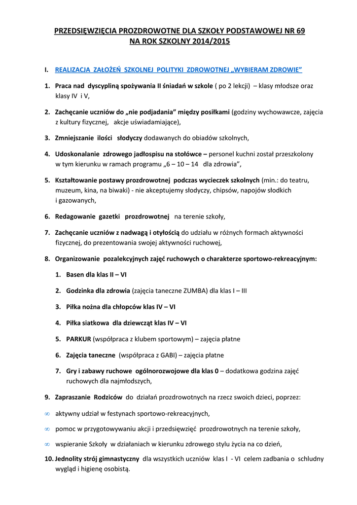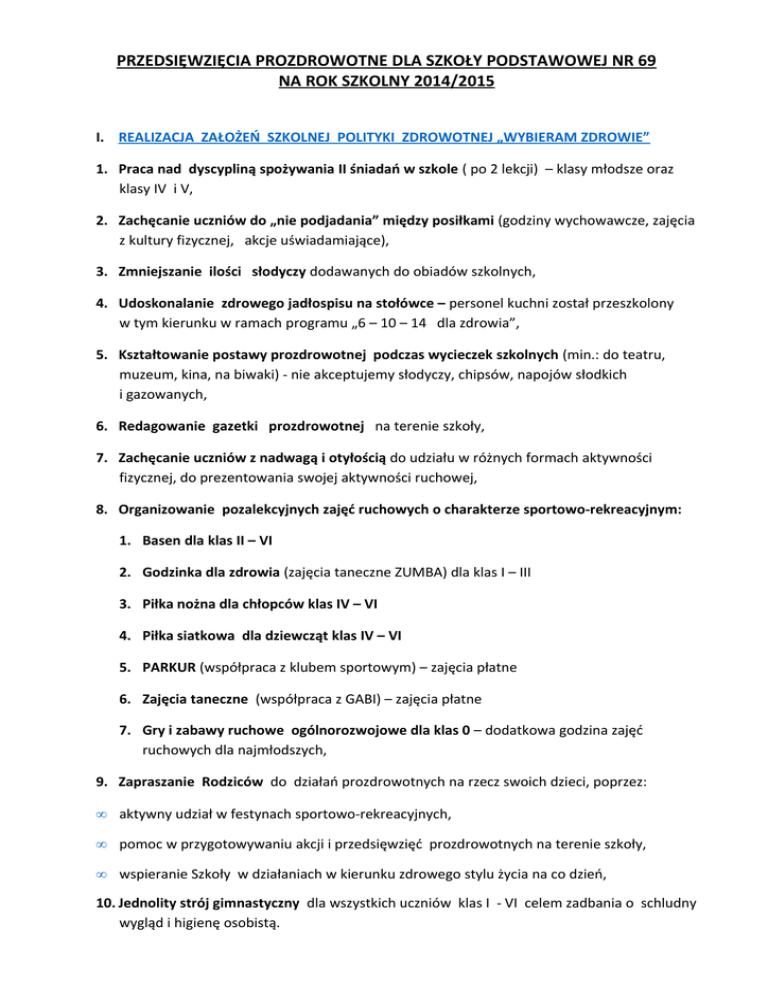 przedsięwzięcia prozdrowotne dla szkoły podstawowej nr 69 na rok