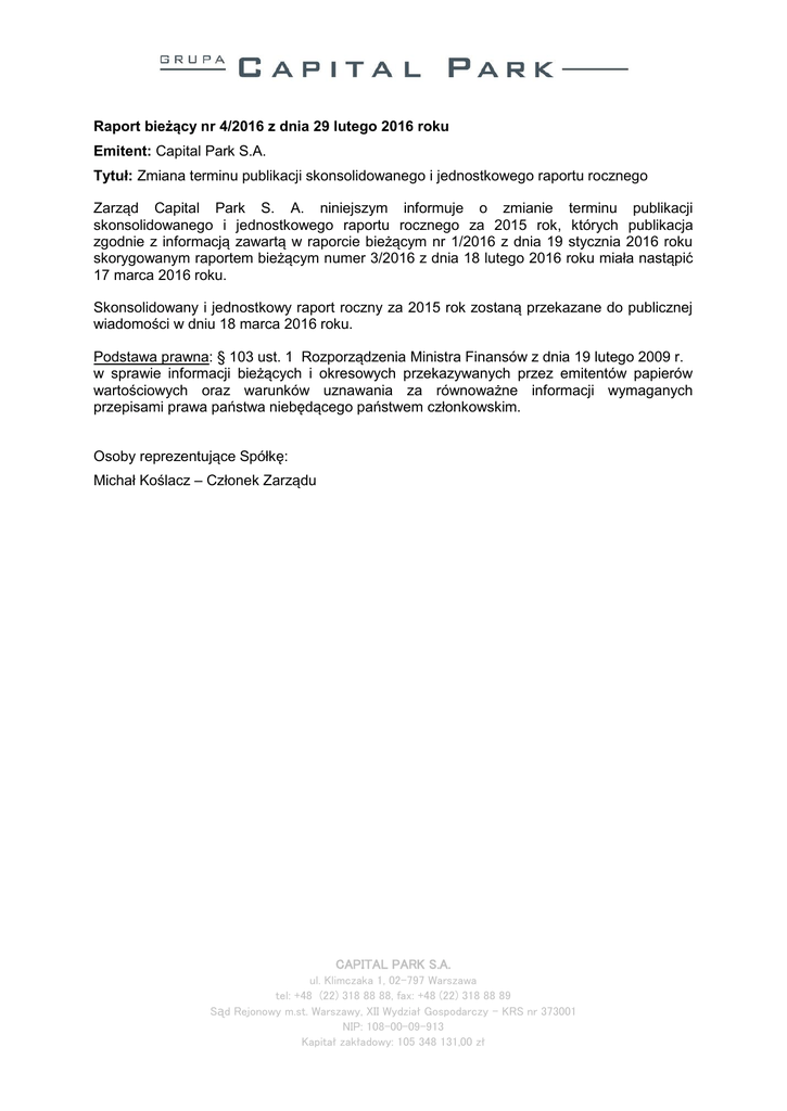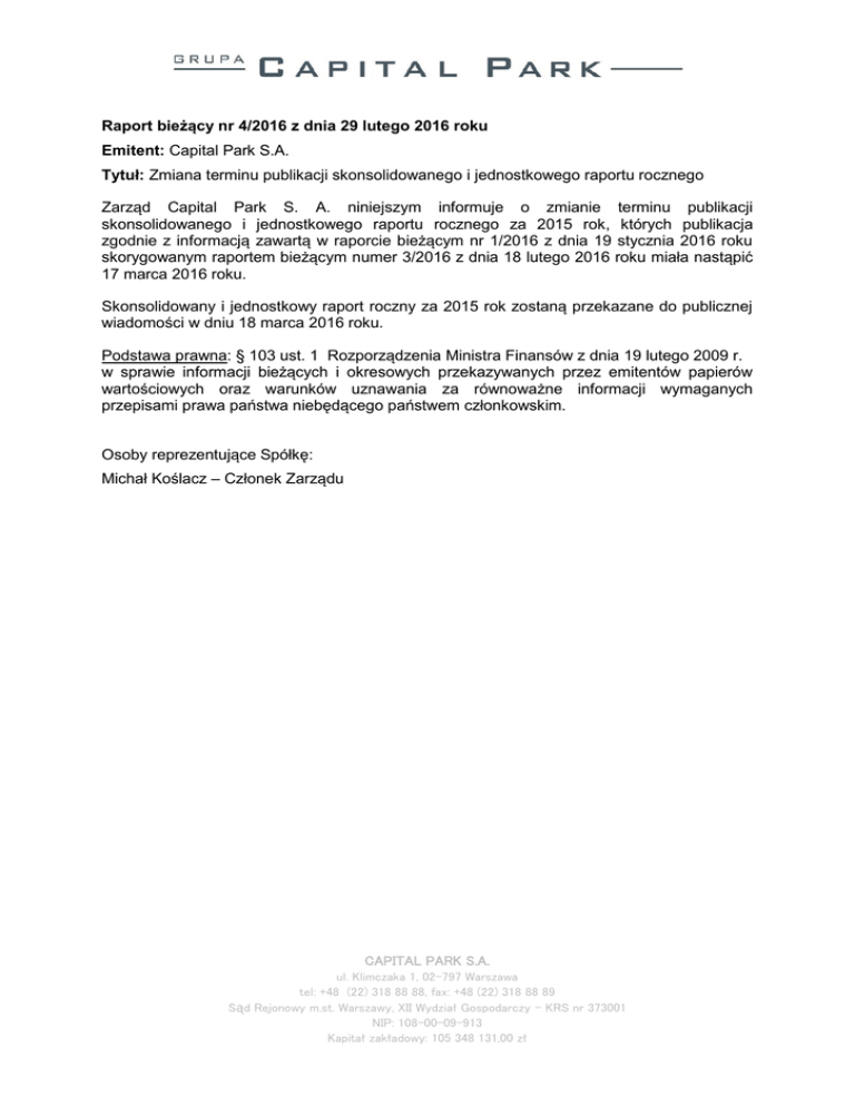 Raport bieżący nr 4/2016 z dnia 29 lutego 2016 roku Emitent: Capital Park S.A. Tytuł: Zmiana terminu publikacji skonsolidowanego i jednostkowego raportu rocznego Zarząd Capital Park S. A. niniejszym informuje o zmianie terminu publikacji skonsolidowanego i jednostkowego raportu rocznego za 2015 rok, których publikacja zgodnie z informacją zawartą w raporcie bieżącym nr 1/2016 z dnia 19 stycznia 2016 roku skorygowanym raportem bieżącym numer 3/2016 z dnia 18 lutego 2016 roku miała nastąpić 17 marca 2016 roku. Skonsolidowany i jednostkowy raport roczny za 2015 rok zostaną przekazane do publicznej wiadomości w dniu 18 marca 2016 roku. Podstawa prawna: § 103 ust. 1 Rozporządzenia Ministra Finansów z dnia 19 lutego 2009 r. w sprawie informacji bieżących i okresowych przekazywanych przez emitentów papierów wartościowych oraz warunków uznawania za równoważne informacji wymaganych przepisami prawa państwa niebędącego państwem członkowskim. Osoby reprezentujące Spółkę: Michał Koślacz – Członek Zarządu CAPITAL PARK S.A. ul. Klimczaka 1, 02-797 Warszawa tel: +48 (22) 318 88 88, fax: +48 (22) 318 88 89 Sąd Rejonowy m.st. Warszawy, XII Wydział Gospodarczy - KRS nr 373001 NIP: 108-00-09-913 Kapitał zakładowy: 105 348 131,00 zł