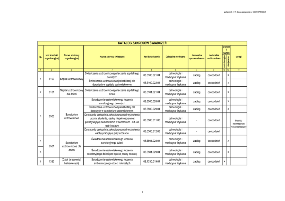 załącznik nr 1 do zarządzenia nr 59/2007/DSOZ KATALOG ZAKRESÓW ŚWIADCZEŃ Nazwa struktury organizacyjnej Nazwa zakresu świadczeń kod świadczenia 1 2 3 4 5 1 2 3 6100 6101 Szpital uzdrowiskowy Świadczenia uzdrowiskowego leczenia szpitalnego dla dzieci dzieci 6500 Świadczenia uzdrowiskowego leczenia sanatoryjnego dorosłych Świadczenia uzdrowiskowej rehabilitacji dla dorosłych w sanatorium uzdrowiskowym Dopłata do osobodnia zakwaterowania i wyżywienia ucznia, studenta, osoby niepełnosprawnej przebywającej samodzielnie w sanatorium - art. 33 ust.4 ustawy Dopłata do osobodnia zakwaterowania i wyżywienia osoby pracującej przy azbeście 4 6501 5 6 Świadczenia uzdrowiskowego leczenia szpitalnego dorosłych Szpital uzdrowiskowy Świadczenia uzdrowiskowej rehabilitacji dla dorosłych w szpitalu uzdrowiskowym 1330 Sanatorium uzdrowiskowe Sanatorium uzdrowiskowe dla dzieci (Dział (pracownia) balneoterapii) 08.6100.021.04 08.6100.022.04 08.6101.021.04 08.6500.028.04 08.6500.029.04 Dziedzina medyczna Jednostka sprawozdawcza Jednostka rozliczeniowa 6 7 8 zabieg osobodzień X zabieg osobodzień x zabieg osobodzień X zabieg osobodzień X zabieg osobodzień X balneologia i medycyna fizykalna balneologia i medycyna fizykalna balneologia i medycyna fizykalna balneologia i medycyna fizykalna balneologia i medycyna fizykalna stacjonarne kod komórki organizacyjnej ambulatoryjne lp. warunk i wykon 10 13 08.6500.311.03 balneologia i medycyna fizykalna - osobodzień 08.6500.312.03 balneologia i medycyna fizykalna - osobodzień Świadczenia uzdrowiskowego leczenia sanatoryjnego dzieci 08.6501.028.04 balneologia i medycyna fizykalna zabieg osobodzień X Świadczenia uzdrowiskowego leczenia sanatoryjnego dzieci pod opieką osoby dorosłej 08.6501.029.04 balneologia i medycyna fizykalna zabieg osobodzień X Świadczenia uzdrowiskowego leczenia ambulatoryjnego dzieci i dorosłych 08.1330.019.04 balneologia i medycyna fizykalna zabieg osobodzień 1 uwagi 14 Produkt nielimitowany niekontraktowany X