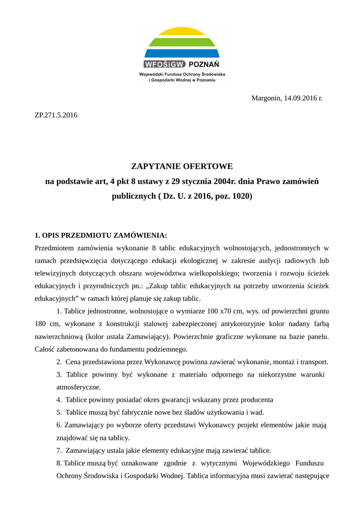 Margonin, 14.09.2016 r. ZP.271.5.2016 ZAPYTANIE OFERTOWE na podstawie art, 4 pkt 8 ustawy z 29 stycznia 2004r. dnia Prawo zamówień publicznych ( Dz. U. z 2016, poz. 1020) 1. OPIS PRZEDMIOTU ZAMÓWIENIA: Przedmiotem zamówienia wykonanie 8 tablic edukacyjnych wolnostojących, jednostronnych w ramach przedsięwzięcia dotyczącego edukacji ekologicznej w zakresie audycji radiowych lub telewizyjnych dotyczących obszaru województwa wielkopolskiego; tworzenia i rozwoju ścieżek edukacyjnych i przyrodniczych pn.: „Zakup tablic edukacyjnych na potrzeby utworzenia ścieżek edukacyjnych” w ramach której planuje się zakup tablic. 1. Tablice jednostronne, wolnostojące o wymiarze 100 x70 cm, wys. od powierzchni gruntu 180 cm, wykonane z konstrukcji stalowej zabezpieczonej antykorozyjnie kolor nadany farbą nawierzchniową (kolor ustala Zamawiający). Powierzchnie graficzne wykonane na bazie panelu. Całość zabetonowana do fundamentu podziemnego. 2. Cena przedstawiona przez Wykonawcę powinna zawierać wykonanie, montaż i transport. 3. Tablice powinny być wykonane z materiału odpornego na niekorzystne warunki atmosferyczne. 4. Tablice powinny posiadać okres gwarancji wskazany przez producenta 5. Tablice muszą być fabrycznie nowe bez śladów użytkowania i wad. 6. Zamawiający po wyborze oferty przedstawi Wykonawcy projekt elementów jakie mają znajdować się na tablicy. 7. Zamawiający ustala jakie elementy edukacyjne mają zawierać tablice. 8. Tablice muszą być oznakowane zgodnie z wytycznymi Wojewódzkiego Funduszu Ochrony Środowiska i Gospodarki Wodnej. Tablica informacyjna musi zawierać następujące elementy nazwę Beneficjenta,logo WFOŚiGW oraz informację o treści: Przedsięwzięcie pn. ”Zakup tablic edukacyjnych na potrzeby utworzenia ścieżek edukacyjnych. ” zrealizowano przy wsparciu finansowym Wojewódzkiego Funduszu Ochrony Środowiska i Gospodarki Wodnej w Poznaniu II. MIEJSCE REALIZACJI ZADANIA: Wykonane tablice będą posadowione w miejscu, które wskaże Zamawiający. Tablice będą ustawione przy lokalnych ścieżkach rowerowych znajdujących się na terenie Gminy Margonin. IV. TERMIN WYKONANIA ZAMÓWIENIA: 31 październik 2016 r. V. CZAS OBOWIĄZUJĄCEJ OFERTY Oferta będzie ważna przez okres 30 dni. VI. PRZYGOTOWANIE OFERTY: Wykonawca przedstawi swoją ofertę na formularzu, który stanowi załącznik nr 1. VII. Kryterium oceny ofert. Cena – 100% VIII. SKŁADANIE I TERMIN OFERTY: Wykonawca zobowiązuje się przesłać ofertę na wskazanym formularzu do dnia 10 października 2016 r. do godziny 9.00 drogą elektroniczną na adres: [email protected] bądź faxem na nr 67 28 47 272. IX. KONTAKT I ZAPYTANIA: Wszelkie zapytania związane z ofertą należy kierować pod nr telefonu 67 35 41 333
