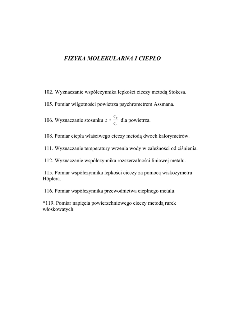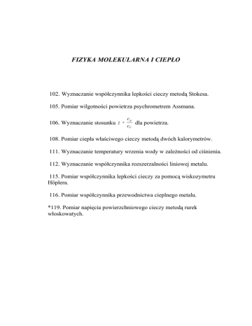 FIZYKA MOLEKULARNA I CIEPŁO 102. Wyznaczanie współczynnika lepkości cieczy metodą Stokesa. 105. Pomiar wilgotności powietrza psychrometrem Assmana. 106. Wyznaczanie stosunku χ = cp cV dla powietrza. 108. Pomiar ciepła właściwego cieczy metodą dwóch kalorymetrów. 111. Wyznaczanie temperatury wrzenia wody w zależności od ciśnienia. 112. Wyznaczanie współczynnika rozszerzalności liniowej metalu. 115. Pomiar współczynnika lepkości cieczy za pomocą wiskozymetru Höplera. 116. Pomiar współczynnika przewodnictwa cieplnego metalu. *119. Pomiar napięcia powierzchniowego cieczy metodą rurek włoskowatych. MECHANIKA 201. Pomiar gęstości ciał stałych za pomocą aerometru Nicholsona. 205. Wyznaczanie przyspieszenia ziemskiego za pomocą wahadła rewersyjnego. 206. Sprawdzenie twierdzenia Steinera za pomocą wahadła fizycznego. 207. Wyznaczanie momentu bezwładności brył przy użyciu wahadła torsyjnego. *208. Wyznaczanie momentu bezwładności za pomocą przyrządu Hartle’a. *209. Wyznaczanie częstotliwości drgań widełek stroikowych za pomocą rury Quinckego. *210. Wyznaczanie prędkości głosu za pomocą interferometru Quinckego. *214. Sprawdzanie podstawowego równania ruchu obrotowego. *215. Badanie drgań tłumionych cewki galwanometru lusterkowego. 217. Pomiar prędkości dźwięku i modułu Younga w ciałach stałych. 220. Wyznaczanie współczynnika tarcia tocznego za pomocą wahadła nachylnego. 222. Czas zderzenia kul- sprawdzenie wzoru Hertza. *224. Pomiar prędkości grawitacyjnych fal wodnych. ELEKTRYCZNOŚĆ I ELEMENTY FIZYKI WSPÓŁCZESNEJ 301. Pomiar oporu omowego mostkiem Wheatstone’a. 303. Wyznaczanie charakterystyki temperaturowej oporu metali i półprzewodników. 304. Cechowanie termopary. *305. Pomiar SEM metodą kompensacji. 308. Wyznaczanie równoważnika elektrochemicznego miedzi oraz stałej Faraday’a. 311. Wyznaczanie charakterystyki tranzystora. 312. Pomiar prędkości termoelektronów metodą pola hamującego. 314. Rezonans napięć. 315. Wyznaczanie pojemności za pomocą drgań relaksacyjnych. *319. Pomiar własności ferromagnetyków na podstawie pętli histerezy magnetycznej. *320. Pomiar pracy wyjścia termoelektronów. *321. Wyznaczanie przerwy energetycznej w półprzewodniku. 322. Badanie charakterystyk hallotronu. 325. Badanie charakterystyki licznika Geigera-Müllera. 350. Pomiar oporu przewodników. 351. Wyznaczanie pola magnetycznego Ziemi. 352. Badanie charakterystyk transformatora. 353. Wyznaczanie pola radiacyjnego anteny mikrofalowej. 355. Pomiar stosunku e/m dla elektronu. OPTYKA 401. Wyznaczanie współczynnika załamania światła za pomocą refraktometru Abbego. *402. Jakościowe sprawdzenie praw promieniowania za pomocą pirometru optycznego. 403. Pomiar ogniskowej soczewki przy użyciu ławy optycznej. 407. Analiza widma. *409. Wyznaczanie stężenia roztworu za pomocą kolorymetru fotoelektrycznego „SPEKOL". 412. Wyznaczanie stężenia roztworu cukru za pomocą polarymetru półcieniowego. *413. Wyznaczanie długości fali świetlnej za pomocą siatki dyfrakcyjnej. 414. Badanie fotokomórki gazowanej. *417. Wyznaczanie długości fali świetlnej za pomocą pierścieni Newtona. 450. Pomiar współczynnika załamania gazu za pomocą interferometru Michelsona. 451. Wyznaczanie długości fali światła za pomocą interferometru Michelsona. 452. Pomiar prędkości światła w powietrzu i cieczy. • Instrukcje do wszystkich ćwiczeń oraz omówienie ćwiczeń oznaczonych gwiazdką można znaleźć w Internecie pod adresem: http://labor.zut.edu.pl/