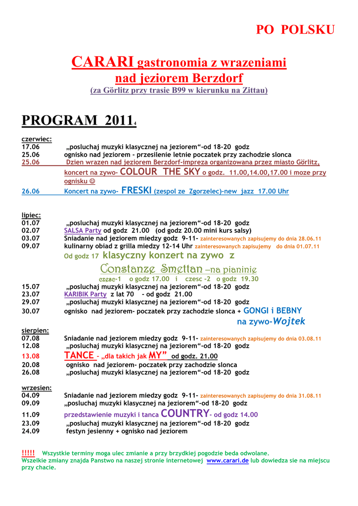 PO POLSKU CARARI gastronomia z wrazeniami nad jeziorem Berzdorf (za Görlitz przy trasie B99 w kierunku na Zittau) PROGRAM 2011 czerwiec: 17.06 25.06 25.06 4 „posluchaj muzyki klasycznej na jeziorem“-od 18-20 godz ognisko nad jeziorem - przesilenie letnie poczatek przy zachodzie slonca Dzien wrazen nad jeziorem Berzdorf-impreza organizowana przez miasto Görlitz, koncert na zywoognisku ☺ COLOUR THE SKY o godz. 26.06 Koncert na zywo- FRESKI (zespol ze lipiec: 01.07 02.07 03.07 09.07 „posluchaj muzyki klasycznej na jeziorem“-od 18-20 godz SALSA Party od godz 21.00 (od godz 20.00 mini kurs salsy) Sniadanie nad jeziorem miedzy godz 9-11- zainteresowanych zapisujemy do dnia 28.06.11 kulinarny obiad z grilla miedzy 12-14 Uhr zainteresowanych zapisujemy do dnia 01.07.11 Od godz 17 11.00,14.00,17.00 i moze przy Zgorzelec)–new jazz 17.00 Uhr klasyczny konzert na zywo z Constanze Smet Smettan –na pianinie 15.07 23.07 29.07 30.07 czesc-1 o godz 17.00 i czesc -2 o godz 19.30 czesc „posluchaj muzyki klasycznej na jeziorem“-od 18-20 godz KARIBIK Party z lat 70 - od godz 21.00 „posluchaj muzyki klasycznej na jeziorem“-od 18-20 godz ognisko nad jeziorem- poczatek przy zachodzie slonca + GONGI sierpien: 07.08 12.08 Sniadanie nad jeziorem miedzy godz 9-11- zainteresowanych zapisujemy do dnia 03.08.11 „posluchaj muzyki klasycznej na jeziorem“-od 18-20 godz 13.08 20.08 26.08 i BEBNY na zywo-Wojtek TANCE – „dla takich jak MY” od godz. 21.00 ognisko nad jeziorem- poczatek przy zachodzie slonca „posluchaj muzyki klasycznej na jeziorem“-od 18-20 godz wrzesien: 04.09 09.09 Sniadanie nad jeziorem miedzy godz 9-11- zainteresowanych zapisujemy do dnia 31.08.11 „posluchaj muzyki klasycznej na jeziorem“-od 18-20 godz 11.09 23.09 24.09 przedstawienie muzyki i tanca - od godz 14.00 „posluchaj muzyki klasycznej na jeziorem“-od 18-20 godz festyn jesienny + ognisko nad jeziorem COUNTRY !!!!! Wszystkie terminy moga ulec zmianie a przy brzydkiej pogodzie beda odwolane. Wszelkie zmiany znajda Panstwo na naszej stronie internetowej www.carari.de lub dowiedza sie na miejscu przy chacie.