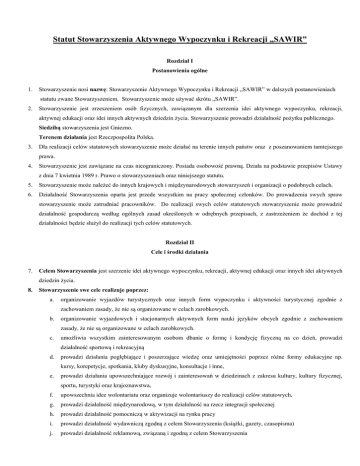 Statut Stowarzyszenia Aktywnego Wypoczynku i Rekreacji „SAWIR” Rozdział I Postanowienia ogólne 1. Stowarzyszenie nosi nazwę: Stowarzyszenie Aktywnego Wypoczynku i Rekreacji „SAWIR” w dalszych postanowieniach statutu zwane Stowarzyszeniem. Stowarzyszenie może używać skrótu „SAWIR”. 2. Stowarzyszenie jest zrzeszeniem osób fizycznych, zawiązanym dla szerzenia idei aktywnego wypoczynku, rekreacji, aktywnej edukacji oraz idei innych aktywnych dziedzin życia. Stowarzyszenie prowadzi działalność pożytku publicznego. Siedzibą stowarzyszenia jest Gniezno. Terenem działania jest Rzeczpospolita Polska. 3. Dla realizacji celów statutowych stowarzyszenie może działać na terenie innych państw oraz z poszanowaniem tamtejszego prawa. 4. Stowarzyszenie jest zawiązane na czas nieograniczony. Posiada osobowość prawną. Działa na podstawie przepisów Ustawy z dnia 7 kwietnia 1989 r. Prawo o stowarzyszeniach oraz niniejszego statutu. 5. Stowarzyszenie może należeć do innych krajowych i międzynarodowych stowarzyszeń i organizacji o podobnych celach. 6. Działalność Stowarzyszenia oparta jest przede wszystkim na pracy społecznej członków. Do prowadzenia swych spraw stowarzyszenie może zatrudniać pracowników. Do realizacji swych celów statutowych stowarzyszenie może prowadzić działalność gospodarczą według ogólnych zasad określonych w odrębnych przepisach, z zastrzeżeniem że dochód z tej działalności będzie służył do realizacji tych celów statutowych. Rozdział II Cele i środki działania 7. Celem Stowarzyszenia jest szerzenie idei aktywnego wypoczynku, rekreacji, aktywnej edukacji oraz innych idei aktywnych dziedzin życia. 8. Stowarzyszenie swe cele realizuje poprzez: a. organizowanie wyjazdów turystycznych oraz innych form wypoczynku i aktywności turystycznej zgodnie z zachowaniem zasady, że nie są organizowane w celach zarobkowych. b. organizowanie wyjazdowych i stacjonarnych aktywnych form nauki języków obcych zgodnie z zachowaniem zasady, że nie są organizowane w celach zarobkowych. c. umożliwia wszystkim zainteresowanym osobom dbanie o formę i kondycję fizyczną na co dzień, prowadzi działalność sportową i rekreacyjną d. prowadzi działania pogłębiające i poszerzające wiedzę oraz umiejętności poprzez różne formy edukacyjne np. kursy, korepetycje, spotkania, kluby dyskusyjne, konsultacje i inne, e. prowadzi działania upowszechniające rozwój i zainteresowań w dziedzinach z zakresu kultury, kultury fizycznej, sportu, turystyki oraz krajoznawstwa, f. upowszechnia idee wolontariatu oraz organizuje wolontariuszy do realizacji celów statutowych, g. prowadzi działalność międzynarodową, w tym działalność na rzecz integracji społecznej h. prowadzi działalność pomocniczą w aktywizacji na rynku pracy i. prowadzi działalność wydawniczą zgodną z celem Stowarzyszenia (książki, gazety, czasopisma) j. prowadzi działalność reklamową, związaną i zgodną z celem Stowarzyszenia Rozdział III Członkowie – prawa i obowiązki 9. Członkami Stowarzyszenia mogą być osoby fizyczne i prawne. Osoba prawna może być jedynie członkiem wspierającym Stowarzyszenia. 10. Stowarzyszenie posiada członków: a. zwyczajnych b. zwyczajnych tymczasowych c. wspierających 11. Członkiem zwyczajnym Stowarzyszenia może być każda osoba fizyczna, która: a. Złoży deklarację członkowską na piśmie, w przypadku osób małoletnich (do 16 lat) dodatkowo wymagana jest zgoda przedstawicieli ustawowych b. Zapłaci składkę, której wysokość ustala Zarząd Stowarzyszenia 12. Członkiem zwyczajnym tymczasowym staje się po złożeniu pisemnej deklaracji członkowskiej na podstawie uchwały Zarządu Stowarzyszenia. Członkiem tymczasowym można być maksymalnie 1 miesiąc. 13. Członkiem zwyczajnym staje się po złożeniu pisemnej deklaracji członkowskiej oraz wpłacie składek członkowskich. 14. Członkiem wspierającym Stowarzyszenie może zostać osoba fizyczna i prawna deklarująca pomoc finansową, rzeczową lub merytoryczną w realizacji celów Stowarzyszenia. 15. Członkiem wspierającym staje się po złożeniu pisemnej deklaracji na podstawie uchwały Zarządu. 16. Członkowie zwyczajni mają prawo: a. biernego i czynnego uczestniczenia w wyborach do władz Stowarzyszenia, b. korzystania z dorobku, majątku i wszelkich form działalności Stowarzyszenia, c. udziału w zebraniach, wykładach, formach aktywności oraz imprezach organizowanych przez Stowarzyszenie, d. zgłaszania wniosków co do działalności Stowarzyszenia, 17. Członkowie zwyczajni mają obowiązek: a. brania udziału w działalności Stowarzyszenia i realizacji jego celów, b. przestrzegania statutu i uchwał władz Stowarzyszenia, c. regularnego opłacania składek. 18. Członkowie wspierający nie posiadają biernego oraz czynnego prawa wyborczego, mogą jednak brać udział z głosem doradczym w statutowych władzach Stowarzyszenia, poza tym posiadają takie prawa jak członkowie zwyczajni. 19. Członek wspierający ma obowiązek wywiązywania się z zadeklarowanych świadczeń, przestrzegania statutu oraz uchwał władz Stowarzyszenia 20. Utrata członkostwa następuje na skutek: a. pisemnej rezygnacji złożonej na ręce Zarządu, b. wykluczenia przez Zarząd: z powodu łamania statutu i nieprzestrzegania uchwał władz Stowarzyszenia, z powodu notorycznego niebrania udziału w pracach Stowarzyszenia, z powodu niepłacenia składek za okres minimum 30 dni c. utraty praw obywatelskich na mocy prawomocnego wyroku sądu, d. śmierci członka oraz utraty osobowości prawnej przez osoby prawne. 21. Od uchwały Zarządu w sprawie przyjęcia w poczet członków stowarzyszenia lub pozbawienia członkostwa zainteresowanemu przysługuje odwołanie do Walnego Zgromadzenia Członków. Uchwała walnego zgromadzenia członków jest ostateczna. Rozdział IV Władze Stowarzyszenia 22. Władzami Stowarzyszenia są: a. Walne Zgromadzenie Członkó