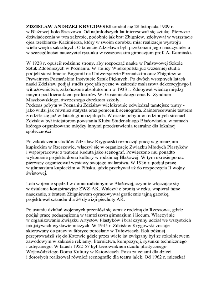 ZDZISŁAW ANDRZEJ KRYGOWSKI urodził się 28 listopada 1909 r. w Błażowej koło Rzeszowa. Od najmłodszych lat interesował się sztuką. Pierwsze doświadczenia w tym zakresie, podobnie jak brat Zbigniew, zdobywał w warsztacie ojca rzeźbiarza- Kazimierza, który w swoim dorobku miał realizacje wystroju wielu wnętrz sakralnych. O talencie Zdzisława byli przekonani jego nauczyciele, a w szczególności nauczyciel rysunku w rzeszowskim gimnazjum prof. A. Kamiński. W 1928 r. opuścił rodzinne strony, aby rozpocząć naukę w Państwowej Szkole Sztuk Zdobniczych w Poznaniu. W stolicy Wielkopolski już wcześniej studia podjęli starsi bracia: Bogumił na Uniwersytecie Poznańskim oraz Zbigniew w Prywatnym Poznańskim Instytucie Sztuk Pięknych. Po dwóch wstępnych latach nauki Zdzisław podjął studia specjalistyczne w zakresie malarstwa dekoracyjnego i witrażownictwa, zakończone absolutorium w 1933 r. Zdobywał wiedzę między innymi pod kierunkiem profesorów W. Gosienieckiego oraz K. Zyndram Maszkowskiego, ówczesnego dyrektora szkoły. Podczas pobytu w Poznaniu Zdzisław wielokrotnie odwiedzał tamtejsze teatry jako widz, jak również statysta oraz pomocnik scenografa. Zainteresowanie teatrem zrodziło się już w latach gimnazjalnych. W czasie pobytu w rodzinnych stronach Zdzisław był inicjatorem powstania Klubu Studenckiego Błażowianka, w ramach którego organizowano między innymi przedstawienia teatralne dla lokalnej społeczności. Po zakończeniu studiów Zdzisław Krygowski rozpoczął pracę w gimnazjum kupieckim w Rzeszowie, włączył się w organizację Związku Młodych Plastyków i współpracował z teatrem Reduta jako scenograf. Powierzono mu ponadto wykonanie projektu domu kultury w rodzinnej Błażowej. W tym okresie po raz pierwszy organizował wystawy swojego malarstwa. W 1936 r. podjął pracę w gimnazjum kupieckim w Pińsku, gdzie przebywał aż do rozpoczęcia II wojny światowej. Lata wojenne spędził w domu rodzinnym w Błażowej, czynnie włączając się w działania konspiracyjne ZWZ-AK. Walczył z bronią w ręku, wspierał tajne nauczanie, z bratem Zbigniewem opracowywał graficznie tajną gazetkę, projektował sztandar dla 24 dywizji piechoty AK. Po ustaniu działań wojennych przeniósł się wraz z rodziną do Rzeszowa, gdzie podjął pracę pedagogiczną w tamtejszym gimnazjum i liceum. Włączył się w organizowanie Związku Artystów Plastyków i brał czynny udział we wszystkich inicjatywach wystawienniczych. W 1945 r. Zdzisław Krygowski zostaje skierowany do pracy w fabryce porcelany w Tułowicach. Rok później przeprowadził się do Katowic gdzie przez wiele lat związany był ze szkolnictwem zawodowym w zakresie reklamy, liternictwa, kompozycji, rysunku technicznego i odręcznego. W latach 1952-57 był kierownikiem działu plastycznego Wojewódzkiego Domu Kultury w Katowicach. Poza zajęciami dla dzieci i dorosłych realizował również scenografie dla teatru lalek. Od 1962 r. mieszkał w Sosnowcu. Zdzisław Krygowski aktywnie uczestniczył w pracach ZPAP w Katowicach oraz oddziału ZPAP w Sosnowcu Grupa Zagłębie. REALIZACJE I WYSTAWY: 1933 r. - Muzeum Przemysłowe, Rzeszów- malarstwo (z bratem Zbigniewem) 1944 r. - wystawa Związku Artystów Plastyków, Rzeszów (wyróżnienie) 1944 r. - realizacja projektów witraży do kościoła farnego w Rzeszowie 1945 r. - wystawa wiosenna ZAP, Rzeszów (I nagroda) 1946 r. - Teatr Ziemi Rzeszowskiej, festiwal sztuki (II nagroda) 1947 r. - wystawa wiosenna ZAP, Rzeszów (II nagroda) 1949 r. - wystawa malarstwa, grafiki i rzeźby Okręgu Śląsko-Dąbrowskiego, Katowice (wyróżnienie) 1954 r. - 1957r., 1958r.,1959r.- wystawa ZPAP, BWA, Katowice 1956 r. - projekt witraża w kościele garnizonowym w Rzeszowie 1960 r. - wystawa poplenerowa, Wybrzeże Darłowskie, Koszalin 1961 r. - 1966 r.-okręgowa wystawa malarstwa, grafiki i rzeźby, BWA, Katowice 1962 r. - wystawa indywidualna- malarstwo, akwarele, BWA Gliwice 1962 r. - Polskie Dzieło Plastyczne w XV-lecie PRL, Warszawa 1963 r. - 1964r., 1965r.- wystawy indywidualne - malarstwo, Sosnowiec 1967 r. - 1975r.- wystawa jubileuszowa Grupy Zagłębie, BWA Katowice 1972 r. - wystawa Grupy Zagłębie, Sopot 1974 r. - wystawa Grupy Zagłębie, Lublin 1972 r. - 1973r.-I,II Targi Plastyki, Katowice 1974 r. - I Częstochowskie Targi Plastyki 1972 r. - Salon Katowicki, wystawa okręgowa, Katowice 1974 r. - Muzeum Ziemi Krośnieńskiej, malarstwo 1975 r. - Motywy Wiejskie w Polskim Malarstwie Współczesnym, Bydgoszcz Jubileuszowa wystawa malarstwa Zdzisława Krygowskiego, wraz z J. Gielniakiem, Wł. Łozowskim, Dom Sztuki w Rzeszowie, 29 I 1981 r. Błażowiacy, wystawa twórczości Zbigniewa Krygowskiego, Zdzisława Krygowskiego, Władysława Początka, BWA Rzeszów 1984 r. 40 lat twórczości artystów plastyków województwa katowickiego, BWA Katowice 1985 r. Wystawa Grupy Zagłębie z okazji 40-lecia wyzwolenia Sosnowca, Sosnowiec, BWA Katowice 1985 r. Zdzisław Krygowski uczestniczył wielokrotnie w plenerach malarskich między innymi w Darłówku, Płocku, Opatowie. Prace jego często prezentowane były na wystawach poplenerowych w Koszalinie, Sosnowcu i Dąbrowie Górniczej. Najczęściej stosowaną przez niego techniką była akwarela. Bibliografia: Katalogi: Zdzisław Andrzej Krygowski, Malarstwo, BWA Rzeszów 1981 r. (życiorys, 6 reprodukcji, spis prac 100 akwarel) Obraz naszych dni, wystawa twórczości środowiska rzeszowskiego z okazji 40-lecia PRL, BWA Rzeszów 1984 r. (notka biograficzna, 1 reprodukcja) Błażowiacy, wystawa twórczości Zbigniewa Krygowskiego, Zdzisława Krygowskiego, Władysława Początka, BWA Rzeszów 1984 r. (notka biograficzna, 4 reprodukcje) 40 lat twórczości artystów plastyków województwa katowickiego, BWA Katowice 1985 r. (1 reprodukcja) Plastycy Sosnowca, Sosnowiec 1991 r. (notka biograficzna, 1 reprodukcja) Recenzje, artykuły prasowe: Zdzisław Krygowski, Wspomnienia w: Barwa i rysunek, gazetka s