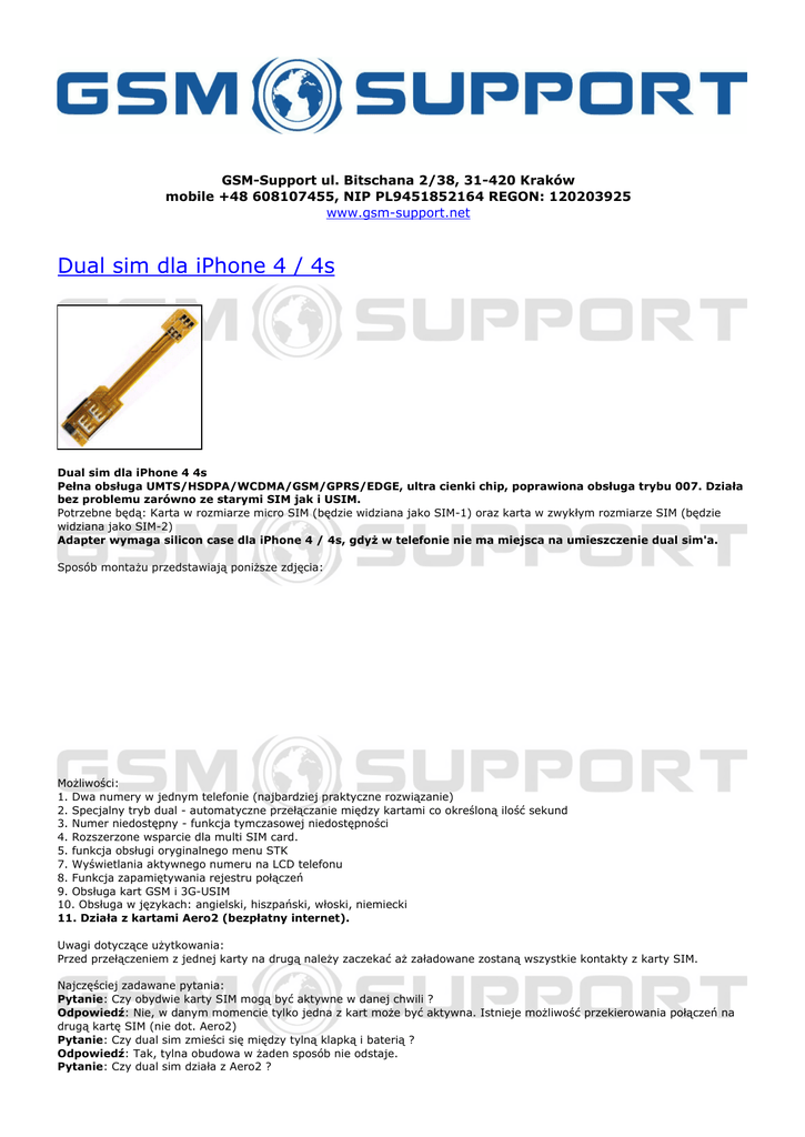 GSM-Support ul. Bitschana 2/38, 31-420 Kraków mobile +48 608107455, NIP PL9451852164 REGON: 120203925 www.gsm-support.net Dual sim dla iPhone 4 / 4s Dual sim dla iPhone 4 4s Pełna obsługa UMTS/HSDPA/WCDMA/GSM/GPRS/EDGE, ultra cienki chip, poprawiona obsługa trybu 007. Działa bez problemu zarówno ze starymi SIM jak i USIM. Potrzebne będą: Karta w rozmiarze micro SIM (będzie widziana jako SIM-1) oraz karta w zwykłym rozmiarze SIM (będzie widziana jako SIM-2) Adapter wymaga silicon case dla iPhone 4 / 4s, gdyż w telefonie nie ma miejsca na umieszczenie dual sim'a. Sposób montażu przedstawiają poniższe zdjęcia: Możliwości: 1. Dwa numery w jednym telefonie (najbardziej praktyczne rozwiązanie) 2. Specjalny tryb dual - automatyczne przełączanie między kartami co określoną ilość sekund 3. Numer niedostępny - funkcja tymczasowej niedostępności 4. Rozszerzone wsparcie dla multi SIM card. 5. funkcja obsługi oryginalnego menu STK 7. Wyświetlania aktywnego numeru na LCD telefonu 8. Funkcja zapamiętywania rejestru połączeń 9. Obsługa kart GSM i 3G-USIM 10. Obsługa w językach: angielski, hiszpański, włoski, niemiecki 11. Działa z kartami Aero2 (bezpłatny internet). Uwagi dotyczące użytkowania: Przed przełączeniem z jednej karty na drugą należy zaczekać aż załadowane zostaną wszystkie kontakty z karty SIM. Najczęściej zadawane pytania: Pytanie: Czy obydwie karty SIM mogą być aktywne w danej chwili ? Odpowiedź: Nie, w danym momencie tylko jedna z kart może być aktywna. Istnieje możliwość przekierowania połączeń na drugą kartę SIM (nie dot. Aero2) Pytanie: Czy dual sim zmieści się między tylną klapką i baterią ? Odpowiedź: Tak, tylna obudowa w żaden sposób nie odstaje. Pytanie: Czy dual sim działa z Aero2 ? Odpowiedź: Tak. Pytanie: Czy przy przełączaniu między kartami każdorazowo trzeba wprowadzać kod PIN danej karty ? Odpowiedź: Tak. W celu przyspieszenia przełączania należy wyłączyć blokady kodem PIN. Sposób montażu w telefonie 1. Przygotuj adapter i 2 karty SIM (SIM1 = micro sim, SIM2 = zwykły rozmiar SIM) . 2. Włóż kartę SIM (normalny rozmiar sim) do gniazda SIM2 w adapterze. 3. Włóż część SIM1 do gniazda micro sim w telefonie. 4. Załóż silicon case zawijając dual sim pod niego. Struktura i funkcje menu: 001 1. *SIM1 Switch to SIM 1 002 2. SIM2 Switch to SIM 2 3 NO. Hide (It will take a little more time to switch working with this function ) Not Connect (* stand for on ) Once turned on and after SIM1 switch to SIM2, if somebody call SIM 1, there will be system Indication that "the number you dial can not be connected for the moment, please dial again later" 004 4 NO. Edit (Edit title for online number) SIM1 -- Input the title for SIM 1 SIM2 -- Input the title for SIM2 005 5.2 SIM on-line (set the auto switch time) On -- Turn on this function *Off -- Turn off this function Time 1(02) -- Input online time for SIM1 Time 2(02) -- Input online time for SIM2 006 6 Language *English -- Language set to English Espaol -- Language set to Espaol Italiano -- Language set to Italiano Deutsch -- Language set to Deutsch 007 7 Dual Mode *STK Mode ---- Normal STK menu mode 007 Mode ---- Special 007 shortcut mode Under 007 Mode the Original STK menu will be remained ©2012 www.gsm-support.net Opis ten nie stanowi oferty w rozumieniu Kodeksu Cywilnego. GSM-Support zastrzega sobie prawo do możliwych błędów w opisie produktu. Prosimy o weryfikację z Państwa strony, a w razie wątpliwości o kontakt. GSM-Support ul. Bitschana 2/38 31-420 Kraków POLSKA tel. 608107455 e-mail: [email protected] Powered by TCPDF (www.tcpdf.org)