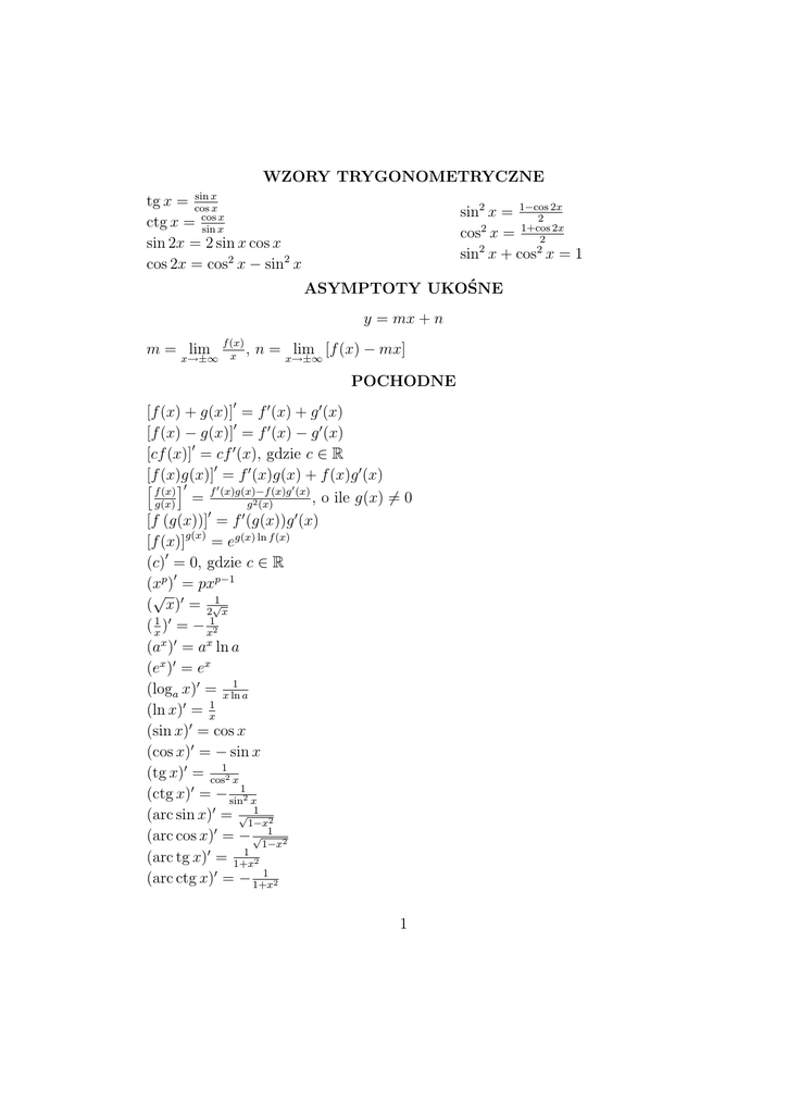 WZORY TRYGONOMETRYCZNE sin x tg x = cos x x ctg x = cos sin x 2x sin2 x = 1−cos 2 2x cos2 x = 1+cos 2 sin2 x + cos2 x = 1 sin 2x = 2 sin x cos x cos 2x = cos2 x − sin2 x ASYMPTOTY UKOŚNE y = mx + n m = lim x→±∞ f (x) , x n = lim [f (x) − mx] x→±∞ POCHODNE [f (x) + g(x)]0 = f 0 (x) + g 0 (x) [f (x) − g(x)]0 = f 0 (x) − g 0 (x) [cf (x)]0 = cf 0 (x), gdzie c ∈ R 0 [f (x)g(x)] = f 0 (x)g(x) + f (x)g 0 (x) h i0 0 f (x) (x)g 0 (x) = f (x)g(x)−f , o ile g(x) 6= 0 g(x) g 2 (x) 0 [f (g(x))] = f 0 (g(x))g 0 (x) [f (x)]g(x) = eg(x) ln f (x) (c)0 = 0, gdzie c ∈ R (xp )0 = pxp−1 √ ( x)0 = 2√1 x ( x1 )0 = − x12 (ax )0 = ax ln a (ex )0 = ex (loga x)0 = x ln1 a (ln x)0 = x1 (sin x)0 = cos x (cos x)0 = − sin x (tg x)0 = cos12 x (ctg x)0 = − sin12 x 1 (arc sin x)0 = √1−x 2 1 (arc cos x)0 = − √1−x 2 1 (arc tg x)0 = 1+x 2 1 (arc ctg x)0 = − 1+x 2 1