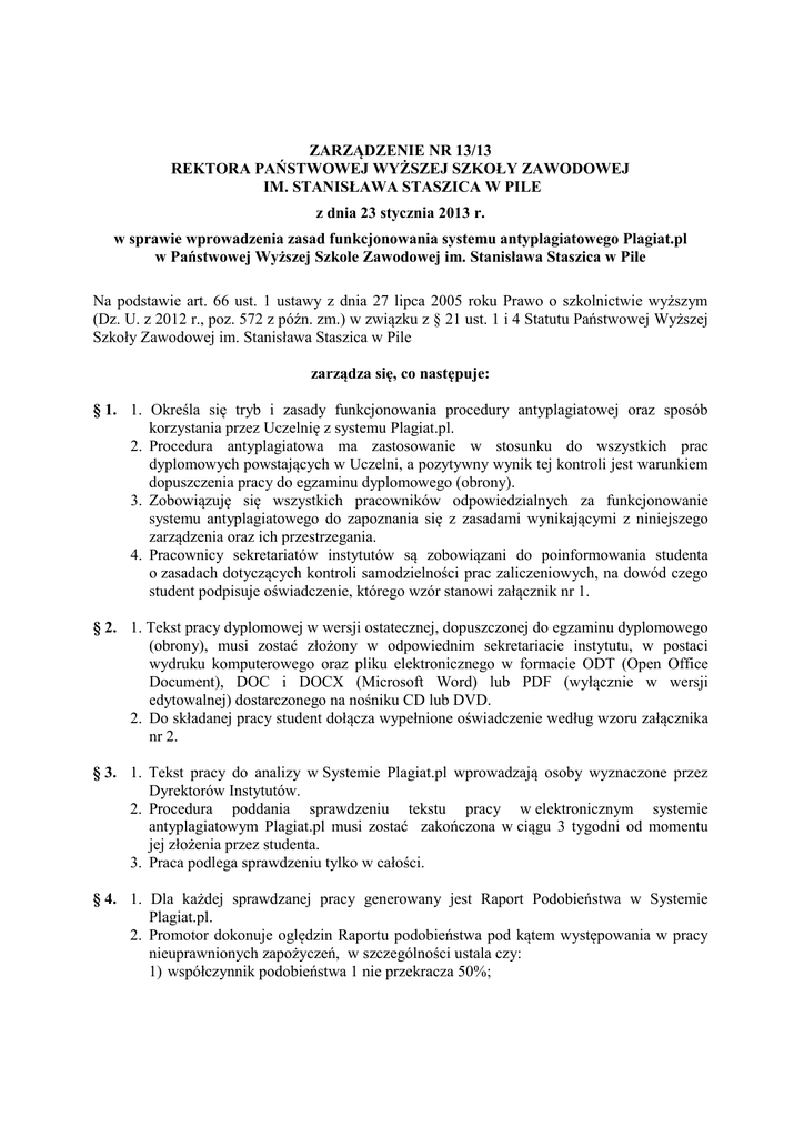 ZARZĄDZENIE NR 13/13 REKTORA PAŃSTWOWEJ WYŻSZEJ SZKOŁY ZAWODOWEJ IM. STANISŁAWA STASZICA W PILE z dnia 23 stycznia 2013 r. w sprawie wprowadzenia zasad funkcjonowania systemu antyplagiatowego Plagiat.pl w Państwowej Wyższej Szkole Zawodowej im. Stanisława Staszica w Pile Na podstawie art. 66 ust. 1 ustawy z dnia 27 lipca 2005 roku Prawo o szkolnictwie wyższym (Dz. U. z 2012 r., poz. 572 z późn. zm.) w związku z § 21 ust. 1 i 4 Statutu Państwowej Wyższej Szkoły Zawodowej im. Stanisława Staszica w Pile zarządza się, co następuje: § 1. 1. Określa się tryb i zasady funkcjonowania procedury antyplagiatowej oraz sposób korzystania przez Uczelnię z systemu Plagiat.pl. 2. Procedura antyplagiatowa ma zastosowanie w stosunku do wszystkich prac dyplomowych powstających w Uczelni, a pozytywny wynik tej kontroli jest warunkiem dopuszczenia pracy do egzaminu dyplomowego (obrony). 3. Zobowiązuję się wszystkich pracowników odpowiedzialnych za funkcjonowanie systemu antyplagiatowego do zapoznania się z zasadami wynikającymi z niniejszego zarządzenia oraz ich przestrzegania. 4. Pracownicy sekretariatów instytutów są zobowiązani do poinformowania studenta o zasadach dotyczących kontroli samodzielności prac zaliczeniowych, na dowód czego student podpisuje oświadczenie, którego wzór stanowi załącznik nr 1. § 2. 1. Tekst pracy dyplomowej w wersji ostatecznej, dopuszczonej do egzaminu dyplomowego (obrony), musi zostać złożony w odpowiednim sekretariacie instytutu, w postaci wydruku komputerowego oraz pliku elektronicznego w formacie ODT (Open Office Document), DOC i DOCX (Microsoft Word) lub PDF (wyłącznie w wersji edytowalnej) dostarczonego na nośniku CD lub DVD. 2. Do składanej pracy student dołącza wypełnione oświadczenie według wzoru załącznika nr 2. § 3. 1. Tekst pracy do analizy w Systemie Plagiat.pl wprowadzają osoby wyznaczone przez Dyrektorów Instytutów. 2. Procedura poddania sprawdzeniu tekstu pracy w elektronicznym systemie antyplagiatowym Plagiat.pl musi zostać zakończona w ciągu 3 tygodni od momentu jej złożenia przez studenta. 3. Praca podlega sprawdzeniu tylko w całości. § 4. 1. Dla każdej sprawdzanej pracy generowany jest Raport Podobieństwa w Systemie Plagiat.pl. 2. Promotor dokonuje oględzin Raportu podobieństwa pod kątem występowania w pracy nieuprawnionych zapożyczeń, w szczególności ustala czy: 1) współczynnik podobieństwa 1 nie przekracza 50%; 2) współczynnik podobieństwa 2 nie przekracza 5%; 3) próbowano ukryć obecność nieuprawnionych zapożyczeń („alert”). 3. Na podstawie analizy Raportu Podobieństwa Promotor w ciągu 48 godzin przygotowuje Protokół kontroli oryginalności pracy (którego wzór stanowi załącznik nr 3). § 5. 1. Jeżeli w wyniku oględzin Raportu podobieństwa, o których mowa w § 4, praca zostanie uznana za niebudzącą wątpliwości, Promotor podpisuje Protokół kontroli oryginalności pracy, przekazuje pracę do wprowadzenia do Bazy Systemu Plagiat.pl, a praca zostaje dopuszczona do obrony. 2. Jeżeli w wyniku oględzin Raportu Podobieństwa, według kryteriów wskazanych w § 4, Promotor uzna pracę za wymagającą dodatkowej oceny z punktu widzenia występowania niedopuszczalnych zapożyczeń, generuje Rozszerzony Raport Podobieństwa. § 6. 1. Promotor, na podstawie Rozszerzonego Raportu Podobieństwa przygotowuje opinię (według wzoru stanowiącego załącznik nr 4), w której ocenia czy praca, nie zawiera nieuprawnionych zapożyczeń (plagiat) lub czy zawarte w niej prawidłowo oznaczone zapożyczenia (cytaty) nie budzą wątpliwości co do samodzielności pracy dyplomowej przygotowanej przez studenta. 2. Przygotowując opinię, o której mowa w ust. 1, promotor powinien w szczególności zwrócić uwagę czy: 1) praca nie zawiera obszernych fragmentów tekstu (co najmniej 50 słów) zidentyfikowanych przez System jako „podobne”; 2) nie występuje zbyt duża liczba potencjalnych zapożyczeń z jednego źródła; 3) nie zachodzi szczególna zbieżność tematyki badanej pracy z potencjalnymi źródłami zapożyczeń; 4) cechy redakcyjne badanej pracy nie wskazują na obecność „mechanicznych” zapożyczeń; 3. Opinia promotora powinna zostać wydana w terminie 2 tygodni od daty wygenerowania raportu, o którym mowa w § 4. § 7. 1. Jeżeli opinia promotora, o której mowa w § 6, wskazuje, że praca, pomimo przesłanek wskazanych w § 4, nie zawiera niedopuszczalnych zapożyczeń, Promotor dołącza do niej Rozszerzony Raport Podobieństwa i przekazuje do wprowadzenia do Bazy Systemu. Pracę taką uważa się za zakwalifikowaną do obrony. 2. Jeżeli z opinii promotora, o której mowa w § 6, wynika, że praca nie zawiera przesłanek popełnienia plagiatu przez jej autora, lecz nadmierna liczba cytatów wskazuje na niski stopień samodzielności – praca nie jest dopuszczana do obrony i dodawana do Bazy Systemu. Student po konsultacji z promotorem dokonuje poprawy pracy, która następnie ponownie przechodzi całą procedurę antyplagiatową. 3. Jeżeli w wyniku opinii promotora, o której mowa w § 6, wynika, że praca jest plagiatem, nie zostaje ona dopuszczona do obrony, ani dodawana do Bazy Systemu Plagiat.pl, a opinia zostaje przekazana Dyrektorowi Instytutu, celem podjęcia decyzji w sprawie dalszego postępowania. 4. W przypadku, o którym mowa w ust. 3, Dyrektor Instytutu sporządza opinię (według wzoru stanowiącego załącznik nr 5) podejmując decyzję o skierowaniu pracy do poprawki lub o niedopuszczeniu pracy do obrony i wystąpieniu z wnioskiem do Rektora o wszczęcie wobec jej autora postępowania dyscyplinarnego. 5. W przypadku skierowania pracy przez Dyrektora Instytutu do poprawki, student po konsultacji z promotorem dokonuje poprawy pracy, która następnie ponownie przechodzi całą procedurę antyplagiatową. 6. W terminie 14 dni od przekazania wniosku, o którym mowa w ust. 4, Rektor wszczyna postępowanie dyscyplinarne w trybie