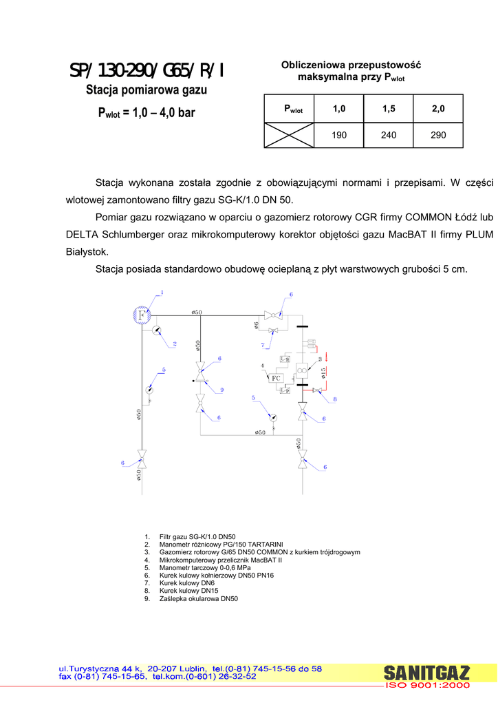 SP/130-290/G65/R/I Stacja pomiarowa gazu Pwlot = 1,0 – 4,0 bar Obliczeniowa przepustowość maksymalna przy Pwlot Pwlot 1,0 1,5 2,0 190 240 290 Stacja wykonana została zgodnie z obowiązującymi normami i przepisami. W części wlotowej zamontowano filtry gazu SG-K/1.0 DN 50. Pomiar gazu rozwiązano w oparciu o gazomierz rotorowy CGR firmy COMMON Łódź lub DELTA Schlumberger oraz mikrokomputerowy korektor objętości gazu MacBAT II firmy PLUM Białystok. Stacja posiada standardowo obudowę ocieplaną z płyt warstwowych grubości 5 cm. 1. 2. 3. 4. 5. 6. 7. 8. 9. Filtr gazu SG-K/1.0 DN50 Manometr różnicowy PG/150 TARTARINI Gazomierz rotorowy G/65 DN50 COMMON z kurkiem trójdrogowym Mikrokomputerowy przelicznik MacBAT II Manometr tarczowy 0-0,6 MPa Kurek kulowy kołnierzowy DN50 PN16 Kurek kulowy DN6 Kurek kulowy DN15 Zaślepka okularowa DN50 SP/130-290/G65/R/I