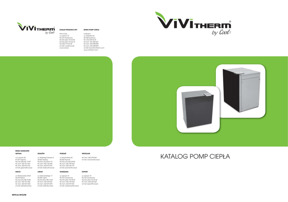 ® ® ZAK£AD PRODUKCYJNY BIURO POMP CIEP£A PPH COOL ul. Lipowa 10 05-123 Chotomów tel./fax (22) 772 62 82 tel./fax (22) 772 64 18 fax (22) 772 65 02 e-mail: [email protected] www.cool.pl ViVitherm ul. Gdyñska 25 58-100 Œwidnica tel. (74) 640 30 30 tel. kom. 601 800 657 tel. kom. 669 588 899 tel. kom. 695 688 899 e-mail: [email protected] www.vivitherm.com BIURA HANDLOWE GDYNIA KRAKÓW POZNAÑ WROC£AW ul. £u¿ycka 3b 81-347 Gdynia tel./fax (58) 661 19 09 tel. kom. 602 377 873 tel. kom. 664 473 572 e-mail: [email protected] ul. Walerego S³awka 3 30-653 Kraków tel./fax (12) 254 61 51 tel. kom. 502 136 043 tel. kom. 664 473 575 e-mail: [email protected] ul. Krauthofera 42 60-202 Poznañ tel./fax (61) 663 28 84 tel. kom. 602 799 663 tel. kom. 602 333 141 e-mail: [email protected] tel. kom. 602 378 024 e-mail: [email protected] KIELCE LUBLIN WARSZAWA EXPORT ul. Warszawska 214/4 25-414 Kielce tel./fax (41) 345 70 80 tel. kom. 602 377 846 tel. kom. 664 473 565 e-mail: [email protected] ul. Ga³czyñskiego 17 20-455 Lublin tel./fax (81) 748 73 40 tel. kom. 602 378 074 tel. kom. 664 473 559 e-mail: [email protected] ul. Lipowa 10 05-123 Chotomów tel./fax (22) 772 28 02 tel. kom. 602 725 266 tel. kom. 664 473 561 e-mail: [email protected] ul. Lipowa 10 05-123 Chotomów tel./fax (22) 772 29 36 tel. kom. 602 369 422 e-mail: [email protected] EDYCJA 2012/08 KATALOG POMP CIEP£A KATALOG POMP CIEP£A SPIS TREŒCI WSTÊP .................................................................................................................................................................. 2 ViViGEO-1 ........................................................................................................................................................ 3 ViViGEO-2H1 ................................................................................................................................................. 14 ViViGEO-2H2 ................................................................................................................................................ 20 ViViGEO-3H3 ................................................................................................................................................ 28 WSTÊP Produkty marki ViVitherm to cztery typoszeregi innowacyjnych pomp ciep³a. CHARAKTERYSTYKA OGÓLNA Pompy ciep³a ViVitherm zaprojektowane s¹ wg najnowszych standardów a wykorzystane w nich podzespo³y s¹ najwy¿szej jakoœci. Sprê¿arki zastosowane w urz¹dzeniach ViVitherm s¹ typu scroll i umo¿liwiaj¹ uzyskanie maksymalnej wydajnoœci grzewczej przy niskim poborze energii elektrycznej oraz pracê urz¹dzenia przez kilkanaœcie lat. Zainstalowany elektroniczny zawór rozprê¿y zapewnia wysokiej jakoœci regulacjê niezale¿nie od zmieniaj¹cych siê warunków pracy urz¹dzenia. G³ówn¹ cech¹, która wyró¿nia produkty marki ViVitherm jest bogate sterowanie oraz intuicyjne menu dostêpne na panelu dotykowym. Praca pomp ciep³a mo¿e byæ realizowana w trybie pogodowym wg skonfigurowanej przez u¿ytkownika krzywej grzewczej lub do sta³ej wyznaczonej temperatury ogrzewania niezale¿nie od temperatury zewnêtrznej. Urz¹dzenia posiadaj¹ wiele trybów oszczêdnoœciowych, które obni¿aj¹ temperatury do zadanych przez nas poziomów wtedy gdy nie potrzebujemy pe³nej wydajnoœci grzewczej. Mo¿emy ustawiæ aby pompa ciep³a utrzymywa³a temperaturê centralnego ogrzewania o klika stopni ni¿ej ni¿ w normalnym trybie pracy podczas gdy bêdziemy poza domem. Podobnie w przypadku ciep³ej wody u¿ytkowej. Korzystanie z tych funkcji pozwala uzyskaæ oszczêdnoœci finansowe oraz maksymalnie realizowaæ idê ogrzewania przyjaznego dla œrodowiska naturalnego. Klimatyzacja pompami ciep³a ViVitherm realizowana jest przez zastosowanie bufora wody lodowej i zainstalowanie w pomieszczeniach klimakonwektorów. Praca klimatyzacji mo¿e byæ realizowana w trybie pasywnym lub aktywnym. Z pomp¹ ciep³a ViVitherm mo¿na komunikowaæ siê przez z³¹cze USB oraz LAN. Mo¿na tak¿e zainstalowaæ w dowolnym miejscu w domu dodatkowy wyœwietlacz dziêki czemu zmiana nastaw urz¹dzenia bêdzie realizowana bez potrzeby schodzenia do pomieszczenia kot³owni. Pompy ciep³a ViVitherm mog¹ równie¿ produkowaæ ch³ód oraz grzaæ basen oraz wspó³pracuj¹ z innymi dodatkowymi urz¹dzeniami dostarczaj¹cymi ciep³o: solarami, kominkiem z p³aszczem wodnym, kot³em gazowym lub olejowym, kot³em na paliwo sta³e. MODELE Podstawow¹ pomp¹ ciep³a jest model przeznaczany do ogrzewania domków jednorodzinnych i przygotowania ciep³ej wody u¿ytkowej. Urz¹dzenie to produkowane jest w dwóch opcjach z zainstalowan¹ pomp¹ obiegow¹ dolnego Ÿród³a ViViGEO1P oraz jako klasyczna pompa ciep³a bez pompy obiegowej dolnego Ÿród³a - ViViGEO1. Przedzia³ mocy grzewczej tej pompy ciep³a wynosi od 8 do16 kW. Urz¹dzenie mo¿e byæ instalowane w domach o powierzchni ogrzewania do oko³o 300m2. 2 KATALOG POMP CIEPŁA Kolejnym modelem jest ViViGEO2H1. Przeznaczenie tej pompy ciep³a to instalacja w wiêkszych domkach jednorodzinnych i niewielkich obiektach przemys³owych oraz u¿ytecznoœci publicznej. Urz¹dzenie wystêpuje w typoszeregu o mocy grzewczej od 22 do 32 kW. Nastêpna pompa ciep³a to ViViGEO2H2, która jest dedykowana dla wiêkszych obiektów przemys³owych. Moc grzewcza wynosi od 40 do 86 kW. www.vivitherm.com Najwiêksz¹ z produkowanych w standardzie pomp ciep³a jest model ViViGEO3H3. W sk³ad urz¹dzenia wchodz¹ trzy sprê¿arki. Moc grzewcza tej pompy ciep³a wynosi od 76 do 129 kW. ViVitherm to tak¿e produkty realizowane wg wytycznych projektowych klienta w przypadku kiedy nie mo¿na zrealizowaæ zadania stosuj¹c urz¹dzenie z standardowego typoszeregu. ® ViViGEO 1 Pompa ciep³a ViViGEO1 to urz¹dzenie przeznaczone do ogrzewania budynków jednorodzinnych i przygotowania ciep³ej wody u¿ytkowej. Mo¿e byæ równie¿ wykorzystane do ogrzewania basenu lub ch³odzenia w klimat