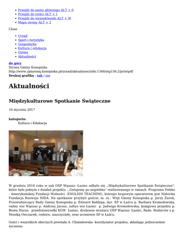 Przejdź do menu głównego ALT + 0 Przejdź do treści ALT + 1 Przejdź do wyszukiwarki ALT + W Mapa strony ALT + 2 Close Urząd Sport i turystyka Gospodarka Kultura i edukacja Gmina Aktualności do góry Strona Gminy Konopiska http://www.zjmyemq.konopiska.pl/urzad/aktualnosci/idn:1346/stg156:2/printpdf Drukuj grafikę : tak / nie Aktualności Międzykulturowe Spotkanie Świąteczne 10 stycznia 2017 kategoria: Kultura i Edukacja W grudniu 2016 roku w sali OSP Wąsosz- Łaziec odbyło się ,,Międzykulturowe Spotkanie Świąteczne", które było jednym z działań projektu ,,Gotujemy po angielsku" realizowanego w ramach Programu Polsko - Amerykańskiej Fundacji Wolności ENGLISH TEACHING, którego krajowym operatorem jest Nidzicka Fundacja Rozwoju NIDA. Na spotkanie przybyli goście, m. in.: Wójt Gminy Konopiska p. Jerzy Żurek, Przewodniczący Rady Gminy Konopiska p. Edward Bałdyga, dyr. SP w Łaźcu p. Barbara Kromołowska, radny wsi Wąsosz p. Andrzej Jarosz, sołtys wsi Łaziec p. Jadwiga Kromołowska, księgowa projektu p. Beata Huras, przedstawicielki KGW Łaziec, druhowie strażacy OSP Wąsosz- Łaziec, Rada Rodziców z p. Moniką Owczarek, rodzice, nauczyciele, oraz uczniowie SP w Łaźcu. Gości i wszystkich obecnych powitała A. Chmielewska- koordynator projektu, składając jednocześnie życzenia: Niech te święta spokój Wam przyniosą, a radość chodzi za Wami krok w krok. Niechaj dostarczą tyle optymizmu, by starczyło na cały Nowy Rok. Uczestnicy projektu - uczniowie zaprezentowali jasełka ze znanymi kolędami polskimi i angielskimi, które przygotowały naucz. M. Wewiór-Mendrela i A. Chmielewska. Świąteczne danie angielskie - pieczony indyk z ziemniakami i warzywami dla wszystkich zebranych przygotowała p. E. Musiał oraz p. M. Sadowska, która czuwała nad kuchnią angielską, a także p. K. Ziółkowska, która służyła pomocą. W przygotowanie spotkania zaangażowani byli oraz wspierali nas w działaniach m.in. rodzice uczniów z projektu, wójt gminy Konopiska, dyr. szkoły, naucz. B. Cierpiał, oraz G. Bukowski i A. Szczerbak. Uczennice klasy II i III przedstawiły i porównały zwyczaje świąteczne polskie i angielskie m. in. - tradycyjne potrawy W Polsce według tradycji przygotowujemy 12 postnych potraw wigilijnych, a w Anglii podczas świątecznego obiadu jada się indyka z pieczonymi ziemniakami i warzywami. - świąteczne tradycje W Polsce dzielimy się opłatkiem podczas Wigilii, składamy życzenia i przeprosiny dla członków rodziny i idziemy na nocną mszę- pasterkę. W Anglii w Wigilię dekoruje się choinkę oraz wystawia ciasteczka nadziewane bakaliami i szklaneczkę brandy dla Father Christmas czyli Mikołaja, który wchodzi przez komin i zostawia prezenty w ‘stockings’ t.j. specjalnych skarpetach wieszanych na kominku. Popularnym zwyczajem świątecznym na wyspach brytyjskich jest rozrywanie krakersów czyli dużych cukierków w których znajduje się wybuchowa niespodzianka, żarcik, lub drobny upominek. - prezenty W Polsce otrzymujemy prezenty od Dzieciątka- Małego Jezusa lub od Aniołka. W Anglii prezenty przynosi Father Christmas albo Święty Mikołaj. Dziękujemy Wszystkim zaagażowanym w realizację projektu! A. Chmielewska, M. Wewiór -Mendrela 10 sty 2017 Międzykulturowe Spotkanie Świąteczne Międzykulturowe Międzykulturowe Międzykulturowe Międzykulturowe Międzykulturowe Międzykulturowe Międzykulturowe Międzykulturowe Międzykulturowe Spotkanie Spotkanie Spotkanie Spotkanie Spotkanie Spotkanie Spotkanie Spotkanie Spotkanie Aktualności - strona 1 Świąteczne Świąteczne Świąteczne Świąteczne Świąteczne Świąteczne Świąteczne Świąteczne Świąteczne Aktualności - strona 2 powrót do listy aktualności