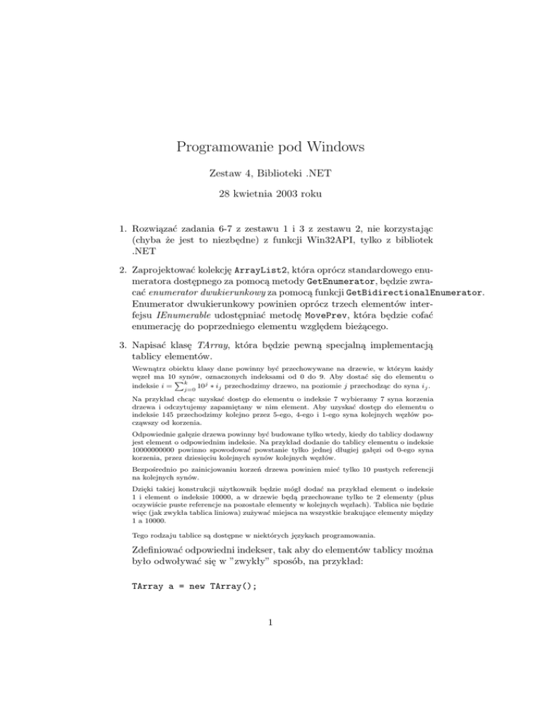 Programowanie pod Windows Zestaw 4, Biblioteki .NET 28 kwietnia 2003 roku 1. Rozwiązać zadania 6-7 z zestawu 1 i 3 z zestawu 2, nie korzystając (chyba że jest to niezbędne) z funkcji Win32API, tylko z bibliotek .NET 2. Zaprojektować kolekcję ArrayList2, która oprócz standardowego enumeratora dostępnego za pomocą metody GetEnumerator, będzie zwracać enumerator dwukierunkowy za pomocą funkcji GetBidirectionalEnumerator. Enumerator dwukierunkowy powinien oprócz trzech elementów interfejsu IEnumerable udostępniać metodę MovePrev, która będzie cofać enumerację do poprzedniego elementu względem bieżącego. 3. Napisać klasę TArray, która będzie pewną specjalną implementacją tablicy elementów. Wewnątrz obiektu klasy dane powinny być przechowywane na drzewie, w którym każdy węzeł ma 10 synów, oznaczonych indeksami od 0 do 9. Aby dostać się do elementu o Pk indeksie i = 10j ∗ ij przechodzimy drzewo, na poziomie j przechodząc do syna ij . j=0 Na przykład chcąc uzyskać dostęp do elementu o indeksie 7 wybieramy 7 syna korzenia drzewa i odczytujemy zapamiętany w nim element. Aby uzyskać dostęp do elementu o indeksie 145 przechodzimy kolejno przez 5-ego, 4-ego i 1-ego syna kolejnych węzłów począwszy od korzenia. Odpowiednie gałęzie drzewa powinny być budowane tylko wtedy, kiedy do tablicy dodawny jest element o odpowiednim indeksie. Na przykład dodanie do tablicy elementu o indeksie 10000000000 powinno spowodować powstanie tylko jednej długiej gałęzi od 0-ego syna korzenia, przez dziesięciu kolejnych synów kolejnych węzłów. Bezpośrednio po zainicjowaniu korzeń drzewa powinien mieć tylko 10 pustych referencji na kolejnych synów. Dzięki takiej konstrukcji użytkownik będzie mógł dodać na przykład element o indeksie 1 i element o indeksie 10000, a w drzewie będą przechowane tylko te 2 elementy (plus oczywiście puste referencje na pozostałe elementy w kolejnych węzłach). Tablica nie będzie więc (jak zwykła tablica liniowa) zużywać miejsca na wszystkie brakujące elementy między 1 a 10000. Tego rodzaju tablice są dostępne w niektórych językach programowania. Zdefiniować odpowiedni indekser, tak aby do elementów tablicy można było odwoływać się w ”zwykły” sposób, na przykład: TArray a = new TArray(); 1 a[17] = 5; a[1000000] = 176; Zdefiniować odpowiedni enumerator, tak aby elementy tablicy można było przeglądać w ”zwykły” sposób, na przykład: TArray a = new TArray(); a[17] = 5; a[1000000] = 176; foreach ( int i in a ) ... Porównać wydajność: TArray ArrayList zwykłych tablic 4. Zaimplementować kolekcję Set działającą jak zbiór. 5. Przygotowaną w poprzednim zestawie zadań klasę COsoba wykorzystać do zaimplementowania prostej aplikacji będącej katalogiem osobowym. Aplikacja powinna składować dane w postaci pliku XML, zaś do pamięci ładować je do jakiejś kolekcji standardowej (np. ArrayList). Użytkownik powinien mieć możliwość dodawania, modyfikacji i usuwania danych oraz sortowania (dodać kilka różnych porządków sortowania za pomocą interfejsów IComparable i IComparer) oraz wyszukiwania (za pomocą kilku przykładowych kryteriów, na przykład podanie daty urodzenia, początkowych liter imienia bądź nazwiska). Zaprojektować dwa przykładowe arkusze stylów XSL do prezentacji danych z pliku XML. Wewnątrz aplikacji użytkownik powinien mieć możliwość obejrzenia zestawienia powstałego przez zastosowanie arkusza stylów do formatowania danych XML (do otworzenia pliku XML wykorzystać mechanizmy powłoki udostępniane przez biblioteki .NET, to znaczy że po wybraniu funkcji tworzącej zestawienie powinna uruchomić się przeglądarka internetowa, w której bieżącym dokumentem byłby zbiór danych XML sformatowany przy użyciu wybranego arkusza styli XSL). 6. Zrealizować w praktyce omawiany na wykładzie scenariusz dynamicznego kompilowania kodu aplikacji, przechowywanego na dysku w postaci zaszyfrowanej. Aplikacja po starcie powinna poprosić o hasło, odszyfrować kod źródłowy, skompilować go do pamięci i uruchomić. 2