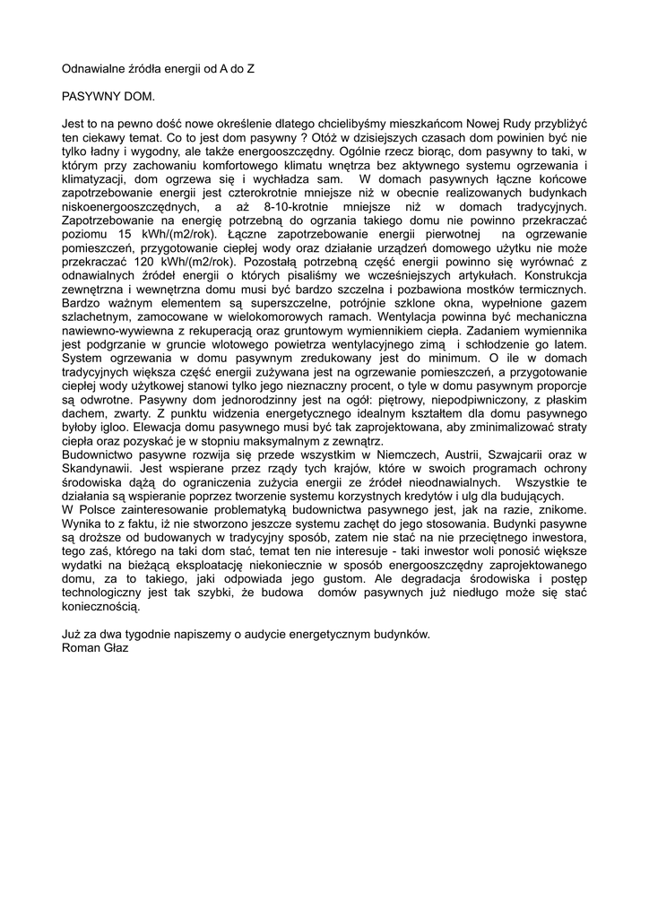 Odnawialne źródła energii od A do Z PASYWNY DOM. Jest to na pewno dość nowe określenie dlatego chcielibyśmy mieszkańcom Nowej Rudy przybliżyć ten ciekawy temat. Co to jest dom pasywny ? Otóż w dzisiejszych czasach dom powinien być nie tylko ładny i wygodny, ale także energooszczędny. Ogólnie rzecz biorąc, dom pasywny to taki, w którym przy zachowaniu komfortowego klimatu wnętrza bez aktywnego systemu ogrzewania i klimatyzacji, dom ogrzewa się i wychładza sam. W domach pasywnych łączne końcowe zapotrzebowanie energii jest czterokrotnie mniejsze niż w obecnie realizowanych budynkach niskoenergooszczędnych, a aż 8-10-krotnie mniejsze niż w domach tradycyjnych. Zapotrzebowanie na energię potrzebną do ogrzania takiego domu nie powinno przekraczać poziomu 15 kWh/(m2/rok). Łączne zapotrzebowanie energii pierwotnej na ogrzewanie pomieszczeń, przygotowanie ciepłej wody oraz działanie urządzeń domowego użytku nie może przekraczać 120 kWh/(m2/rok). Pozostałą potrzebną część energii powinno się wyrównać z odnawialnych źródeł energii o których pisaliśmy we wcześniejszych artykułach. Konstrukcja zewnętrzna i wewnętrzna domu musi być bardzo szczelna i pozbawiona mostków termicznych. Bardzo ważnym elementem są superszczelne, potrójnie szklone okna, wypełnione gazem szlachetnym, zamocowane w wielokomorowych ramach. Wentylacja powinna być mechaniczna nawiewno-wywiewna z rekuperacją oraz gruntowym wymiennikiem ciepła. Zadaniem wymiennika jest podgrzanie w gruncie wlotowego powietrza wentylacyjnego zimą i schłodzenie go latem. System ogrzewania w domu pasywnym zredukowany jest do minimum. O ile w domach tradycyjnych większa część energii zużywana jest na ogrzewanie pomieszczeń, a przygotowanie ciepłej wody użytkowej stanowi tylko jego nieznaczny procent, o tyle w domu pasywnym proporcje są odwrotne. Pasywny dom jednorodzinny jest na ogół: piętrowy, niepodpiwniczony, z płaskim dachem, zwarty. Z punktu widzenia energetycznego idealnym kształtem dla domu pasywnego byłoby igloo. Elewacja domu pasywnego musi być tak zaprojektowana, aby zminimalizować straty ciepła oraz pozyskać je w stopniu maksymalnym z zewnątrz. Budownictwo pasywne rozwija się przede wszystkim w Niemczech, Austrii, Szwajcarii oraz w Skandynawii. Jest wspierane przez rządy tych krajów, które w swoich programach ochrony środowiska dążą do ograniczenia zużycia energii ze źródeł nieodnawialnych. Wszystkie te działania są wspieranie poprzez tworzenie systemu korzystnych kredytów i ulg dla budujących. W Polsce zainteresowanie problematyką budownictwa pasywnego jest, jak na razie, znikome. Wynika to z faktu, iż nie stworzono jeszcze systemu zachęt do jego stosowania. Budynki pasywne są droższe od budowanych w tradycyjny sposób, zatem nie stać na nie przeciętnego inwestora, tego zaś, którego na taki dom stać, temat ten nie interesuje - taki inwestor woli ponosić większe wydatki na bieżącą eksploatację niekoniecznie w sposób energooszczędny zaprojektowanego domu, za to takiego, jaki odpowiada jego gustom. Ale degradacja środowiska i postęp technologiczny jest tak szybki, że budowa domów pasywnych już niedługo może się stać koniecznością. Już za dwa tygodnie napiszemy o audycie energetycznym budynków. Roman Głaz
