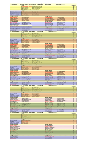 Połączenie - 1 Turniej LIGA – 26.10.2014r WSCHÓD CENTRUM ZACHÓD-------- I Liga Sandecja Nowy Sącz A Jedynka Tarnów MKS Andrychów A MKS MOS Wieliczka A PUNKTY 100 90 85 82 Sandecja Nowy Sącz A MKS MOS Wieliczka A MKS Andrychów A Jedynka Tarnów II Liga Z 2 LIGI spadają 2 zespoły odpowiednio do grup wschód i zachód po 1 DALIN Myślenice ISKRY Grybów UKS 2010 Liszki Sparta Kraków A Sparta Kraków A ISKRY Grybów DALIN Myślenice UKS 2010 Liszki III Liga Wschód Ekstrim Gorlice Poprad Stary Sącz Sparta Kraków B Ogniwo Piwniczna III Liga Zachód Poprad Stary Sącz Ekstrim Gorlice Sparta Kraków B Ogniwo Piwniczna PMOS Chrzanów TS Wisła Kraków A MKS MOS Wieliczka C Setbol Oświęcim B POGOŃ Proszowice MKS MOS Wieliczka B Wola Batorska Kęczanin Kęty Setbol Oświęcim A MKS Andrychów B Zalew Świnna Poręba IV Liga Wschód Wola Batorska MKS MOS Wieliczka B POGOŃ Proszowice PMOS Chrzanów TS Wisła Kraków A Setbol Oświęcim B MKS MOS Wieliczka C 76 75 74 73 Setbol Oświęcim A Kęczanin Kęty MKS Andrychów B Zalew Świnna Poręba MECZE do 3 wygranych setów! KS Radwansport ALPS Wadowice MOSiR Bukowno 72 71 70 69 IV Liga Zachód V Liga Wschód Bronowianka Kraków Sandecja Nowy Sącz B TS Wisła Kraków B Salos Staniątki 80 79 78 77 V Liga Zachód Sandecja Nowy Sącz B TS Wisła Kraków B Bronowianka Kraków Salos Staniątki --- KS Radwansport ALPS Wadowice MOSiR Bukowno 2 Turniej LIGA – 16.11.2014r WSCHÓD CENTRUM ZACHÓD-------- I Liga Sandecja Nowy Sącz A MKS MOS Wieliczka A MKS Andrychów A Sparta Kraków A 68 67 66 PUNKTY 100 90 85 82 Sparta Kraków A MKS Andrychów A Sandecja Nowy Sącz A MKS MOS Wieliczka A II Liga Z 2 LIGI spadają 2 zespoły odpowiednio do grup wschód i zachód po 1 Jedynka Tarnów ISKRY Grybów Poprad Stary Sącz PMOS Chrzanów ISKRY Grybów Jedynka Tarnów Poprad Stary Sącz PMOS Chrzanów III Liga Wschód DALIN Myślenice Ekstrim Gorlice Sparta Kraków B POGOŃ Proszowice III Liga Zachód DALIN Myślenice POGOŃ Proszowice Ekstrim Gorlice Sparta Kraków B UKS 2010 Liszki TS Wisła Kraków A Setbol Oświęcim B Setbol Oświęcim A MKS MOS Wieliczka B Wola Batorska Sandecja Nowy Sącz B Ogniwo Piwniczna MECZE do 3 wygranych setów! Bronowianka Kraków TS Wisła Kraków B Salos Staniątki MKS MOS Wieliczka C Kęczanin Kęty MKS Andrychów B KS Radwansport IV Liga Wschód Ogniwo Piwniczna MKS MOS Wieliczka B Wola Batorska Sandecja Nowy Sącz B V Liga Wschód TS Wisła Kraków B Bronowianka Kraków Salos Staniątki 80 79 78 77 UKS 2010 Liszki TS Wisła Kraków A Setbol Oświęcim A Setbol Oświęcim B 76 75 74 73 Kęczanin Kęty MKS Andrychów B MKS MOS Wieliczka C KS Radwansport MECZE do 3 wygranych setów! ALPS Wadowice Zalew Świnna Poręba MOSiR Bukowno 72 71 70 69 IV Liga Zachód 3 Turniej LIGA – 30.11.2014r WSCHÓD V Liga Zachód --- Zalew Świnna Poręba ALPS Wadowice MOSiR Bukowno CENTRUM ZACHÓD-------- I Liga Sparta Kraków A MKS Andrychów A Sandecja Nowy Sącz A ISKRY Grybów 68 67 66 Sparta Kraków A MKS Andrychów A Sandecja Nowy Sącz A ISKRY Grybów PUNKTY 100 90 85 82 MKS MOS Wieliczka A DALIN Myślenice Jedynka Tarnów UKS 2010 Liszki 80 79 78 77 II Liga Z 2 LIGI spadają 2 zespoły odpowiednio do grup wschód i zachód po 1 MKS MOS Wieliczka A Jedynka Tarnów DALIN Myślenice UKS 2010 Liszki III Liga Wschód Poprad Stary Sącz POGOŃ Proszowice Ekstrim Gorlice MKS MOS Wieliczka B III Liga Zachód Ekstrim Gorlice Poprad Stary Sącz MKS MOS Wieliczka B POGOŃ Proszowice PMOS Chrzanów TS Wisła Kraków A Setbol Oświęcim A Kęczanin Kęty Sparta Kraków B Wola Batorska Sandecja Nowy Sącz B Bronowianka Kraków MECZE do 3 wygranych setów! TS Wisła Kraków B Ogniwo Piwniczna Salos Staniątki Setbol Oświęcim B MKS Andrychów B MKS MOS Wieliczka C ALPS Wadowice IV Liga Wschód Sparta Kraków B Wola Batorska Sandecja Nowy Sącz B Bronowianka Kraków V Liga Wschód Ogniwo Piwniczna TS Wisła Kraków B Salos Staniątki TS Wisła Kraków A Kęczanin Kęty PMOS Chrzanów Setbol Oświęcim A 76 75 74 73 MKS MOS Wieliczka C Setbol Oświęcim B MKS Andrychów B ALPS Wadowice MECZE do 3 wygranych setów! Zalew Świnna Poręba MOSiR Bukowno KS Radwansport 72 71 70 69 IV Liga Zachód 4 Turniej LIGA – 14.12.2014r WSCHÓD V Liga Zachód --- KS Radwansport Zalew Świnna Poręba MOSiR Bukowno CENTRUM ZACHÓD-------- I Liga Sparta Kraków A MKS Andrychów A Sandecja Nowy Sącz A MKS MOS Wieliczka A 68 67 66 PUNKTY 100 90 85 82 Sparta Kraków A MKS Andrychów A MKS MOS Wieliczka A Sandecja Nowy Sącz A II Liga Z 2 LIGI spadają 2 zespoły odpowiednio do grup wschód i zachód po 1 ISKRY Grybów DALIN Myślenice Ekstrim Gorlice TS Wisła Kraków A DALIN Myślenice ISKRY Grybów TS Wisła Kraków A Ekstrim Gorlice III Liga Wschód Jedynka Tarnów Poprad Stary Sącz MKS MOS Wieliczka B Sparta Kraków B III Liga Zachód Jedynka Tarnów MKS MOS Wieliczka B Poprad Stary Sącz Sparta Kraków B UKS 2010 Liszki Kęczanin Kęty PMOS Chrzanów MKS MOS Wieliczka C Sandecja Nowy Sącz B POGOŃ Proszowice Wola Batorska TS Wisła Kraków B Setbol Oświęcim A Setbol Oświęcim B MKS Andrychów B Zalew Świnna Poręba Bronowianka Kraków Ogniwo Piwniczna Salos Staniątki ALPS Wadowice MOSiR Bukowno KS Radwansport IV Liga Wschód POGOŃ Proszowice Wola Batorska Sandecja Nowy Sącz B TS Wisła Kraków B UKS 2010 Liszki PMOS Chrzanów MKS MOS Wieliczka C Kęczanin Kęty 76 75 74 73 Setbol Oświęcim B Setbol Oświęcim A MKS Andrychów B Zalew Świnna Poręba 72 71 70 69 KS Radwansport ALPS Wadowice MOSiR Bukowno 68 67 66 IV Liga Zachód V Liga Wschód Bronowianka Kraków Ogniwo Piwniczna Salos Staniątki 80 79 78 77 V Liga Zachód 5 Turniej LIGA – 11.01.2015r WSCHÓD CENTRUM ZACHÓD-------- I Liga PUNKTY 100 90 85 82 Sparta Kraków A MKS Andrychów A MKS MOS Wieliczka A DALIN Myślenice II Liga Z 2 LIGI spadają 2 zespoły odpowiednio do grup wschód i zachód po 1 Sandecja Nowy Sącz A ISKRY Grybów Jedynka Tarnów UKS 2010 Liszki 80 79 78 77 III Lig