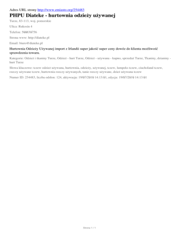 Adres URL strony http://www.emiasto.org/254483 PHPU Diateke - hurtownia odzieży używanej Turze, 83-113, woj. pomorskie Ulica: Rukosin 4 Telefon: 500830756 Strona www: http://diateke.pl Email: [email protected] Hurtownia Odzieży Używanej import z Irlandii super jakość super ceny dowóz do klienta możliwość sprawdzenia towaru. Kategorie: Odzież i tkaniny Turze, Odzież - hurt Turze, Odzież - używana - kupno, sprzedaż Turze, Tkaniny, dzianiny hurt Turze Słowa kluczowe: tczew odzież używana, hurtownia, odzieży, używanej, tczew, lumpeks tczew, ciucholand tczew, rzeczy używane tczew, hurtownia rzeczy używanych, tanie rzeczy używane, dzież używana tczew Numer ID: 254483, liczba odsłon: 124, aktywacja: 19/07/2010 14:13:01, edycja: 19/07/2010 14:13:01 Strona 1 / 1