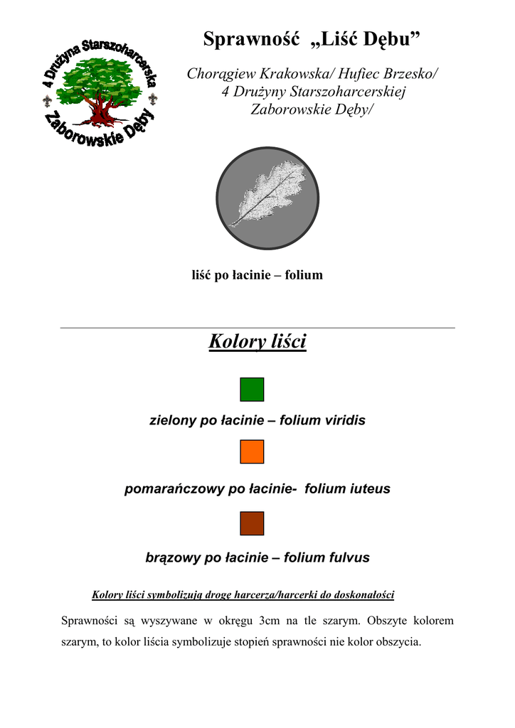 Sprawność „Liść Dębu” Chorągiew Krakowska/ Hufiec Brzesko/ 4 Drużyny Starszoharcerskiej Zaborowskie Dęby/ liść po łacinie – folium Kolory liści zielony po łacinie – folium viridis pomarańczowy po łacinie- folium iuteus brązowy po łacinie – folium fulvus Kolory liści symbolizują drogę harcerza/harcerki do doskonałości Sprawności są wyszywane w okręgu 3cm na tle szarym. Obszyte kolorem szarym, to kolor liścia symbolizuje stopień sprawności nie kolor obszycia. Sposób Otrzymania Odznaki Liścia przyznaje i odbiera, oraz wyszywa specjalna kapituła honorowej sprawności „Liścia Dębu” złożona z dwóch osób wyłonionych z drużyny i zaakceptowanych przez radę drużyny. Muszą to być osoby nie splamione żadnymi upomnieniami i karami. Kapituła ma obowiązek poinformować drużynowego jaką osobę chce odznaczyć odznaką, i dlaczego. Harcerz/harcerka którzy otrzymują sprawność powinni w swym życiu kierować się prawem i przyrzeczeniem harcerskim. Być otwartymi na świat, życzliwymi, bezinteresownie, nieść pomoc dla innych. Brać czynny udział w życiu drużyny. Nie powinni się splamić żadnym upomnieniem i naganą. Osoba która zostanie wskazana przez kapitułę na prawo odmówić otrzymania odznaki, bez uzasadnienia swojej decyzji. Honorową odznakę może otrzymać również drużynowy.