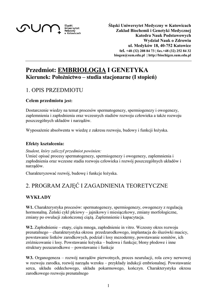 Śląski Uniwersytet Medyczny w Katowicach Zakład Biochemii i Genetyki Medycznej Katedra Nauk Podstawowych Wydział Nauk o Zdrowiu ul. Medyków 18, 40-752 Katowice tel. +48 (32) 208 84 73 | fax.+48 (32) 252 84 32 [email protected] | http://biochigen.sum.edu.pl Przedmiot: EMBRIOLOGIA I GENETYKA Kierunek: Położnictwo – studia stacjonarne (I stopień) 1. OPIS PRZEDMIOTU Celem przedmiotu jest: Dostarczenie wiedzy na temat procesów spermatogenezy, spermiogenezy i owogenezy, zaplemnienia i zapłodnienia oraz wczesnych stadiów rozwoju człowieka a także rozwoju poszczególnych układów i narządów. Wyposażenie absolwenta w wiedzę z zakresu rozwoju, budowy i funkcji łożyska. Efekty kształcenia: Student, który zaliczył przedmiot powinien: Umieć opisać procesy spermatogenezy, spermiogenezy i owogenezy, zaplemnienia i zapłodnienia oraz wczesne stadia rozwoju człowieka i rozwój poszczególnych układów i narządów. Charakteryzować rozwój, budowę i funkcje łożyska. 2. PROGRAM ZAJĘĆ I ZAGADNIENIA TEORETYCZNE WYKŁADY W1. Charakterystyka procesów: spermatogenezy, spermiogenezy, owogenezy z regulacją hormonalną. Żeński cykl płciowy – jajnikowy i miesiączkowy, zmiany morfologiczne, zmiany po owulacji zakończonej ciążą. Zaplemnienie i kapacytacja. W2. Zapłodnienie – etapy, ciąża mnoga, zapłodnienie in vitro. Wczesny okres rozwoju prenatalnego – charakterystyka okresu przedzarodkowego, implantacja do śluzówki macicy, powstawanie listków zarodkowych, podział i losy mezodermy, powstawanie somitów, ich zróżnicowanie i losy. Powstawanie łożyska – budowa i funkcje; błony płodowe i inne struktury pozazarodkowe – powstawanie i funkcje W3. Organogeneza – rozwój narządów pierwotnych, proces neurulacji, rola cewy nerwowej w rozwoju zarodka, rozwój narządu wzroku – przykłady indukcji embrionalnej. Powstawanie serca, układu oddechowego, układu pokarmowego, kończyn. Charakterystyka okresu zarodkowego rozwoju prenatalnego 1 Śląski Uniwersytet Medyczny w Katowicach Zakład Biochemii i Genetyki Medycznej Katedra Nauk Podstawowych Wydział Nauk o Zdrowiu ul. Medyków 18, 40-752 Katowice tel. +48 (32) 208 84 73 | fax.+48 (32) 252 84 32 [email protected] | http://biochigen.sum.edu.pl W4. Charakterystyka okresu płodowego rozwoju prenatalnego człowieka. Charakterystyka procesów zachodzących podczas różnicowania i morfogenezy – m.in. migracja, fuzja, apoptoza komórek – znaczenie podczas degradacji morfogenetycznej. Charakterystyka inhibicji kontaktowej. Charakterystyka procesu indukcji embrionalnej - mechanizm działania cząsteczek sygnałowych, ich klasyfikacja i funkcja w rozwoju, rola cytokin, udział genów homeotycznych – rola genów homeoboksu w tworzeniu wzoru budowy organizmu W5. Zagrożenia procesu rozwoju embrionalnego płynące ze środowiska zewnętrznego – teratogeny, krytyczne okresy wrażliwości na ich działanie podczas rozwoju, zależność efektu teratogennego od dawki teratogenu i genotypu zarodka, mechanizm teratogenezy. Podział czynników teratogennych dla człowieka. Charakterystyka skutków działania chemicznych czynników teratogennych: alkoholu, charakterystyczne cechy fenotypowe płodowego zespołu alkoholowego; palenia papierosów , charakterystyczne cechy płodowego zespołu tytoniowego; hormonów, antybiotyków, leków przeciwdrgawkowych, charakterystyka płodowego zespołu hydantoinowego, płodowego zespołu trimetadionowego i zespołu walproinowego; leków tarczycowych; Wit.A (kwas retinolowy); narkotyków i leków uspokajających W6. Charakterystyka skutków działania infekcyjnych czynników teratogennych: wirusa różyczki – embriopatia różyczkowa; wirusa cytomegalii; wirusa opryszczki; wirusa ospy wietrznej, półpaśca, grypy; toksoplazmozy, AIDS - embriopatia HIV, zespół dymorficzny HIV; kiły. Charakterystyka skutków działania fizycznych czynników teratogennych: promieniowania jonizującego. Charakterystyka skutków działania matczynych czynników teratogennych: cukrzycy , embriopatia, cukrzycowa; fenyloketonurii. W7. Wady wrodzone, klasyfikacja, Polski Rejestr Wad Wrodzonych. Mechanizmy patogenetyczne wad wrodzonych: dysrupcje, deformacje, malformacje, dysplazje. Etiologia dużych wad rozwojowych z przykładami: wieloczynnikowa, monogenowa, chromosomowa, choroby matki, infekcyjna. Częstość dużych wad wrodzonych z uwzględnieniem lokalizacji: wady OUN, cewy nerwowej, serca, nerek, kończyn. Charakterystyka małych wad wrodzonych, przykłady, cechy dysmorfologiczne. Profilaktyka wad wrodzonych, pierwotna, wtórna. 2 Śląski Uniwersytet Medyczny w Katowicach Zakład Biochemii i Genetyki Medycznej Katedra Nauk Podstawowych Wydział Nauk o Zdrowiu ul. Medyków 18, 40-752 Katowice tel. +48 (32) 208 84 73 | fax.+48 (32) 252 84 32 [email protected] | http://biochigen.sum.edu.pl 3. WYKAZ LITERATURY Podstawowa: 1. Bartel H. Embriologia. Podręcznik dla studentów. Wydanie IV. PZWL. Warszawa 2005. 2. Kurpisz Maciej (red.). Molekularne podstawy rozrodczości człowieka i innych ssaków. Wydanie I. Poznań 2002. 3. Jura Czesław, Klag Jerzy (red.). Podstawy embriologii zwierząt i człowieka. Tom 1 i 2. Wydanie I. Wydawnictwo Naukowe PWN. Warszawa 2005. Uzupełniająca: 1. Bielańska-Osuchowska Zofia. Zarys organogenezy. Różnicowanie się komórek w narządach. Wydawnictwo Naukowe PWN. Warszawa 2004 2. Sadler Thomas W. Langman's essential medical embryology. Lippincott Williams & Wilkins. Philadephia 2005. 3