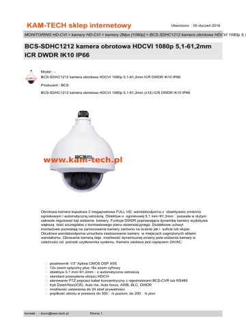KAM-TECH sklep internetowy Utworzono : 05 styczeń 2016 MONITORING HD-CVI > kamery HD-CVI > kamery 2Mpx [1080p] > BCS-SDHC1212 kamera obrotowa HDCVI 1080p 5,1 BCS-SDHC1212 kamera obrotowa HDCVI 1080p 5,1-61,2mm ICR DWDR IK10 IP66 Model : BCS-SDHC1212 kamera obrotowa HDCVI 1080p 5,1-61,2mm ICR DWDR IK10 IP66 Producent : BCS BCS-SDHC1212 kamera obrotowa HDCVI 1080p 5,1-61,2mm (x12) ICR DWDR IK10 IP66 Obrotowa kamera kopułowa 2 megapixelowa FULL HD, wandaloodporna z obiektywem zmienno ogniskowym i automatyczną ostrością. Obiektyw o ogniskowej 5.1 mm~61.2mm�pozwala w dużym zakresie regulować kąt widzenia kamery. Funkcja DWDR poprawiająca dynamikę kamery wydobywa większą ilość szczegółów z kontrastowego planu obserwacyjnego. Dodatkowe uchwyt montażowe pozwalają na zamocowanie kamery zarówno na ścianie jak i suficie lub słupie. Obudowa wandaloodporna umozliwia zastosowanie kamery w miejscach zagrożonych aktami wandalizmu. Obracanie kamerą daje możliwość dynamicznej zmiany pola widzenia kamery w zależności od potrzeb uzytkownika systemu. Kamera zasilana jest napięciem 24VAC. � przetwornik 1/3" Aptina CMOS DSP A5S � 12x zoom optyczny plus 16x zoom cyfrowy � obiektyw 5.1 mm~61.2mm�z automatyczna ostrością � standard przesyłania obrazu HDCVI � sterowanie PTZ poprzez kabel koncentryczny z rejestratorami BCS-CVR lub RS485 � tryb Dzień/Noc(ICR), Auto iris, Auto focus, AWB, BLC, DWDR � możliwość ustawienia do 24 stref prywatności � prędkość obrotu w presecie do 300�/s poziom; do 200�/s pion kontakt : - [email protected] Strona 1 KAM-TECH sklep internetowy Utworzono : 05 styczeń 2016 MONITORING HD-CVI > kamery HD-CVI > kamery 2Mpx [1080p] > BCS-SDHC1212 kamera obrotowa HDCVI 1080p 5,1 BCS-SDHC1212 kamera obrotowa HDCVI 1080p 5,1-61,2mm ICR DWDR IK10 IP66 � obrót�0�-360� poziom (bez punktu krańcowego); -2�-90� auto flip 180� pion � funkcje automatyki - presety, trasy, ścieżki � obudowa wandaloodporna IK10, możliwy montaż zewnętrzny IP66, � zasilacz i uchwyt ścienny w komplecie System skanowania Progressive scan Przetwornik 1/2.8” Exmor CMOS Ilość pikseli 1944(H) x 1092(V), 2 Megapixele Ilość linii ≥1000TVL Wyjście wideo BNC HDCVI/CVBS, możliwość przełączenia Czułość Kolor: [email protected]/W: [email protected] Stosunek S/N > 55dB (AGC wył.) Balans bieli (ATW) Automatyczny / ręczny Obiektyw 5,1~61,2mm F1.6~F3.0 Kąt widzenia H: 51.3�~ 4.64� Zoom optyczny x12 kontakt : - [email protected] Strona 2 KAM-TECH sklep internetowy Utworzono : 05 styczeń 2016 MONITORING HD-CVI > kamery HD-CVI > kamery 2Mpx [1080p] > BCS-SDHC1212 kamera obrotowa HDCVI 1080p 5,1 BCS-SDHC1212 kamera obrotowa HDCVI 1080p 5,1-61,2mm ICR DWDR IK10 IP66 Zoom cyfrowy x16 Kompensacja tła wył. - wł. (BLC/HLC/D-WDR) Migawka Auto, Ręczna 1/1~1/30000s Kontrola wzmocnienia (AGC) wył. - wł. Redukcja szumów (NR) DNR 2D/3D, wył. - wł. Strefy zastrzeżone wł./wył., 24 obszary Odbicie lustrzane wł./wył. Wyostrzanie wł./wył. - płynna regulacja Funkcja dzień/noc Mechaniczny filtr IR (ICR) / Color / BW Wywołanie funkcji automatyki w bezczynności Preset / Ścieżka / Trasa Pan Tilt zakres poziomy 0� - 360� bez punktu krańcowego Pan Tilt zakres pionowy -2� ~ 90�; auto flip 180� Prędkość obrotu w poziomie 0,1� - 300� / sek kontakt : - [email protected] Strona 3 KAM-TECH sklep internetowy Utworzono : 05 styczeń 2016 MONITORING HD-CVI > kamery HD-CVI > kamery 2Mpx [1080p] > BCS-SDHC1212 kamera obrotowa HDCVI 1080p 5,1 BCS-SDHC1212 kamera obrotowa HDCVI 1080p 5,1-61,2mm ICR DWDR IK10 IP66 Prędkość obrotu w pionie 0,1� - 120� / sek Prędkość presetu w poziomie 300� Prędkość presetu w pionie 200� Funkcje automatyki Presety 80(DH-SD) 255 (Pelco-P/D) / 5 ścieżek, 8 Tras, 5 Auto-Pan, 5 Auto-Scan Wejścia/wyjścia alarmowe 2 wejścia / 1 wyjście Sterowanie Kabel koncentryczny (BCS-CVR) / RS485 Protokół DH-SD, Pelco P/D (Automatyczne rozpoznawanie) Standard video HDCVI/CVBS Rozdzielczość 1080P(1920�1080) 25 kl/s ; 720P(1280�720) 25/30/50/60 kl/s Ilość kanałów audio 1 Zasilanie AC24V (+/-10%) Pobór mocy 10W, 19W z włączoną grzałką Temperatura pracy -40�C ~ 60�C Waga kontakt : - [email protected] Strona 4 KAM-TECH sklep internetowy Utworzono : 05 styczeń 2016 MONITORING HD-CVI > kamery HD-CVI > kamery 2Mpx [1080p] > BCS-SDHC1212 kamera obrotowa HDCVI 1080p 5,1 BCS-SDHC1212 kamera obrotowa HDCVI 1080p 5,1-61,2mm ICR DWDR IK10 IP66 2,3kg Wymiary śred/wys (bez uchwytu) Φ186(mm) x 234(mm) Klasa szczelności IP66 Cena : 2.583,00 zł Brutto ( 2.100,00 zł Netto) Dostępność: Produkt dostępny w naszym sklepie od 05 styczeń 2016 kontakt : - [email protected] Strona 5