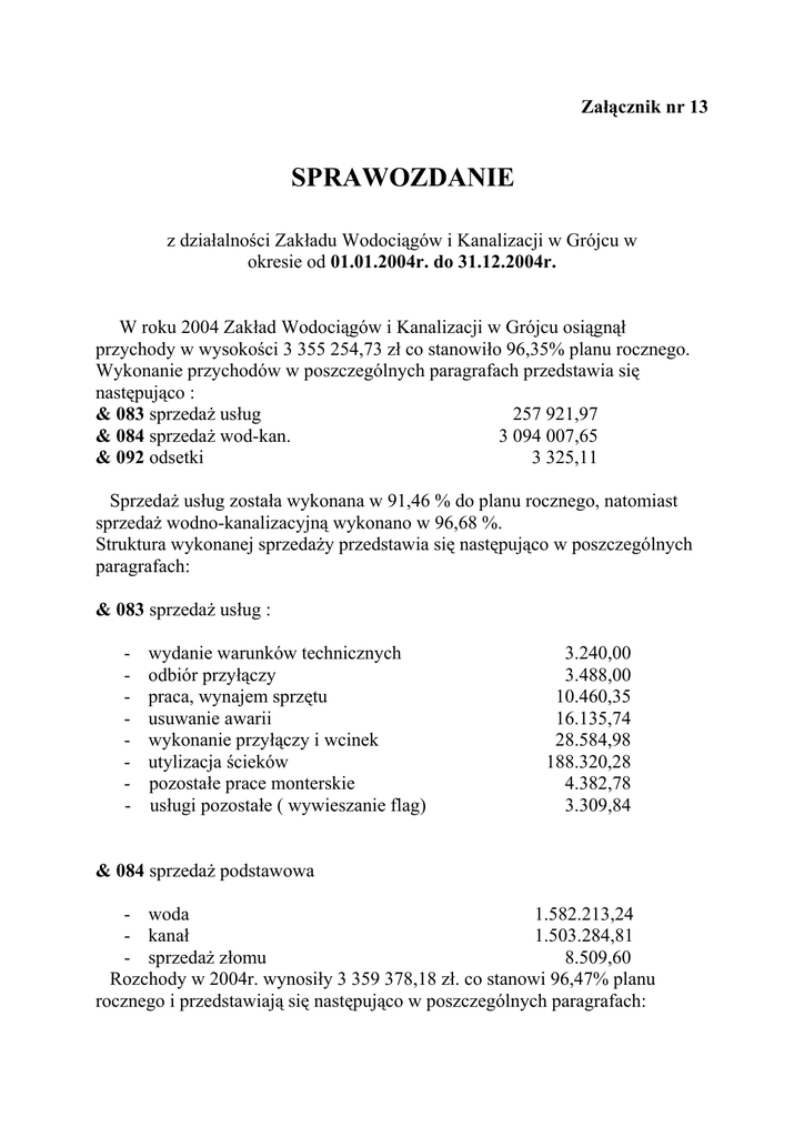 Załącznik nr 13 SPRAWOZDANIE z działalności Zakładu Wodociągów i Kanalizacji w Grójcu w okresie od 01.01.2004r. do 31.12.2004r. W roku 2004 Zakład Wodociągów i Kanalizacji w Grójcu osiągnął przychody w wysokości 3 355 254,73 zł co stanowiło 96,35% planu rocznego. Wykonanie przychodów w poszczególnych paragrafach przedstawia się następująco : & 083 sprzedaż usług 257 921,97 & 084 sprzedaż wod-kan. 3 094 007,65 & 092 odsetki 3 325,11 Sprzedaż usług została wykonana w 91,46 % do planu rocznego, natomiast sprzedaż wodno-kanalizacyjną wykonano w 96,68 %. Struktura wykonanej sprzedaży przedstawia się następująco w poszczególnych paragrafach: & 083 sprzedaż usług : - wydanie warunków technicznych odbiór przyłączy praca, wynajem sprzętu usuwanie awarii wykonanie przyłączy i wcinek utylizacja ścieków pozostałe prace monterskie usługi pozostałe ( wywieszanie flag) 3.240,00 3.488,00 10.460,35 16.135,74 28.584,98 188.320,28 4.382,78 3.309,84 & 084 sprzedaż podstawowa - woda 1.582.213,24 - kanał 1.503.284,81 - sprzedaż złomu 8.509,60 Rozchody w 2004r. wynosiły 3 359 378,18 zł. co stanowi 96,47% planu rocznego i przedstawiają się następująco w poszczególnych paragrafach: PLAN & 3020 ekwiwalent za pranie 4 500,00 & 3030 umowy- zlecenia 17 400,00 & 4010 płace 1 253 500,00 & 4040 dodatkowe wynagrodzenie roczne 106 500,00 & 4110 ubezpieczenie społeczne 247 000,00 & 4120 fundusz pracy 34 000,00 & 4140 PFRON 10 500,00 & 4210 zakupy materiałów 257 900,00 & 4260 opłaty za energię elek., gaz i c.o. 414 000,00 & 4270 remonty i konserwacje 56 500,00 & 4300 zakupy pozostałe , usługi 147 300,00 & 4410 podróże służ. i ryczałty wł.pojazd. 15 000,00 & 4430 opłaty i składki PZU 13 500,00 & 4440 odpisy na ZFŚS 39 000,00 & 4480 podatek od nieruchomości 500 000,00 & 4500 podatek od środków transport. 1 800,00 & 4520 opłaty na rzecz budżetu z tyt. korzystania ze środowiska 280 000,00 & 4570 odsetki od podatków i opłat 5 500,00 & 4580 odsetki pozostałe 6 500,00 & 4590 kary i odszkodowania dla osób fiz. 0 000,00 & 4600 kary i odszkodowania dla osób praw. 5 000,00 & 6070 wydatki inwestycyjne 12 600,00 & 6080 zakupy inwestycyjne 54 400,00 - inne zmniejszenia - WYKONANIE 3 996,00 17 360,00 1 232 969,42 102 299,57 236 915,28 31 717,60 10 423,10 255 211,85 395 571,38 55 899,04 109 174,20 14 822,51 12 597,00 38 726,36 495 961,30 1 616,50 224 122,55 5 203,12 6 341,34 0,00 0,00 12 559,90 54 340,21 41 549,95 W 2004 roku Zakład Wodociągów i Kanalizacji korzystał z dotacji celowej na inwestycje w wysokości 77 000,00 zł. Wydatkowano ją w sposób następujący: - zakupiono dwie pompy głębinowe na SUW Kośmin i jedną na SUW Wola Worowska - zakupiono dwie pompy do wody brudnej na przepompownie ścieków przy ul. Zbyszewskiej i Krobowskiej za kwotę 17.092,20 - zakupiono szafę sterującą na przepompownię ścieków przy ul. Zbyszewskiej i zdemontowano starą za kwotę 17.092,20 - zakupiono wraz z montażem nową kratę mechaniczną na przepompownię przy ul. Zbyszewskiej finansując z dotacji kwotę 34.673,20 , pozostałą kwotę 21.105,20 zakład pokrył z własnych środków . Poza tym z własnych środków pokryto wykonanie części ogrodzenia na SUW Starostokowa z betonowych przęseł oraz zakupiono piłę tarczową , agregat hydrauliczny i komputer do biura . W 2004 roku Zakład Wodociągów i Kanalizacji w Grójcu oprócz sprzedaży wodno-kanalizacyjnej usunął 343 awarie wodociągowe oraz 474 zatory kanalizacyjne za pomocą urządzenia ciśnieniowego i 29 awarii kanalizacyjnych. Ponadto w sprawach wodociągowych interweniowano 638 razy i 348 razy w sprawach kanalizacji. Dokonano wymiany 43 wodomierzy u odbiorców indywidualnych i pozostałych oraz zamontowano 195 nowych, likwidując w ten sposób rozliczenia za wodę w formie ryczałtów. W ramach konserwacji wymieniono 19 przyłączy wodociągowych o łącznej długości 382 mb. W ramach bieżącej konserwacji sieci wodociągowej na terenie miasta i gminy dokonano: - usprawnienia : 11 zasuw wodociągowych 5 hydrantów przeciw pożarowych - wymiany : 19 kluczy do zasuw 16 skrzynek żeliwnych ulicznych do zasuw Przebudowano również przyłącze wodociągowe do budynku Spółdzielni Mieszkaniowej „SAMOPOMOC” przy ul. Starostwo 10A Na terenie miasta prowadzono również bieżącą obsługę 11 zdrojów ulicznych . W celu poprawy jakości wody dostarczanej odbiorcom zakład prowadzi systematyczne płukanie sieci wodociągowej. W ramach bieżącej obsługi sieci kanalizacyjnej prowadzono przeglądy , czyszczenie i drobne naprawy głównych kanałów sanitarnych i deszczowych na terenie całego miasta. Wykonano konserwacje kolektorów na Osiedlu Targowica i w ulicach: Mszczonowskiej, Miłej, Małej, Spacerowej, Baśniowej, Pięknej, Walecznych, Batalionów Chłopskich, Głogowej, Lipowej, Wiśniowej, Drogowców, Lewiczyńskiej, Bagno, Wołodyjowskiego, Skrzetuskiego, Spokojnej, Wspólnej, Krzywej, Łąkowej, Bocianiej, Żabiej, Zbyszewskiej itp. Dokonano przeglądów bieżących kolektorów sanitarnych : południowego, przemysłowego i w ul. Laskowej. Wyczyszczono osadniki i studzienki kanalizacyjne na kanałach deszczowych w ul. Piłsudskiego, Batalionów Chłopskich, Lewiczyńskiej, Polnej, Jana Pawła II, Ks. Piotra Skargi, Niepodległości, Mickiewicza, P.O.W., Poświętne. Na studzienkach osadnikowych kanalizacji deszczowej wymieniono i uzupełniono 12 wpustów ulicznych. Uzupełniono i wymieniono również 11 włazów żeliwnych typu ciężkiego na kanalizacji sanitarnej i deszczowej. Przeprowadzono remont pomp do wody brudnej w przepompowniach przy ul. Zbyszewskiej oraz Krobowskiej. Przeprowadzono konserwację wylotów deszczowych i rzeki Molnicy tj. - wykoszono chwasty - usunięto przetamowania - odmulono dno rowów Na zlecenie wykonano: - 77 wcinek wodociągowych - 20 nowych przyłączy wodociągowych - 5 przykanalików sanitarnych - 82 udrożnienia kanalizacji za pomocą ur