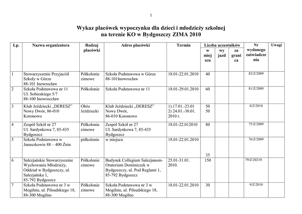 1 Wykaz placówek wypoczynku dla dzieci i młodzieŜy szkolnej na terenie KO w Bydgoszczy ZIMA 2010 Lp. Nazwa organizatora Rodzaj placówki Adres placówki Termin Liczba uczestników w wy za miej jazd grani scu ca Nr wydanego zaświadcze nia Stowarzyszenie Przyjaciół Szkoły w Górze 88-101 Inowrocław Szkoła Podstawowa nr 11 Ul. Sobieskiego 5/7 88-100 Inowroccław Półkolonie zimowe Szkoła Podstawowa w Górze 88-101Inowrocław 18.01-22.01.2010 40 82/Z/2009 Półkolonie Szkoła Podstawowa nr 11 18.01-29.01.2010 60 81/Z/2009 3 Klub Jeździecki „DERESZ” Nowy Dwór, 86-010 Koronowo Obóz Jeździecki Klub Jeździecki „DERESZ” Nowy Dwór, 86-010 Koronowo 1).17.01.-23.01 2) 24.01.-30.01. 2010 r. 50 50 8/Z/2010 4 Zespół Szkół nr 27 Ul. Sardynkowa 7, 85-435 Bydgoszcz Szkoła Podstawowa w Januszkowie 88 – 400 śnin Półkolonie zimowe Zespół Szkół nr 27 Ul. Sardynkowa 7, 85-435 Bydgoszcz w miejscu 18.01-22.012010 80 75/Z/2009 1 2 5 6 7 Salezjańskie Stowarzyszenie Wychowania MłodzieŜy, Oddział w Bydgoszczy, ul. Salezjańska 1, 85-792 Bydgoszcz Szkoła Podstawowa nr 3 w Mogilnie, ul. Piłsudskiego 18, 88-300 Mogilno półkolonie 76/Z/2009 18.01-22.01.2010 Półkolonie zimowe Budynek Collegium SalezjanomOratorium Dominiczek w Bydgoszczy, ul. Pod Reglami 1, 85-792 Bydgoszcz 25.01-31.01. 2010. Półkolonie zimowe Szkoła Podstawowa nr 3 w Mogilnie, ul. Piłsudskiego 18, 88-300 Mogilno 18.01-22.01.2010 35 150 30 79/Z/20210 9/Z/2010 Uwagi 8 9 10 11 12 13 14 15 16 17 18 Szkoła Podstawowa w Złotnikach Kujawskich, ul. Powstańców Wlkp. 3, 88-180 Złotniki Kujawskie Chorągiew KujawskoPomorska ZHP Ul.Dworcowa 56 ; Bydgoszcz 85-10 Szkoła Podstawowa nr 2, Ul. Najświętszej Marii Panny 22/24, 88-100 Inowrocław SP nr 6 88 100 Inowrocław ul. M. Kopernika 18 Pomorskie Centrum Edukacji Ekologicznej w Myślęcinku Ul. Gdańska 173-175 85-674 Bydgoszcz Szkoła Podstawowa w Białych Błotach, ul. Centralna 27, 86-005 Białe Błota Szkoła Podstawowa nr 25 w Bydgoszczy, ul. Czartoryskiego 18, 85-222 Bydgoszcz Szkoła Podstawowa nr 25 w Bydgoszczy, ul. Czartoryskiego 18, 85-222 Bydgoszcz Szkoła Podstawowa Nr 37 ul. Gdańska 122 Bydgoszcz MłodzieŜowe Stowarzyszenie Piłki Siatkowej ul. Szarych Szeregów 8/6 Inowrocław Gimnazjum Nr 3 ul. Łokietka 3 Inowrocław półkolonie Zimowisko Półkolonie zimowe półkolonie Kolonie zimowe Półkolonie zimowe 2 Szkoła Podstawowa w Złotnikach 18.01-22.01.2010 Kujawskich, ul. Powstańców r. Wlkp. 3, 88-180 Złotniki Kujawskie Gimnazjum Nr 24 ul. Kościuszki 17.01-23.01.2010 7 a ; Bydgoszcz 85-079 Szkoła Podstawowa nr 2, Ul. Najświętszej Marii Panny 22/24, 88-100 Inowrocław SP nr 6 88 100 Inowrocław ul. M. Kopernika 18 Leśny Park Kultury i Wypoczynku „Myślęcinek” Ul. Gdańska 173-175 85-674 Bydgoszcz Szkoła Podstawowa w Białych Błotach, ul. Centralna 27, 86-005 Białe Błota Szkoła Podstawowa nr 25 w Bydgoszczy, ul. Czartoryskiego 18, 85-222 Bydgoszcz 77/Z/2009 50 80/Z/2009 18.01-31.01.2010 45 1/Z/2010 18.01-29.01.2010 70 11/Z/2010 16.01.22.01.2010 23.01.29.01.2010 18.01-22.01.2010 25 5/Z/2010 20 93 12/Z/2010 18.01.29.01.2010 30 6/Z/2010 18.01-29.01.2010 30 7/Z/2010 Szkoła Podstawowa Nr 37 ul. 18.01-29.01.2010 Gdańska 122 Bydgoszcz Hala Widowiskowo Sportowa 18.01-30.01.2010 Al. Niepodległości 4 Inowrocław 30 4/Z/2010 32 13/Z/2010 Gimnazjum Nr 3 ul. Łokietka 3 Inowrocław 50 10/Z/2010 półkolonie zimoweferie z koszykówką półkolonie Szkoła Podstawowa nr 25 w zimowe Bydgoszczy, ul. Czartoryskiego 18, 85-222 Bydgoszcz półkolonie zimowe Obóz sportowo rekreacyjny półkolonie zimowe 120 18.01-29.01.2010 19 20 21 22 MłodzieŜowy Chełmiński Klub Koszykówki Przy gimnazjum Nr 1 ul. Szkolna 6 Chełmno Szkoła Podstawowa w Palczynie Nowa Wieś Wielka Polskie Towarzystwo Turystyczno – Krajoznawcze Oddział przy klubie POW Ul. Sułkowskiego 52 Bydgoszcz Uczniowski Klub Sportowy „Szkółka Piłkarska –Chełmno” ul. Szkolna 14 Chełmno 3 Zespół Szkół ul. Kwiatowa 9 Bysław 18.01-23.01.2010 35 3/Z/2010 18.01-22.01.2010 25 2/Z/2010 Polskie Towarzystwo Turystyczno 18.01-22.01.2010 – Krajoznawcze Oddział przy klubie POW 25.01-29.01.2010 Ul. Sułkowskiego 52 Bydgoszcz 36 25 14/Z/2010 18.01.23.01.2010 40 18/Z/2010 Obóz sportowo rekreacyjny półkolonie Szkoła Podstawowa w Palczynie zimowe Nowa Wieś Wielka Połkolonie zimowe Obóz OSiR ul. Warszawska 17 wypoczynko Tuchola wo sportowy 23 Szkoła Podstawowa w Lisewie półkolonie Kościelnym zimowe Złotniki Kujawskie Szkoła Podstawowa w Lisewie Kościelnym Złotniki Kujawskie 18.01-22.01.2010 25 17/Z/2010 24 Zespół Placówek Oświatowych półkolonie Szkoła Podstawowa i zimowe Przedszkole Publiczne ul. Pakoska 35 Złotniki Kujawskie Zespół Placówek Oświatowych 18.01-22.01.2010 Szkoła Podstawowa i Przedszkole Publiczne ul. Pakoska 35 Złotniki Kujawskie 48 15/Z/2010 25 Szkoła Podstawowa nr 4 Ul. Szarych Szeregów 1 88-100 Inowroccław Półkolonie Szkoła Podstawowa nr 4 Ul. Szarych Szeregów 1 Ul. Kusocińskiego 24 88-100 Inowroccław 140 15/Z/2010 Szkoła Podstawowa Gniewkówcu Złotniki Kujawskie półkolonie zimowe 26 Zajęcia sportowe Szkoła Podstawowa w Gniewkówcu Złotniki Kujawskie 18.01-29.01.2010 18.01-29.01.2010 15 18.01-22.01.2010 50 19/Z/2010 27 28 29 30 31 32 33 34 35 36 Szkoła Podstawowa nr 2 w Mogilnie, ul. Sądowa 13, 88-300 Mogilno Pałac MłodzieŜy ul. Jagiellońska 27 Bydgoszcz Szkoła Podstawowa Nr 63 ul. Goszczyńskiego 3 Bydgoszcz Półkolonie zimowe Półkolonie zimowe półkolonie zimowe Zespół Szkół Ul. Wierzbowa 2 Łochowo MłodzieŜowy Dom Kultury Nr 1 Ul. Baczyńskiego 3 Szkoła Podstawowa Nr 9 Ul. Chemiczna 9 88-100 Inowroclaw Szkoła Podstawowa Słębowo 1 88-400 śnin Półkolonie zimowe Zespól Szkół Nr 18 Ul. Hutnicza 89 Bydgoszcz Zespół Szkół Nr 26 Ul. Glinki 117 Bydgoszcz Między Szkolny Uczniowski Klub Sportowy Rekin Ul. Glinki 117 Bydgoszcz Półkolonie zimowe Półkolonie zimowe Półkolonie zimowe Pó