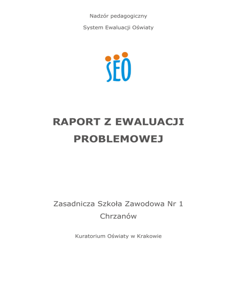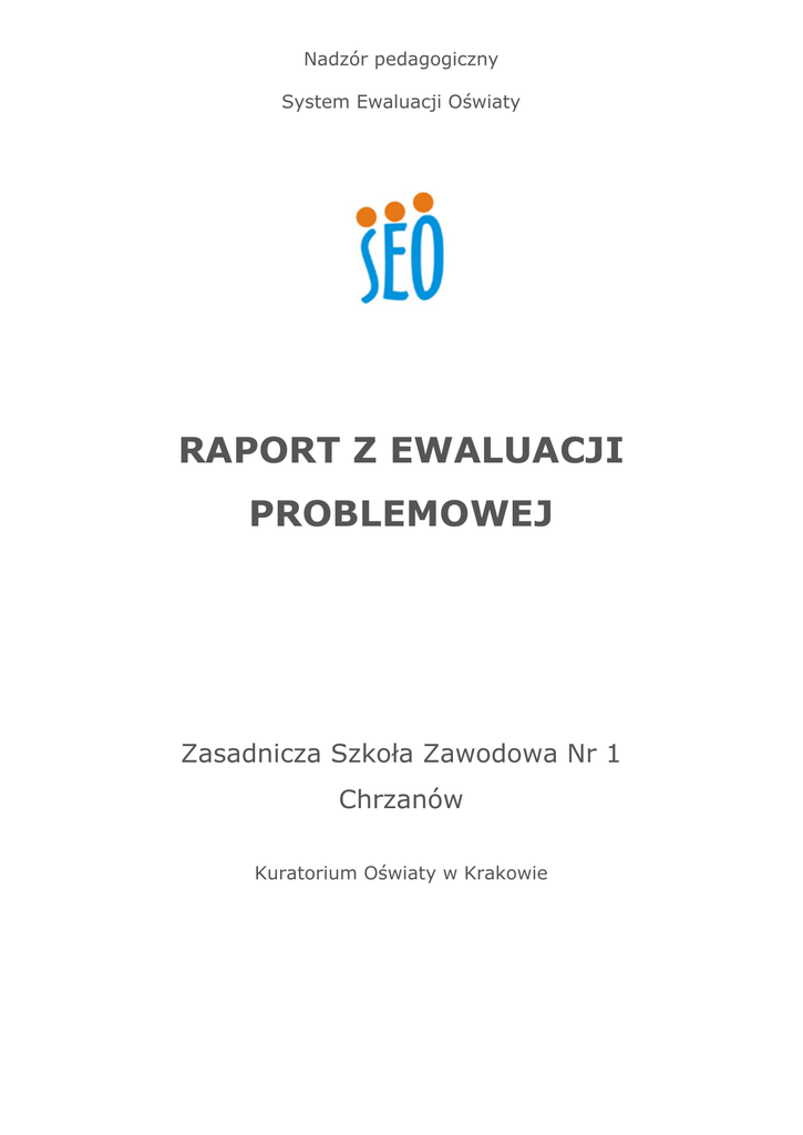 Nadzór pedagogiczny System Ewaluacji Oświaty RAPORT Z EWALUACJI PROBLEMOWEJ Zasadnicza Szkoła Zawodowa Nr 1 Chrzanów Kuratorium Oświaty w Krakowie Wstęp Prezentowany raport jest rezultatem ewaluacji zewnętrznej przeprowadzonej w szkole przez wizytatorów do spraw ewaluacji. Raport z ewaluacji problemowej dotyczy jednego lub kilku z przedstawionych poniżej wymagań państwa. Ewaluacja zewnętrzna polega na zbieraniu i analizowaniu informacji na temat funkcjonowania szkoły w obszarach wyznaczonych przez wymagania państwa: 1. Szkoła lub placówka realizuje koncepcję pracy ukierunkowaną na rozwój uczniów. 2. Procesy edukacyjne są zorganizowane w sposób sprzyjający uczeniu się. 3. Uczniowie nabywają wiadomości i umiejętności określone w podstawie programowej. 4. Uczniowie są aktywni. 5. Respektowane są normy społeczne. 6. Szkoła lub placówka wspomaga rozwój uczniów, z uwzględnieniem ich indywidualnej sytuacji. 7. Nauczyciele współpracują w planowaniu i realizowaniu procesów edukacyjnych. 8. Promowana jest wartość edukacji. 9. Rodzice są partnerami szkoły lub placówki. 10. Wykorzystywane są zasoby szkoły lub placówki oraz środowiska lokalnego na rzecz wzajemnego rozwoju. 11. Szkoła lub placówka, organizując procesy edukacyjne, uwzględnia wnioski z analizy wyników sprawdzianu, egzaminu gimnazjalnego, egzaminu maturalnego, egzaminu potwierdzającego kwalifikacje zawodowe i egzaminu potwierdzającego kwalifikacje w zawodzie oraz innych badań zewnętrznych i wewnętrznych. 12. Zarządzanie szkołą lub placówką służy jej rozwojowi. Ewaluacja ma także na celu ustalenie poziomu spełniania przez szkołę wymagań zawartych w rozporządzeniu Ministra Edukacji Narodowej z dnia 7.10.2009r. wraz ze zmianami z dnia 10.05.2013r. Szkoła może spełniać te wymagania na pięciu poziomach: ● Poziom E - oznaczający niski stopień wypełniania wymagania przez szkołę. ● Poziom D - oznaczający podstawowy stopień wypełniania wymagania przez szkołę. ● Poziom C - oznaczający średni stopień wypełniania wymagania przez szkołę. ● Poziom B - oznaczający wysoki stopień wypełniania wymagania przez szkołę. ● Poziom A - oznaczający bardzo wysoki stopień wypełniania wymagania przez szkołę. Zasadnicza Szkoła Zawodowa Nr 1 2/23 Opis metodologii Badanie zostało zrealizowane w dniach 4 - 9 marca 2015 roku przez zespół wizytatorów ds. ewaluacji, w skład którego weszli: Andrzej Janczy, Danuta Strzelczyk-Kwiędacz. Badaniem objęto uczniów (ankieta i wywiad grupowy), rodziców (wywiad grupowy) i nauczycieli (ankieta i wywiad grupowy). Przeprowadzono wywiad indywidualny z dyrektorem placówki, grupowy z przedstawicielami partnerów szkoły, a także obserwacje lekcji, placówki i analizę dokumentacji. Na podstawie zebranych danych został sporządzony raport, który obejmuje podstawowe obszary działania szkoły: "Uczniowie nabywają wiadomości i umiejętności określone w podstawie programowej", "Szkoła lub placówka wspomaga rozwój uczniów, z uwzględnieniem ich indywidualnej sytuacji", "Szkoła lub placówka, organizując procesy edukacyjne, uwzględnia wnioski z analizy wyników sprawdzianu, egzaminu gimnazjalnego, egzaminu maturalnego i egzaminu potwierdzającego kwalifikacje w zawodzie oraz innych badań zewnętrznych i wewnętrznych". Wyjaśnienie skrótów dla narzędzi: OZ - Arkusz obserwacji zajęć AD - Kwestionariusz ankiety dla dyrektora/dyrektorki szkoły AN - Kwestionariusz ankiety dla nauczycieli AMD - Kwestionariusz ankiety dla uczniów "Mój dzień" AMS - Kwestionariusz ankiety dla uczniów "Moja szkoła" APW - Kwestionariusz ankiety poewaluacyjnej dla wizytatora ADZ - Kwestionariusz badania "Analiza danych zastanych" WN - Scenariusz wywiadu grupowego z nauczycielami WR - Scenariusz wywiadu grupowego z rodzicami WU - Scenariusz wywiadu grupowego z uczniami WD - Scenariusz wywiadu z dyrektorem/dyrektorką szkoły WNPO - Scenariusz wywiadu z nauczycielem po obserwacji WP - Scenariusz wywiadu z partnerami WNO - Scenariusz wywiadu z zespołem nauczycieli uczących w jednym oddziale Zasadnicza Szkoła Zawodowa Nr 1 3/23 Obraz szkoły Zasadnicza Szkoła Zawodowa Nr 1 wchodzi w skład Powiatowego Centrum Edukacyjnego w Chrzanowie. Szkoła, w cyklu trzyletnim, kształci między innymi w zawodach: mechanik pojazdów samochodowych, ślusarz, fryzjer, monter zabudowy i robót wykończeniowych w budownictwie, sprzedawca. Organizacja kształcenia zawodowego oparta jest o pracodawców oraz warsztat szkolny. W zależności od zawodu - teoretyczne kształcenie zawodowe odbywa się w Ośrodkach Dokształcania i Doskonalenia Zawodowego (poza szkołą) lub w szkole. Również egzaminy potwierdzające kwalifikacje zawodowe odbywają się w Okręgowej Komisji Egzaminacyjnej lub w Izbach Rzemiosła. Realizacja podstawy programowej kształcenia uwzględnia szereg trudności edukacyjnych uczniów, które mają swoje źródło w poprzednich etapach kształcenia. Głównym więc działaniem szkoły jest wyrównywanie takich braków w pierwszym okresie kształcenia. Realizacja podstawy programowej skupiona jest wokół kluczowych umiejętności, najczęściej obserwowano budowanie kompetencji uczenia się, co wydaje się kluczowym działaniem, niezbędnym dla osiągnięcia przez uczniów podstawowego sukcesu - w postaci uzyskania tytułu zawodowego. Obserwacja uczniów w ich działalności, analizy osiągnięć edukacyjnych wskazują niekiedy na podstawowe trudności uczniów, które rzutują na ich wyniki w trakcie egzaminów zawodowych. Są to np. czytanie ze zrozumieniem, podstawowe umiejętności rachunkowe. Większość uczniów szkoły zdaje egzaminy zawodowe, co świadczy o efektywnym wdrażaniu wniosków dotyczących procesów edukacyjnych w tej szkole. Uczniowie uzyskują również wsparcie w rozwoju zawodowym - dzięki udziałowi w kursach, w ramach projektu "Modernizacja Kształcenia Zawodowego w Małopolsce", mogą uzyskiwać