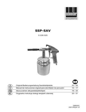 SSP-SAV D 030 025 Original-Bedienungsanleitung Sandstrahlpistole 03 – 09 Manual de instrucciones original para atornillador de percusión 10 – 17 Iskuruuvaimen alkuperäiskäyttöohjeet 18 – 24 Oryginalna instrukcja obsáugi wkrĊtarki udarowej 25 – 31 G880091 2007/06/pli-10 2 1a 1b 2a 2b 3a 3b SSP-SAV DEUTSCH Inhalt 1. 2. 3. 4. 5. 6. 7. 8. 9. Allgemeine Hinweise ............................3 Lieferumfang.........................................3 Mitgeltende Dokumente........................3 Bestimmungsgemäße Verwendung......3 Symbole................................................4 Technische Daten.................................4 Sicherheitshinweise ..............................5 Aufbau ..................................................6 Inbetriebnahme.....................................6 9.1 Vor erster Inbetriebnahme ............6 9.2 Inbetriebnahme.............................6 9.3 Druckluftanschluss........................7 9.4 Betrieb ..........................................7 9.5 Nach dem Einsatz.........................7 10. Wartung ................................................7 10.1 Vor Wartungstätigkeiten ...............7 10.2 Deckeldichtung .............................7 11. Außerbetriebnahme ..............................7 11.1 Lagerung ......................................7 11.2 Entsorgung ...................................7 12. Zubehör ................................................7 13. Störungsbehebung ...............................8 14. Gewährleistungsbedingungen ..............9 15. Konformitätserklärung...........................9 1. Allgemeine Hinweise Prüfungen, Einstellungen und Wartungsarbeiten sollten immer von der gleichen Person oder deren Stellvertreter durchgeführt und in einem Wartungsbuch dokumentiert werden. Bei Fragen bitten wir Sie, die Artikelnummer und Bezeichnung des Gerätes anzugeben. Beachten Sie die Sicherheitshinweise! Bedienungsanleitung lesen! Der Betreiber (Besitzer / Verantwortliche) ist verpflichtet die Bedienungsanleitung zu beachten und alle Anwender dieses Gerätes gemäß der Bedienungsanleitung zu unterweisen. Die Unterweisung ist jährlich zu wiederholen. 2. x x x x x 3. x x 4. Lieferumfang Sandstrahlpistole Dichtung für Deckel Systainer Garantiekarte Bedienungsanleitung Mitgeltende Dokumente Ersatzteilliste EG-Konformitätserklärung Bestimmungsgemäße Verwendung Die Sandstrahlpistole Typ SSP-SAV ist ein handliches, druckluftbetriebenes Gerät für den handwerklichen Einsatz. Sie eignet sich zum Entrosten von Metall in allen Bereichen und zum Entfernen von Farbe auf Metall und Holz. Jede andere Verwendung ist mit dem Hersteller abzustimmen. Wird das Gerät außerhalb von Deutschland betrieben, können andere gesetzliche Vorschriften für den Betrieb des Gerätes vorgeschrieben sein, als sie in dieser Bedienungsanleitung beschrieben sind. SSP-SAV Deutsch 3 5. Symbole Achtung: Schenken Sie diesen Symbolen höchste Aufmerksamkeit! Symbol Signalwort GEFAHR WARNUNG VORSICHT HINWEIS Gefahrenstufe unmittelbar drohende Gefahr mögliche drohende Gefahr mögliche gefährliche Situation mögliche gefährliche Situation Folgen bei Nichtbeachtung Tod, schwere Körperverletzung Tod, schwere Körperverletzung Leichte Körperverletzung Sachschaden Sicherheitshinweise Symbol Bedeutung Bedienungsanleitung lesen! Symbol Bedeutung Folgen bei Nichtbeachtung Körperverletzung oder Tod des Bedieners Sachschaden am Gerät falsche Bedienung des Gerätes Symbol Strahlschutzhaube tragen! Bedeutung Schutzhandschuhe tragen! Staubmaske tragen! 6. Technische Daten Luftverbrauch Maximal zulässiger Arbeitsdruck (Fließdruck) Arbeitsdruck (Fließdruck) Durchmesser der Düse Luftdüse Inhalt des Strahlgutbehälters Korngröße Empfohlener Schlauchdurchmesser (innen) bei L= 10 m Abmessungen: Breite x Tiefe x Höhe Gewicht (mit Behälter, ohne Strahlgut) Benötigte Luftqualität Mindestleistungsgröße des Kompressors 280 7 4-7 5 l/min bar bar mm Venturi 1,0 0,2 – 0,8 9 240 x 115 x 260 0,80 l mm mm mm kg Gereinigt, kondensat- und ölfrei 280 l/min Füllleistung, 2,2 kW Motorleistung, 50 l Behältergröße Technische Änderungen vorbehalten. Abbildungen können vom Original abweichen. Stand: März 2007 4 Deutsch SSP-SAV 7. Sicherheitshinweise GEFAHR Gefahr schwerer Verletzung! Peitschender Druckluftschlauch beim Öffnen der Schnellkupplung. Æ Druckluftschlauch festhalten. GEFAHR Gefahr schwerer Verletzung! Æ Bei Wartungs-, Reparaturarbeiten und beim Nachfüllen von Strahlgut gilt: Gerät vom Druckluftanschluss trennen, Gerät drucklos. WARNUNG Gefahr schwerer Verletzung! Aufwirbeln von Staub, Öl oder sonstige Flüssigkeiten oder Schmutzpartikel während des Betriebes möglich. x x x x x Æ Strahlschutzhaube tragen! Æ Staubmaske tragen! WARNUNG Gefahr schwerer Verletzung! Sandstrahl Æ Sandstrahl nie gegen Personen oder Tiere richten x x WARNUNG Explosionsgefahr! Lebensgefahr! Æ Gerät nicht in explosionsgefährdeten Bereichen oder Atmosphären einsetzen Æ Maximal zulässigen Druck beachten! x WARNUNG Gefahr schwerer Verletzung! Lungengängiger Staub Æ Es ist gesetzlich verboten, Quarzsand als Strahlgut zu verwenden. x x VORSICHT Gefahr Verletzung! Stolperfalle! Druckluftschläuche, die über den Boden geführt werden. Æ Vermeiden bzw. beachten. x SSP-SAV x x Schützen Sie sich, andere Personen, Sachgegenstände und ihre Umwelt durch die jeweils notwendige Schutzmaßnahmen oder Vorkehrungen um Gesundheits-, Sach-, Wert- oder Umweltschäden sowie Unfallgefahren zu vermeiden. Tragen Sie beim Arbeiten mit dem Sandstrahlpistole die erforderliche Schutzkleidung, insbesondere eine Strahlschutzhaube, Atemschutzmaske für Stäube und Arbeitshandschuhe. Der Betreiber hat den sachgerechten Betrieb sicherzustellen. Kinder und Tiere vom Betriebsbereich und vom Druckluftgerät fernhalten. Druckluftgeräte dürfen nur von unterwiesenen Personen bedient und gewartet werden. Reparaturen dürfen nur von qualifiziertem Fachpersonal (Schneider Druckl