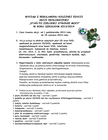 WYCIĄG Z REGULAMINU KOLEJNEJ EDYCJI AKCJI EKOLOGICZNEJ „STAŃ PO ZIELONEJ STRONIE MOCY” W ROKU SZKOLNYM 2013/2014 1. Czas trwania akcji: od 1 października 2013 roku do 15 czerwca 2014 roku 2. Akcja polega na zbiórce zużytych płyt CD oraz DVD, opakowań po płytach CD/DVD, opakowań od kaset magnetofonowych oraz kaset VHS, telefonów komórkowych, ładowarek do telefonu, baterii (A, AA, AAA, C, D, 9V), kabli, przedłużaczy, pilotów do urządzeń elektronicznych, słuchawek, pendrivów, twardych dysków, mp3, discmanów i walkmanów. 3. Raportowanie o ilości zebranych odpadów będzie dokonywane przez Opiekuna akcji za pomocą konta utworzonego na stronie internetowej Organizatora, do piątku w cyklu dwutygodniowym. Uwaga! O każdej zbiórce Opiekun będzie informował zespoły klasowe poprzez wywieszenie stosownej ulotki w pokoju nauczycielskim, klasopracowni oraz gablocie przyrodniczej. Ponadto, na bieżąco przedstawiany będzie ranking zbiórki oraz filmy edukacyjne poświęcone zbiórce w/ w surowców. 4. Podane przez Opiekuna ilości odpadów, przeliczane są przez system informatyczny na punkty. I tak: 1 płyta CD/DVD lub blu-ray – wartość 1 punkt 1 pudełko po płycie CD/DVD lub blu-ray/kasecie VHS/magnetofonowej – wartość 2 punkty 1 zużyty telefon komórkowy – wartość 5 punktów 1 bateria – wartość 1 punkt 1 ładowarka – wartość 3 punkty 1 kabel/przedłużacz – wartość 1 punkt 1 pilot do urządzenia elektronicznego – wartość 2 punkty 1 para słuchawek – wartość 1 punkt 1 twardy dysk – wartość 5 punktów 1 pendrive – wartość 1 punkt 1 discman/walkman/urządzenie mp3 – wartość 2 punkty 5. Nagrody dla najlepszej klasy przewidziane przez Organizatora, w kategoriach: a) w województwie - trzydniowa wycieczka szkolna dla uczniów najlepszej klasy w województwie wraz z wychowawcą i Opiekunem Akcji o wartości 15.000.00 zł (wartość zależy od liczby uczniów w klasie). b) w powiecie - dla I najlepszej klasy w powiecie –niespodzianka o wartości 1500 zł - dla II najlepszej klasy w powiecie – niespodzianka o wartości 1000 zł - dla III najlepszej klasy w powiecie – niespodzianka o wartości 500 zł Szczegółowy regulamin akcji znajduje się na stronie internetowej www.stanpozielonejstroniemocy.pl Opiekun akcji: Ewa Kondratowicz