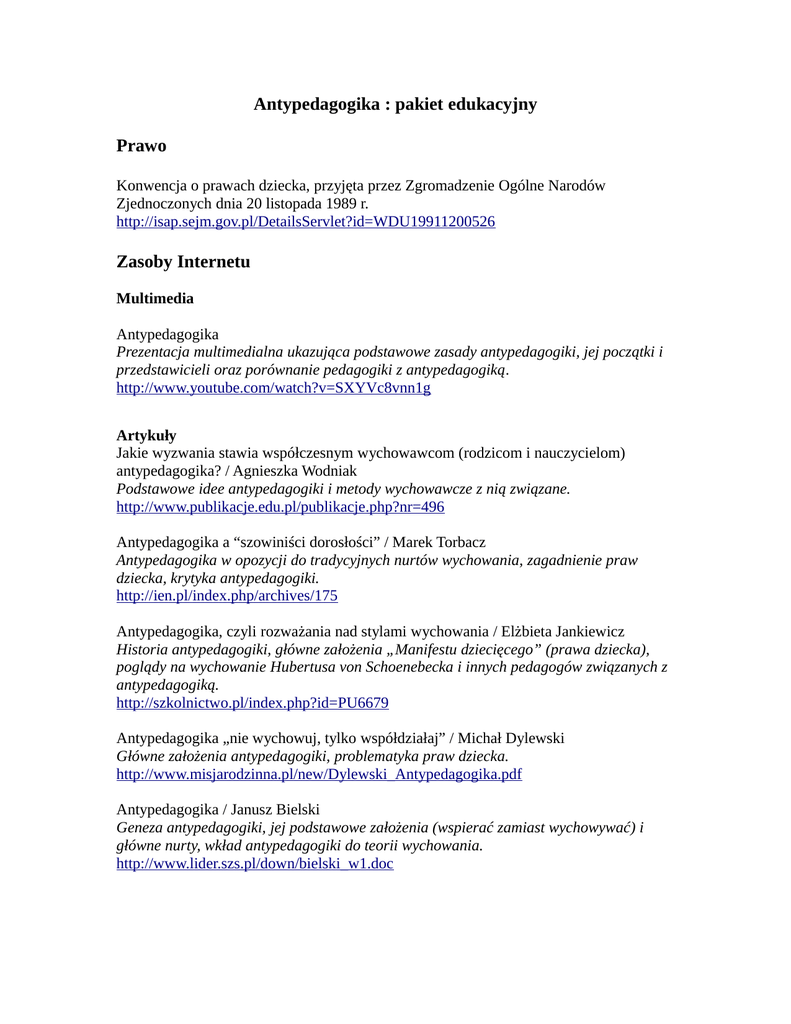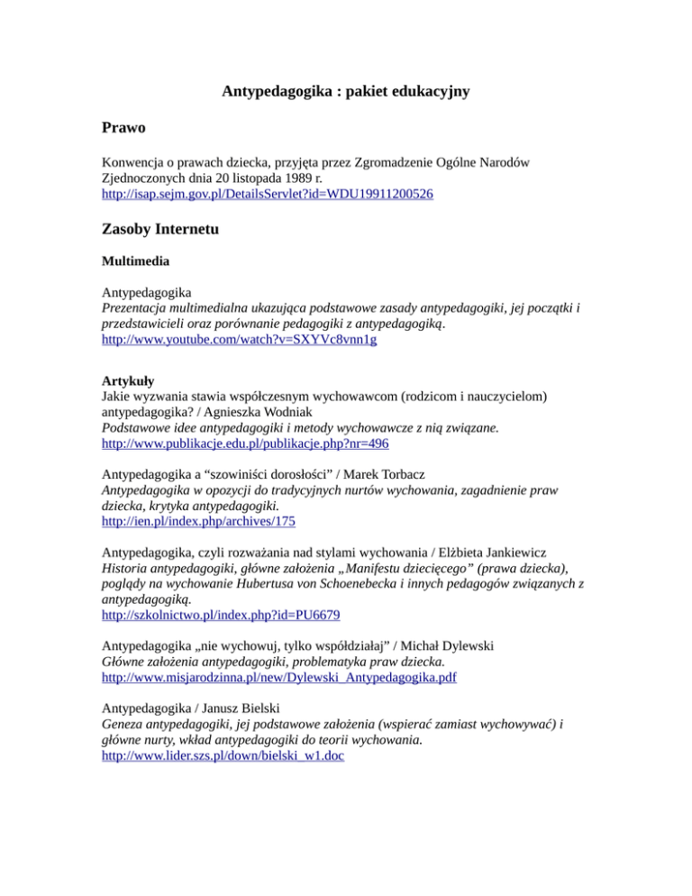 Antypedagogika : pakiet edukacyjny Prawo Konwencja o prawach dziecka, przyjęta przez Zgromadzenie Ogólne Narodów Zjednoczonych dnia 20 listopada 1989 r. http://isap.sejm.gov.pl/DetailsServlet?id=WDU19911200526 Zasoby Internetu Multimedia Antypedagogika Prezentacja multimedialna ukazująca podstawowe zasady antypedagogiki, jej początki i przedstawicieli oraz porównanie pedagogiki z antypedagogiką. http://www.youtube.com/watch?v=SXYVc8vnn1g Artykuły Jakie wyzwania stawia współczesnym wychowawcom (rodzicom i nauczycielom) antypedagogika? / Agnieszka Wodniak Podstawowe idee antypedagogiki i metody wychowawcze z nią związane. http://www.publikacje.edu.pl/publikacje.php?nr=496 Antypedagogika a “szowiniści dorosłości” / Marek Torbacz Antypedagogika w opozycji do tradycyjnych nurtów wychowania, zagadnienie praw dziecka, krytyka antypedagogiki. http://ien.pl/index.php/archives/175 Antypedagogika, czyli rozważania nad stylami wychowania / Elżbieta Jankiewicz Historia antypedagogiki, główne założenia „Manifestu dziecięcego” (prawa dziecka), poglądy na wychowanie Hubertusa von Schoenebecka i innych pedagogów związanych z antypedagogiką. http://szkolnictwo.pl/index.php?id=PU6679 Antypedagogika „nie wychowuj, tylko współdziałaj” / Michał Dylewski Główne założenia antypedagogiki, problematyka praw dziecka. http://www.misjarodzinna.pl/new/Dylewski_Antypedagogika.pdf Antypedagogika / Janusz Bielski Geneza antypedagogiki, jej podstawowe założenia (wspierać zamiast wychowywać) i główne nurty, wkład antypedagogiki do teorii wychowania. http://www.lider.szs.pl/down/bielski_w1.doc Antypedagogika Podstawowe założenia antypedagogiki, wychowywanie w jej duchu, psychologia dziecka. http://www.wolneszkoly.republika.pl/30.doc Antypedagogika. Być i wspierać zamiast wychowywać : przedmowa / Bogusław Śliwerski Wychowanie dziecka w świetle antypedagogiki – fragment przedmowy do książki Hubertusa von Schoenbecka. http://www.gandalf.com.pl/fragment/antypedagogika-byc-i-wspierac-zamiast/ Antypedagogika a realne dobro dziecka / Dariusz Zalewski http://www.rozwinskrzydla.info/pedagog-i-psycholog-radzi/antypedagogika-a-realnedobro-dziecka Dlaczego antypedagogika nie wychowuje? / Anna Dyl Geneza nurtu, tezy antypedagogiki a wychowanie. http://www.profesor.pl/publikacja,7011,Artykuly,Dlaczego-antypedagogika-niewychowuje Wychowanie, czy antywychowanie? Czy nurt antypedagogiki może obecnie stanowić alternatywę dla tradycyjnych metod wychowawczych? / Wiesława Grafowska Analiza twórczości Hubertusa von Schoenbecka. http://www.profesor.pl/publikacja,15333,Artykuly,Wychowanie-czy-antywychowanieCzy-nurt-antypedagogiki-moze-obecnie-stanowic-alternatywe-dla-tradycyjnych-metodwychowawczych Antypedagogika – co zamiast? / Barbara Kiereś Liberalizm w wychowaniu, krytyka antypedagogiki, antypedagogika a wartości. http://www.rodzinakatolicka.pl/index.php/publicystyka/5-komentarze/30583antypedagogika--co-zamiast Jakie jest spojrzenie na wychowanie przedstawicieli pedagogiki i antypedagogiki? / Danuta Voigt Porównanie pedagogiki i antypedagogiki pod kątem celów i metod wychowania, dobra dziecka i postaw rodziców. http://www.sp20gdynia.pl/articles.php?id=37 Antypedagogika wobec pedagogiki / Jan Niewęgłowski Początki antypedagogiki, emancypacja i równouprawnienie dzieci, Hubertus von Schoenebeck i prawa dziecka, „czarna pedagogika”, ocena założeń antypedagogiki. http://seminare.pl/pdf/tom11-10-nieweglowski.pdf Antypedagogiczne próby istnienia - czyli z drugiej strony wychowania... Wychowanie według założeń antypedagogiki, krytyka szkoły i nauczyciela w duchu antypedagogiki, szkoła Summerhill, system wychowania Alexandera Sutherlanda Neilla, koncepcja Alice Miller. http://www.maciekosuch.com/wp-content/uploads/2012/11/antypedagogiczne-prabyistnienia.doc Zestawienia bibliograficzne Antypedagogika / pedagogika alternatywna / Monika Woryna Wydawnictwa zwarte i artykuły z czasopism wydane do 2009 r. http://ftp.wom.edu.pl/biblioteka/wodzislaw/zestawienia %20bibliograficzne/antypedagogika.pdf Antypedagogika : zestawienie bibliograficzne za lata 1996-2007 / Artur Gumułka [i in.] Artykuły z czasopism i książek. http://www.wsp.krakow.pl/biblio/pliki/antypedagogika-bibliografia.html Bibliografia za lata 1992-2013 Bibliografia stanowi uzupełnienie zestawień bibliograficznych prezentowanych powyżej. Materiały są dostępne w Czytelni (cz) lub Wypożyczalni (w) Pedagogicznej Biblioteki Wojewódzkiej w Bielsku-Białej ul. Komorowicka 48. Książki: Antypedagogika : być i wspierać zamiast wychowywać / Hubertus von Schoenebeck. Warszawa : Jacek Santorski & CO. Agencja Wydaw, 1994. w 43141 Antypedagogika w dialogu : wprowadzenie w rozmyślanie antypedagogiczne / Hubertus von Schoenebeck ; przekł. [z niem.] Dorota Sztobryn. - Kraków : "Impuls", 1994. w 45064 Jaka może być szkoła? / Hubertus von Schoenebeck ; tł. [z niem.] i sł. wstępne Andrzej Murzyn. - Wyd. 2. - Kraków : "Impuls", 2009. w 62342 Postpedagogika : od antypedagogiki do Amication / Hubertus von Schoenebeck ; tł. Andrzej Murzyn. - Kraków : Oficyna Wydawnicza "Impuls", 2009. w 62350 Sprawcy i/lub ofiary działań pozornych w edukacji szkolnej / red. nauk. Maria Dudzikowa, Karina Knasiecka-Falbierska ; KNP Polska Akademia Nauk. - Kraków : Oficyna Wydawnicza "Impuls", 2013. w 67882 Wolność od wychowywania / Hubertus von Schoenebeck ; tł. Grzegorz Sowiński. Kraków : Oficyna Wydawnicza "Impuls", 2008. w 61442 Wyzwania pedagogiki krytycznej i antypedagogiki / Tomasz Szkudlarek, Bogusław Śliwerski. - [Wyd. 2 popr., rozsz.]. - Kraków : "Impuls", 1992. cz 43553 Wyzwania pedagogiki krytycznej i antypedagogiki / Tomasz Szkudlarek, Bogusław Śliwerski. - Wyd. 3 popr. - Kraków : "Impuls", 2000. w 49000; w 49047 Rozdziały z książek: 1. Neoromantyczne utopie Ivana Illicha / Hanna Zielińska.// W: Nieobecne dyskursy. Cz. 4. Toruń, 1994. - S. 62-78 cz 47176 2. "Niebezpieczne książki" 