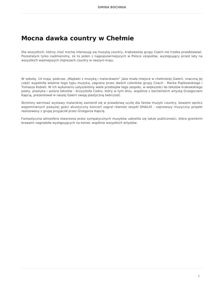GMINA BOCHNIA Mocna dawka country w Chełmie Dla wszystkich, którzy choć trochę interesują się muzyką country, krakowskiej grupy Coach nie trzeba przedstawiać. Pozostałym tylko nadmienimy, że to jeden z najpopularniejszych w Polsce zespołów, występujący przed laty na wszystkich ważniejszych imprezach country w naszym kraju. W sobotę, 14 maja, podczas „Majówki z muzyką i malarstwem” jaka miała miejsce w chełmskiej Galerii, znaczną jej część wypełniła właśnie tego typu muzyka, zagrana przez dwóch członków grupy Coach - Marka Piątkowskiego i Tomasza Kobieli. W ich wykonaniu usłyszeliśmy wiele przebojów tego zespołu, w większości do tekstów krakowskiego poety, plastyka i autora tekstów - Krzysztofa Cedro, który w tym dniu, wspólnie z bocheńskim artystą Grzegorzem Kapcią, prezentował w naszej Galerii swoją plastyczną twórczość. Skromny wernisaż wystawy malarskiej zamienił się w prawdziwą ucztę dla fanów muzyki country, bowiem oprócz wspomnianych powyżej gości akustyczny koncert zagrał również zespół OHALIO - najnowszy muzyczny projekt realizowany z grupą przyjaciół przez Grzegorza Kapcię. Fantastyczna atmosfera stworzona przez sympatycznych muzyków udzieliła się także publiczności, która gromkimi brawami nagrodziła występujących na koniec wspólnie wszystkich artystów. 1