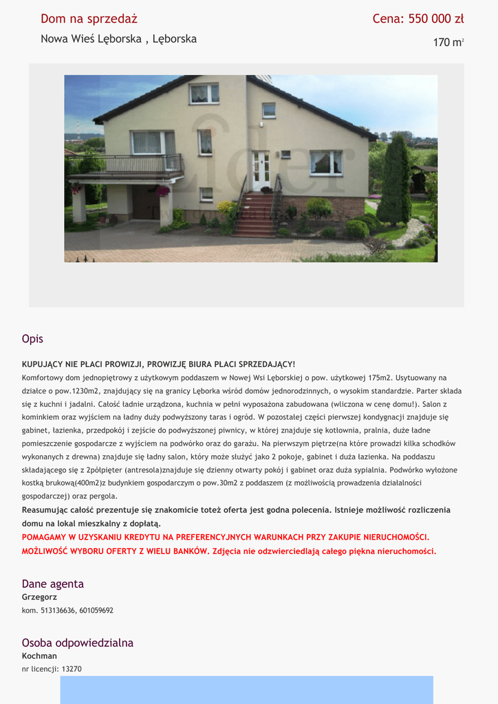Dom na sprzedaż Cena: 550 000 zł Nowa Wieś Lęborska , Lęborska 170 m 2 Opis KUPUJĄCY NIE PŁACI PROWIZJI, PROWIZJĘ BIURA PŁACI SPRZEDAJĄCY! Komfortowy dom jednopiętrowy z użytkowym poddaszem w Nowej Wsi Lęborskiej o pow. użytkowej 175m2. Usytuowany na działce o pow.1230m2, znajdujący się na granicy Lęborka wśród domów jednorodzinnych, o wysokim standardzie. Parter składa się z kuchni i jadalni. Całość ładnie urządzona, kuchnia w pełni wyposażona zabudowana (wliczona w cenę domu!). Salon z kominkiem oraz wyjściem na ładny duży podwyższony taras i ogród. W pozostałej części pierwszej kondygnacji znajduje się gabinet, łazienka, przedpokój i zejście do podwyższonej piwnicy, w której znajduje się kotłownia, pralnia, duże ładne pomieszczenie gospodarcze z wyjściem na podwórko oraz do garażu. Na pierwszym piętrze(na które prowadzi kilka schodków wykonanych z drewna) znajduje się ładny salon, który może służyć jako 2 pokoje, gabinet i duża łazienka. Na poddaszu składającego się z 2półpięter (antresola)znajduje się dzienny otwarty pokój i gabinet oraz duża sypialnia. Podwórko wyłożone kostką brukową(400m2)z budynkiem gospodarczym o pow.30m2 z poddaszem (z możliwością prowadzenia działalności gospodarczej) oraz pergola. Reasumując całość prezentuje się znakomicie toteż oferta jest godna polecenia. Istnieje możliwość rozliczenia domu na lokal mieszkalny z dopłatą. POMAGAMY W UZYSKANIU KREDYTU NA PREFERENCYJNYCH WARUNKACH PRZY ZAKUPIE NIERUCHOMOŚCI. MOŻLIWOŚĆ WYBORU OFERTY Z WIELU BANKÓW. Zdjęcia nie odzwierciedlają całego piękna nieruchomości. Dane agenta Grzegorz kom. 513136636, 601059692 Osoba odpowiedzialna Kochman nr licencji: 13270 Szczegóły Symbol oferty Lokalizacja Pow. całkowita [m2] Ilość pokoi Cena Nieruchomość LID‐DS‐7318 Nowa Wieś Lęborska, Lęborska 170,00 m² 7 550 000 PLN Technologia budowlana Garaż w budynku Okna nowe PCV Instalacje Balkon Ilość balkonów Powierzchnia działki [m2] Pomieszczenia Ilość pokoi Zagosp. działki 7 cegła kratówka Ukształtowanie działki Kształt działki Rodzaj domu Pokrycie dachu Pozwolenie na użytkowanie Stan budynku Podpiwniczenie Ogrodzenie działki Plac zabaw Woda Dojazd wymienione duży 2 1 230 m² zagospodarowana płaska prostokąt wolnostojący dachówka ceramiczna tak do zamieszkania nie frontowe kute nie tak ‐ miejska asfalt Otoczenie działki zabudowane Ogrzewanie własne dla budynku Alarm nie Winda nie Tarasy taras duży Ilość tarasów 2 Drzwi antywłamaniowe nie Prąd tak Kanalizacja na działce