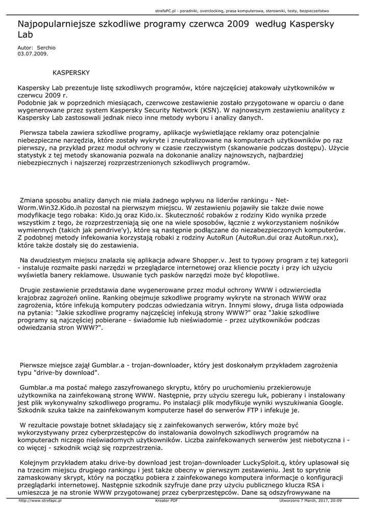 strefaPC.pl - poradniki, overclocking, prasa komputerowa, sterowniki, testy, bezpieczeństwo Najpopularniejsze szkodliwe programy czerwca 2009 według Kaspersky Lab Autor: Serchio 03.07.2009. KASPERSKY Kaspersky Lab prezentuje listę szkodliwych programów, które najczęściej atakowały użytkowników w czerwcu 2009 r. Podobnie jak w poprzednich miesiącach, czerwcowe zestawienie zostało przygotowane w oparciu o dane wygenerowane przez system Kaspersky Security Network (KSN). W najnowszym zestawieniu analitycy z Kaspersky Lab zastosowali jednak nieco inne metody wyboru i analizy danych. Pierwsza tabela zawiera szkodliwe programy, aplikacje wyświetlające reklamy oraz potencjalnie niebezpieczne narzędzia, które zostały wykryte i zneutralizowane na komputerach użytkowników po raz pierwszy, na przykład przez moduł ochrony w czasie rzeczywistym (skanowanie podczas dostępu). Użycie statystyk z tej metody skanowania pozwala na dokonanie analizy najnowszych, najbardziej niebezpiecznych i najszerzej rozprzestrzenionych szkodliwych programów. Zmiana sposobu analizy danych nie miała żadnego wpływu na liderów rankingu - NetWorm.Win32.Kido.ih pozostał na pierwszym miejscu. W zestawieniu pojawiły sie także dwie nowe modyfikacje tego robaka: Kido.jq oraz Kido.ix. Skuteczność robaków z rodziny Kido wynika przede wszystkim z tego, że rozprzestrzeniają się one na wiele sposobów, łącznie z wykorzystaniem nośników wymiennych (takich jak pendrive'y), które są następnie podłączane do niezabezpieczonych komputerów. Z podobnej metody infekowania korzystają robaki z rodziny AutoRun (AutoRun.dui oraz AutoRun.rxx), które także dostały się do zestawienia. Na dwudziestym miejscu znalazła się aplikacja adware Shopper.v. Jest to typowy program z tej kategorii - instaluje rozmaite paski narzędzi w przeglądarce internetowej oraz kliencie poczty i przy ich użyciu wyświetla banery reklamowe. Usuwanie tych pasków narzędzi może być kłopotliwe. Drugie zestawienie przedstawia dane wygenerowane przez moduł ochrony WWW i odzwierciedla krajobraz zagrożeń online. Ranking obejmuje szkodliwe programy wykryte na stronach WWW oraz zagrożenia, które infekują komputery podczas odwiedzania witryn. Innymi słowy, druga lista odpowiada na pytania: "Jakie szkodliwe programy najczęściej infekują strony WWW?" oraz "Jakie szkodliwe programy są najczęściej pobierane - świadomie lub nieświadomie - przez użytkowników podczas odwiedzania stron WWW?". Pierwsze miejsce zajął Gumblar.a - trojan-downloader, który jest doskonałym przykładem zagrożenia typu "drive-by download". Gumblar.a ma postać małego zaszyfrowanego skryptu, który po uruchomieniu przekierowuje użytkownika na zainfekowaną stronę WWW. Następnie, przy użyciu szeregu luk, pobierany i instalowany jest plik wykonywalny szkodliwego programu. Po instalacji plik modyfikuje wyniki wyszukiwania Google. Szkodnik szuka także na zainfekowanym komputerze haseł do serwerów FTP i infekuje je. W rezultacie powstaje botnet składający się z zainfekowanych serwerów, który może być wykorzystywany przez cyberprzestępców do instalowania dowolnych szkodliwych programów na komputerach niczego nieświadomych użytkowników. Liczba zainfekowanych serwerów jest niebotyczna i co więcej - szkodnik wciąż się rozprzestrzenia. Kolejnym przykładem ataku drive-by download jest trojan-downloader LuckySploit.q, który uplasował się na trzecim miejscu drugiego rankingu i jest także obecny w pierwszym zestawieniu. Jest to sprytnie zamaskowany skrypt, który na początku pobiera z zainfekowanego komputera informacje o konfiguracji przeglądarki internetowej. Następnie szkodnik szyfruje dane przy użyciu publicznego klucza RSA i umieszcza je na stronie WWW przygotowanej przez cyberprzestępców. Dane są odszyfrowywane na http://www.strefapc.pl Kreator PDF Utworzono 7 March, 2017, 20:09 strefaPC.pl - poradniki, overclocking, prasa komputerowa, sterowniki, testy, bezpieczeństwo serwerze z użyciem prywatnego klucza RSA a do użytkownika trafia odpowiedni zestaw skryptów (z zależności od zainstalowanej przeglądarki). Skrypty te wykorzystują luki atakowanego komputera i pobierają szkodliwe programy. Takie wieloetapowe podejście znacznie utrudnia analizę oryginalnego skryptu, który pobiera informacje o przeglądarce: jeżeli serwer odszyfrowujący dane jest niedostępny, wykrycie konkretnych skryptów trafiających na atakowany komputer staje się niemożliwe. Wiele szkodliwych programów wykorzystuje luki w aplikacjach różnych producentów. Obecność w rankingu takich exploitów jak Trojan-Clicker.SWF.Small.b, Exploit.JS.Pdfka.gu, Exploit.JS.Pdfka.lr czy Exploit.SWF.Agent.az świadczy zarówno o popularności aplikacji Adobe Flash Player oraz Adobe Reader, jak i o ilości luk w tych programach. Luki w produktach Microsoftu także są intensywnie wykorzystywane przez cyberprzestępców: sam Trojan-Downloader.JS.Major.c wykorzystuje szereg błędów w zabezpieczeniach różnych wersji systemu Windows oraz pakietu Microsoft Office. Coraz wyraźniejszy staje się trend wykorzystywania przez cyberprzestępców zestawu zaawansowanych ataków drive-by download do instalowania szkodliwych programów na komputerach atakowanych użytkowników. Można powiedzieć, że ataki cyberprzestępcze są coraz bardziej zorientowane na WWW. Jednocześnie, coraz ważniejsze staje się uaktualnianie systemów operacyjnych i użytkowanych aplikacji. Na koniec czerwcowego raportu nowość - zestawienie krajów, z których pochodzi najwięcej prób infekowania komputerów przez Internet. http://www.strefapc.pl Kreator PDF Utworzono 7 March, 2017, 20:09