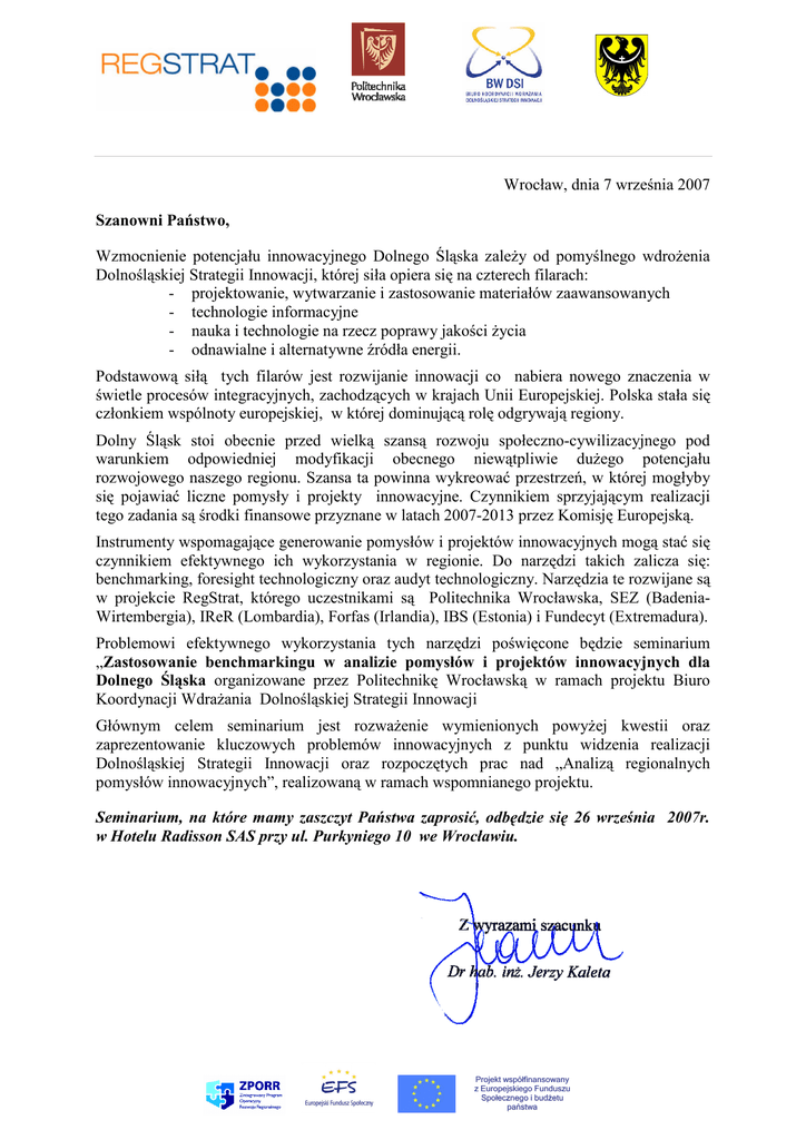 Wrocław, dnia 7 września 2007 Szanowni Państwo, Wzmocnienie potencjału innowacyjnego Dolnego Śląska zależy od pomyślnego wdrożenia Dolnośląskiej Strategii Innowacji, której siła opiera się na czterech filarach: - projektowanie, wytwarzanie i zastosowanie materiałów zaawansowanych - technologie informacyjne - nauka i technologie na rzecz poprawy jakości życia - odnawialne i alternatywne źródła energii. Podstawową siłą tych filarów jest rozwijanie innowacji co nabiera nowego znaczenia w świetle procesów integracyjnych, zachodzących w krajach Unii Europejskiej. Polska stała się członkiem wspólnoty europejskiej, w której dominującą rolę odgrywają regiony. Dolny Śląsk stoi obecnie przed wielką szansą rozwoju społeczno-cywilizacyjnego pod warunkiem odpowiedniej modyfikacji obecnego niewątpliwie dużego potencjału rozwojowego naszego regionu. Szansa ta powinna wykreować przestrzeń, w której mogłyby się pojawiać liczne pomysły i projekty innowacyjne. Czynnikiem sprzyjającym realizacji tego zadania są środki finansowe przyznane w latach 2007-2013 przez Komisję Europejską. Instrumenty wspomagające generowanie pomysłów i projektów innowacyjnych mogą stać się czynnikiem efektywnego ich wykorzystania w regionie. Do narzędzi takich zalicza się: benchmarking, foresight technologiczny oraz audyt technologiczny. Narzędzia te rozwijane są w projekcie RegStrat, którego uczestnikami są Politechnika Wrocławska, SEZ (BadeniaWirtembergia), IReR (Lombardia), Forfas (Irlandia), IBS (Estonia) i Fundecyt (Extremadura). Problemowi efektywnego wykorzystania tych narzędzi poświęcone będzie seminarium „Zastosowanie benchmarkingu w analizie pomysłów i projektów innowacyjnych dla Dolnego Śląska organizowane przez Politechnikę Wrocławską w ramach projektu Biuro Koordynacji Wdrażania Dolnośląskiej Strategii Innowacji Głównym celem seminarium jest rozważenie wymienionych powyżej kwestii oraz zaprezentowanie kluczowych problemów innowacyjnych z punktu widzenia realizacji Dolnośląskiej Strategii Innowacji oraz rozpoczętych prac nad „Analizą regionalnych pomysłów innowacyjnych”, realizowaną w ramach wspomnianego projektu. Seminarium, na które mamy zaszczyt Państwa zaprosić, odbędzie się 26 września 2007r. w Hotelu Radisson SAS przy ul. Purkyniego 10 we Wrocławiu. Projekt współfinansowany z Europejskiego Funduszu Społecznego i budżetu państwa