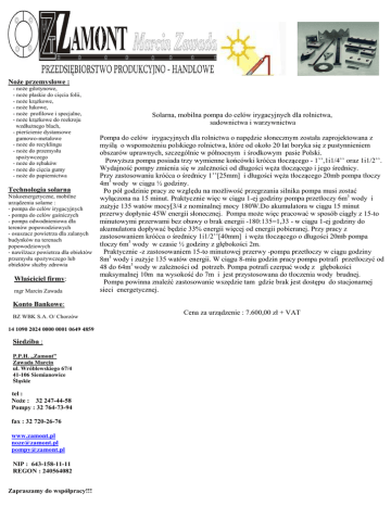 Noże przemysłowe : - noże gilotynowe, - noże płaskie do cięcia folii, - noże krążkowe, - noże łukowe, - noże profilowe i specjalne, - noże krążkowe do rozkroju wzdłużnego blach, - pierścienie dystansowe gumowo-metalowe - noże do recyklingu - noże do przemysłu spożywczego - noże do rębaków - noże do cięcia gumy - noże do papiernictwa Technologia solarna Niskoenergetyczne, mobilne urządzenia solarne : - pompa do celów irygacyjnych - pompa do celów gaśniczych - pompa odwodnieniowa dla terenów popowodziowych - osuszacz powietrza dla zalanych budynków na terenach popowodziowych - nawilżacz powietrza dla obiektów przemysłu spożywczego lub obiektów służby zdrowia Właściciel firmy: mgr Marcin Zawada Solarna, mobilna pompa do celów irygacyjnych dla rolnictwa, sadownictwa i warzywnictwa Pompa do celów irygacyjnych dla rolnictwa o napędzie słonecznym została zaprojektowana z myślą o wspomożeniu polskiego rolnictwa, które od około 20 lat boryka się z pustynnieniem obszarów uprawnych, szczególnie w północnym i środkowym pasie Polski. Powyższa pompa posiada trzy wymienne końcówki króćca tłoczącego - 1’’,1i1/4’’ oraz 1i1/2’’. Wydajność pompy zmienia się w zależności od długości węża tłoczącego i jego średnicy. Przy zastosowaniu króćca o średnicy 1’’[25mm] i długości węża tłoczącego 20mb pompa tłoczy 4m3 wody w ciągu ½ godziny. Po pół godzinie pracy ze względu na możliwość przegrzania silnika pompa musi zostać wyłączona na 15 minut. Praktycznie więc w ciągu 1-ej godziny pompa przetłoczy 6m3 wody i zużyje 135 watów mocy[3/4 z nominalnej mocy 180W.Do akumulatora w ciągu 15 minut przerwy dopłynie 45W energii słonecznej. Pompa może więc pracować w sposób ciągły z 15-to minutowymi przerwami bez obawy o brak energii -180:135=1,33 - w ciągu 1-ej godziny do akumulatora dopływać będzie 33% energii więcej od energii pobieranej. Przy pracy z zastosowaniem króćca o średnicy 1i1/2’’[40mm] i węża tłoczącego o długości 20mb pompa tłoczy 6m3 wody w czasie ½ godziny z głębokości 2m. Praktycznie -z zastosowaniem 15-to minutowej przerwy -pompa przetłoczy w ciągu godziny 8m3 wody i zużyje 135 watów energii. W ciągu 8-miu godzin pracy pompa potrafi przetłoczyć od 48 do 64m3 wody w zależności od potrzeb. Pompa potrafi czerpać wodę z głębokości maksymalnej 10m na wysokość do 7m i jest przystosowana do tłoczenia wody brudnej. Pompa powinna znaleźć zastosowanie wszędzie tam gdzie brak jest dostępu do stacjonarnej sieci energetycznej. Konto Bankowe: BZ WBK S.A. O/ Chorzów 14 1090 2024 0000 0001 0649 4859 Siedziba : P.P.H. „Zamont” Zawada Marcin ul. Wróblewskiego 67/4 41-106 Siemianowice Śląskie tel : Noże : 32 247-44-58 Pompy : 32 764-73-94 fax : 32 720-26-76 www.zamont.pl [email protected] [email protected] NIP : 643-158-11-11 REGON : 240564082 Zapraszamy do współpracy!!! Cena za urządzenie : 7.600,00 zł + VAT