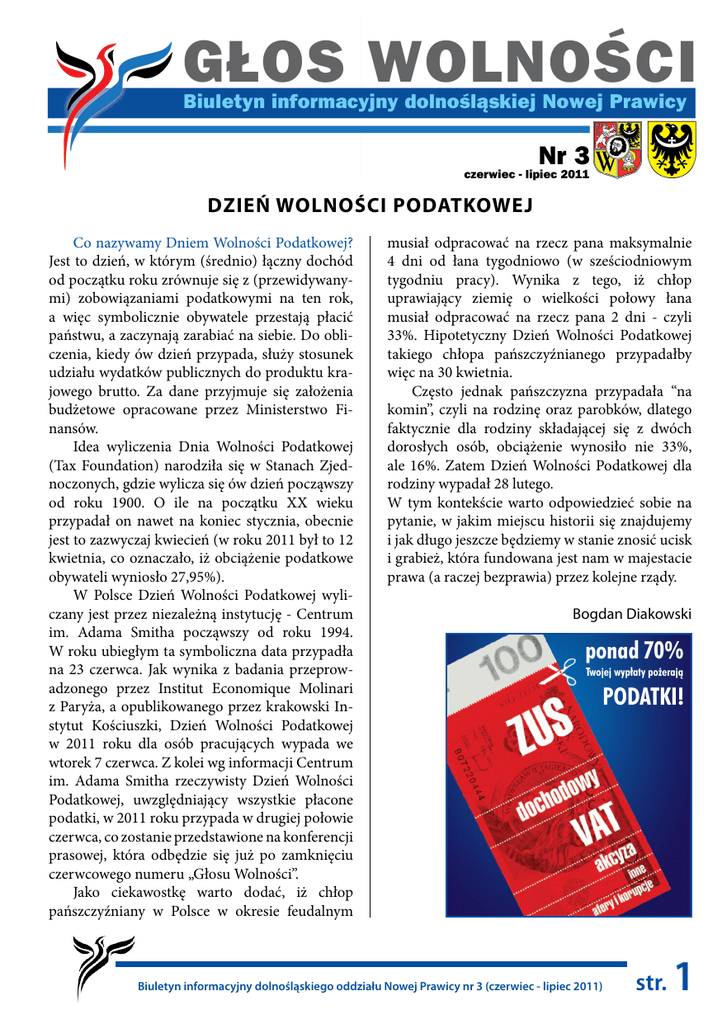 GŁOS WOLNOŚCI Biuletyn informacyjny dolnośląskiej Nowej Prawicy Nr 3 czerwiec - lipiec 2011 DZIEŃ WOLNOŚCI PODATKOWEJ Co nazywamy Dniem Wolności Podatkowej? Jest to dzień, w którym (średnio) łączny dochód od początku roku zrównuje się z (przewidywanymi) zobowiązaniami podatkowymi na ten rok, a więc symbolicznie obywatele przestają płacić państwu, a zaczynają zarabiać na siebie. Do obliczenia, kiedy ów dzień przypada, służy stosunek udziału wydatków publicznych do produktu krajowego brutto. Za dane przyjmuje się założenia budżetowe opracowane przez Ministerstwo Finansów. Idea wyliczenia Dnia Wolności Podatkowej (Tax Foundation) narodziła się w Stanach Zjednoczonych, gdzie wylicza się ów dzień począwszy od roku 1900. O ile na początku XX wieku przypadał on nawet na koniec stycznia, obecnie jest to zazwyczaj kwiecień (w roku 2011 był to 12 kwietnia, co oznaczało, iż obciążenie podatkowe obywateli wyniosło 27,95%). W Polsce Dzień Wolności Podatkowej wyliczany jest przez niezależną instytucję - Centrum im. Adama Smitha począwszy od roku 1994. W roku ubiegłym ta symboliczna data przypadła na 23 czerwca. Jak wynika z badania przeprowadzonego przez Institut Economique Molinari z Paryża, a opublikowanego przez krakowski Instytut Kościuszki, Dzień Wolności Podatkowej w 2011 roku dla osób pracujących wypada we wtorek 7 czerwca. Z kolei wg informacji Centrum im. Adama Smitha rzeczywisty Dzień Wolności Podatkowej, uwzględniający wszystkie płacone podatki, w 2011 roku przypada w drugiej połowie czerwca, co zostanie przedstawione na konferencji prasowej, która odbędzie się już po zamknięciu czerwcowego numeru „Głosu Wolności”. Jako ciekawostkę warto dodać, iż chłop pańszczyźniany w Polsce w okresie feudalnym musiał odpracować na rzecz pana maksymalnie 4 dni od łana tygodniowo (w sześciodniowym tygodniu pracy). Wynika z tego, iż chłop uprawiający ziemię o wielkości połowy łana musiał odpracować na rzecz pana 2 dni - czyli 33%. Hipotetyczny Dzień Wolności Podatkowej takiego chłopa pańszczyźnianego przypadałby więc na 30 kwietnia. Często jednak pańszczyzna przypadała “na komin”, czyli na rodzinę oraz parobków, dlatego faktycznie dla rodziny składającej się z dwóch dorosłych osób, obciążenie wynosiło nie 33%, ale 16%. Zatem Dzień Wolności Podatkowej dla rodziny wypadał 28 lutego. W tym kontekście warto odpowiedzieć sobie na pytanie, w jakim miejscu historii się znajdujemy i jak długo jeszcze będziemy w stanie znosić ucisk i grabież, która fundowana jest nam w majestacie prawa (a raczej bezprawia) przez kolejne rządy. Bogdan Diakowski ponad 70% Twojej wypłaty pożerają PODATKI! Biuletyn informacyjny dolnośląskiego oddziału Nowej Prawicy nr 3 (czerwiec - lipiec 2011) str. 1 Umowa gazowa czy zdrada narodowa? W czasie rządów koalicji PO i PSL słowa „interes narodowy” straciły jakiekolwiek znaczenie. Mamy natomiast do czynienia z działaniami ograniczającymi suwerenność energetyczną i gospodarczą naszego kraju. Najstraszniejszym przykładem jest podpisana przez Tuska i Pawlaka nowa umowa gazowa z Rosją. Posunięcia tego rządu ewidentnie wskazują na działanie na szkodę własnego kraju, a więc słowa „zdrada narodowa” są jak najbardziej na miejscu. Przejdźmy jednak do meritum problemu. Tusk i minister skarbu Aleksander Grad w styczniu 2010 r. wyrazili zgodę na umorzenie 1,2 miliarda złotych długu Rosjan wobec Polski z tytułu niedopłaty za przesył gazu przez nasze terytorium. 27 stycznia potwierdził to wspólny komunikat, SKANDAL! Drugim skandalicznym ruchem w kierunku uzależnienia nas od Rosji było dokonanie zmiany w podziale udziałów w spółce EuRoPol Gaz S.A. Po 50% dla każdej ze stron. Do tej pory Polska miała pełną kontrolę nad tą spółką przez większość reprezentującą Polskie interesy. Podpisana umowa określa ilość gazu, której nasz kraj nie potrzebuje- jest zbyt duża.Będziemy str. 2 musieli nadwyżki przechowywać i magazynować. W ten sposób niepotrzebne będą dostawy gazu z Norwegii, co likwiduje dywersyfikację dostaw i wprost uzależnia nas od Rosji. Jeszcze w 1993 r. umowa z Rosją gwarantowała, że nadwyżka gazu z Rosji nie będzie sprzedawana do innych krajów. Kto o zdrowych zmysłach podpisuje takie umowy, czy agenci Moskwy wciąż mają aż tyle do powiedzenia w naszym kraju? Jest to wprost nie do uwierzenia, jak można sprzedać Polskę, ciekawe tylko za jaką cenę? Jako ciekawostkę bez komentarza podaję informację o cenach gazu z Rosji dla poszczególnych krajów europejskich. Niech te stawki same za siebie odpowiedzą, kto nas reprezentuje albo może kogo reprezentuje obecny obóz władzy. Na pewno nie interes narodowy Polski. Ceny rosyjskiego gazu w 2010 roku: Wielka Brytania- 191 USD za 1000 m3 Niemcy i Finlandia- 271 USD za 1000 m3 Francja- 306 USD za 1000 m3 Włochy- 331 USD za 1000 m3 Polska- 336 USD za 1000 m3 Biuletyn informacyjny dolnośląskiego oddziału Nowej Prawicy nr 3 (czerwiec - lipiec 2011) Rafał Merski Czy państwo powinno dotować sztukę? Wiele można powiedzieć za i przeciw. Dla poparcia systemu dotacji wypada stwierdzić, że sztuka uwzniośla duszę narodu, odrywa ją od trosk materialnych, daje zmysł piękna i w ten sposób wpływa korzystnie na jego zwyczaje, moralność, a nawet gospodarkę. Można zadać sobie pytanie – czy bez dotacji sztuka w ogóle by istniała? Czy wtedy w Polsce kręcenie filmów, działalność teatrów i galerii byłaby w ogóle opłacalna? Potrzeby ludzkie i wymagania rosną i stają się coraz bardziej wyrafinowane, w miarę jak społeczeństwo staje się coraz bardziej zamożne. Potrzeba kultury jest dobrem wyższego rzędu, czyli takim bez zaspokojenia którego człowiek może spokojnie żyć. Więc tu nasuwa się pytanie – czy rząd może zmniejszać przez to płacę robotnika na rzecz aktora, czyli opodatkować obywatela, aby do