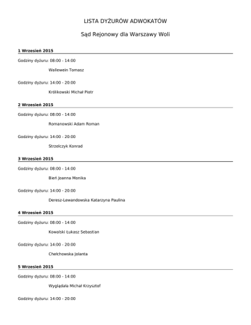 LISTA DYŻURÓW ADWOKATÓW Sąd Rejonowy dla Warszawy Woli 1 Wrzesień 2015 Godziny dyżuru: 08:00 - 14:00 Wallewein Tomasz Godziny dyżuru: 14:00 - 20:00 Królikowski Michał Piotr 2 Wrzesień 2015 Godziny dyżuru: 08:00 - 14:00 Romanowski Adam Roman Godziny dyżuru: 14:00 - 20:00 Strzelczyk Konrad 3 Wrzesień 2015 Godziny dyżuru: 08:00 - 14:00 Bień Joanna Monika Godziny dyżuru: 14:00 - 20:00 Deresz-Lewandowska Katarzyna Paulina 4 Wrzesień 2015 Godziny dyżuru: 08:00 - 14:00 Kowalski Łukasz Sebastian Godziny dyżuru: 14:00 - 20:00 Chełchowska Jolanta 5 Wrzesień 2015 Godziny dyżuru: 08:00 - 14:00 Wyglądała Michał Krzysztof Godziny dyżuru: 14:00 - 20:00 Opalska Hanna Urszula 6 Wrzesień 2015 Godziny dyżuru: 08:00 - 14:00 Guzek Kamil Ireneusz Godziny dyżuru: 14:00 - 20:00 Bednarz Mikołaj Bartosz 7 Wrzesień 2015 Godziny dyżuru: 08:00 - 14:00 Dąbrowski Jarosław Marek Godziny dyżuru: 14:00 - 20:00 Grabowska Patrycja 8 Wrzesień 2015 Godziny dyżuru: 08:00 - 14:00 Ochotnicki Dominik Godziny dyżuru: 14:00 - 20:00 Iwaniak-Jeziorowska Monika Izabela 9 Wrzesień 2015 Godziny dyżuru: 08:00 - 14:00 Ponikowska Bernadetta Karolina Godziny dyżuru: 14:00 - 20:00 Manteuffel Katarzyna Ewa 10 Wrzesień 2015 Godziny dyżuru: 08:00 - 14:00 Demecki Adam Godziny dyżuru: 14:00 - 20:00 Dobrucka Karen 11 Wrzesień 2015 Godziny dyżuru: 08:00 - 14:00 Pietruszkiewicz Tomasz Janusz Godziny dyżuru: 14:00 - 20:00 Barański Tymoteusz Jan 12 Wrzesień 2015 Godziny dyżuru: 08:00 - 14:00 Belowska-Sroka Anna Godziny dyżuru: 14:00 - 20:00 Dzido Agnieszka 13 Wrzesień 2015 Godziny dyżuru: 08:00 - 14:00 Łoziński Zygmunt Jerzy Godziny dyżuru: 14:00 - 20:00 Michalski Mariusz Michał 14 Wrzesień 2015 Godziny dyżuru: 08:00 - 14:00 Miechowska-Ostatek Magdalena Godziny dyżuru: 14:00 - 20:00 Gajewska-Kraczkowska Hanna Maria 15 Wrzesień 2015 Godziny dyżuru: 08:00 - 14:00 Buchlińska Monika Maria Godziny dyżuru: 14:00 - 20:00 Rybicka Beata Kinga 16 Wrzesień 2015 Godziny dyżuru: 08:00 - 14:00 Adamska-Kolupa Maria Teresa Godziny dyżuru: 14:00 - 20:00 Maciejczyk Rafał 17 Wrzesień 2015 Godziny dyżuru: 08:00 - 14:00 Najder Przemysław Godziny dyżuru: 14:00 - 20:00 Marciniak Bogumił Dominik 18 Wrzesień 2015 Godziny dyżuru: 08:00 - 14:00 Wasilewski Paweł Godziny dyżuru: 14:00 - 20:00 Dębska-Koniecek Marcjanna Katarzyna 19 Wrzesień 2015 Godziny dyżuru: 08:00 - 14:00 Dybka Rafał Godziny dyżuru: 14:00 - 20:00 Obrączka Erazm Mieczysław 20 Wrzesień 2015 Godziny dyżuru: 08:00 - 14:00 Orlikowski Marcin Rafał Godziny dyżuru: 14:00 - 20:00 Dziurdź Wojciech Karol 21 Wrzesień 2015 Godziny dyżuru: 08:00 - 14:00 Wolak Grzegorz Marcin Godziny dyżuru: 14:00 - 20:00 Stępiński Krzysztof 22 Wrzesień 2015 Godziny dyżuru: 08:00 - 14:00 Wadowska Lilianna Aleksandra Godziny dyżuru: 14:00 - 20:00 Chmielewska Marta Małgorzata 23 Wrzesień 2015 Godziny dyżuru: 08:00 - 14:00 Adamczyk Joanna Ewa Godziny dyżuru: 14:00 - 20:00 Wietrzykowska Małgorzata Ewa 24 Wrzesień 2015 Godziny dyżuru: 08:00 - 14:00 Borowiec Tomasz Godziny dyżuru: 14:00 - 20:00 Matusiak Arkadiusz Norbert 25 Wrzesień 2015 Godziny dyżuru: 08:00 - 14:00 Domagalski Maciej Dominik Godziny dyżuru: 14:00 - 20:00 Stefanowicz Jan Andrzej 26 Wrzesień 2015 Godziny dyżuru: 08:00 - 14:00 Korzycka-Pyzel Anna Maria Godziny dyżuru: 14:00 - 20:00 Sobechowicz-Osińska Marta 27 Wrzesień 2015 Godziny dyżuru: 08:00 - 14:00 Jachowicz Ewa Godziny dyżuru: 14:00 - 20:00 Czyżyk-Przygoda Izabela 28 Wrzesień 2015 Godziny dyżuru: 08:00 - 14:00 Skrzypek Michał Piotr Godziny dyżuru: 14:00 - 20:00 Mikołajewicz Sławomir Grzegorz 29 Wrzesień 2015 Godziny dyżuru: 08:00 - 14:00 Konarska Anna Maria Godziny dyżuru: 14:00 - 20:00 Gruszczyński Bartłomiej 30 Wrzesień 2015 Godziny dyżuru: 08:00 - 14:00 Michalski Robert Godziny dyżuru: 14:00 - 20:00 Lasocka Dagmara 1 Październik 2015 Godziny dyżuru: 08:00 - 14:00 Malinowski Andrzej Franciszek Godziny dyżuru: 14:00 - 20:00 Wawrzyńska Anna Magdalena 2 Październik 2015 Godziny dyżuru: 08:00 - 14:00 Orzechowska Sandra Katarzyna Godziny dyżuru: 14:00 - 20:00 Pakosz Marcin Tomasz 3 Październik 2015 Godziny dyżuru: 08:00 - 14:00 Kosiorek Filip Andrzej Godziny dyżuru: 14:00 - 20:00 Krok Kamil Krzysztof 4 Październik 2015 Godziny dyżuru: 08:00 - 14:00 Arabska Adrianna Godziny dyżuru: 14:00 - 20:00 Najda-Krocz Agnieszka Maria 5 Październik 2015 Godziny dyżuru: 08:00 - 14:00 Rybak Łukasz Godziny dyżuru: 14:00 - 20:00 Niewęgłowska Iwona 6 Październik 2015 Godziny dyżuru: 08:00 - 14:00 Łapińska Joanna Godziny dyżuru: 14:00 - 20:00 Małek Agnieszka 7 Październik 2015 Godziny dyżuru: 08:00 - 14:00 Chyl-Ziętara Joanna Renata Godziny dyżuru: 14:00 - 20:00 Dulniak Marek 8 Październik 2015 Godziny dyżuru: 08:00 - 14:00 Waleriańczyk Emilia Zuzanna Godziny dyżuru: 14:00 - 20:00 Urbanek Piotr Paweł 9 Październik 2015 Godziny dyżuru: 08:00 - 14:00 Podlasiewicz Grzegorz Robert Godziny dyżuru: 14:00 - 20:00 Ociepka Wiesław Marian 10 Październik 2015 Godziny dyżuru: 08:00 - 14:00 Ostaszewski Paweł Godziny dyżuru: 14:00 - 20:00 Pawełczak Magdalena Karina 11 Październik 2015 Godziny dyżuru: 08:00 - 14:00 Dyl Mieszko Ziemowit Godziny dyżuru: 14:00 - 20:00 Szczęsny Kamil Cyryl 12 Październik 2015 Godziny dyżuru: 08:00 - 14:00 Jachowicz Adam Godziny dyżuru: 14:00 - 20:00 Królik Kajetan Izydor 13 Październik 2015 Godziny dyżuru: 08:00 - 14:00 Stanisławski Mikołaj Jerzy Godziny dyżuru: 14:00 - 20:00 Sozański Krzysztof Wierzyn 14 Październik 2015 Godziny dyżuru: 08:00 - 14:00 Antoniewicz Artur Godziny dyżuru: 14:00 - 20:00 Lederman Paweł 15 Październik 2015 Godziny dyżuru: 08:00 - 14:00 Sygniewicz Maria Magdalena Godziny dyżuru: 14:00 - 20:00 Gryz-Kacprowicz Dominika 16 Październik 2015 Godziny dyżuru: 08:00 - 14:00 Szczygielska Izabela Maria Godziny dyżuru: 14:00 - 20:00 Chmielewska-Ciż Ada Anna 17 Październik 2015 Godziny dyżuru: 08:00 - 14:00 Dębała Micha