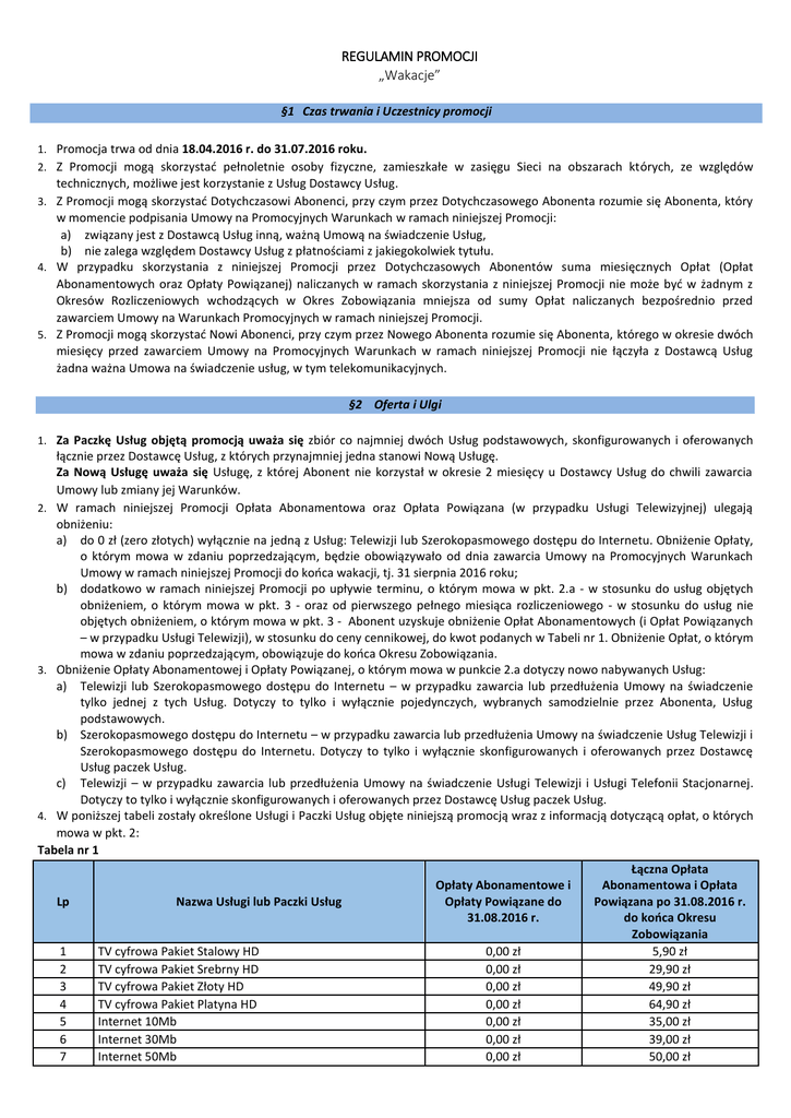 REGULAMIN PROMOCJI „Wakacje” §1 Czas trwania i Uczestnicy promocji 1. Promocja trwa od dnia 18.04.2016 r. do 31.07.2016 roku. 2. Z Promocji mogą skorzystać pełnoletnie osoby fizyczne, zamieszkałe w zasięgu Sieci na obszarach których, ze względów technicznych, możliwe jest korzystanie z Usług Dostawcy Usług. 3. Z Promocji mogą skorzystać Dotychczasowi Abonenci, przy czym przez Dotychczasowego Abonenta rozumie się Abonenta, który w momencie podpisania Umowy na Promocyjnych Warunkach w ramach niniejszej Promocji: a) związany jest z Dostawcą Usług inną, ważną Umową na świadczenie Usług, b) nie zalega względem Dostawcy Usług z płatnościami z jakiegokolwiek tytułu. 4. W przypadku skorzystania z niniejszej Promocji przez Dotychczasowych Abonentów suma miesięcznych Opłat (Opłat Abonamentowych oraz Opłaty Powiązanej) naliczanych w ramach skorzystania z niniejszej Promocji nie może być w żadnym z Okresów Rozliczeniowych wchodzących w Okres Zobowiązania mniejsza od sumy Opłat naliczanych bezpośrednio przed zawarciem Umowy na Warunkach Promocyjnych w ramach niniejszej Promocji. 5. Z Promocji mogą skorzystać Nowi Abonenci, przy czym przez Nowego Abonenta rozumie się Abonenta, którego w okresie dwóch miesięcy przed zawarciem Umowy na Promocyjnych Warunkach w ramach niniejszej Promocji nie łączyła z Dostawcą Usług żadna ważna Umowa na świadczenie usług, w tym telekomunikacyjnych. §2 Oferta i Ulgi 1. Za Paczkę Usług objętą promocją uważa się zbiór co najmniej dwóch Usług podstawowych, skonfigurowanych i oferowanych łącznie przez Dostawcę Usług, z których przynajmniej jedna stanowi Nową Usługę. Za Nową Usługę uważa się Usługę, z której Abonent nie korzystał w okresie 2 miesięcy u Dostawcy Usług do chwili zawarcia Umowy lub zmiany jej Warunków. 2. W ramach niniejszej Promocji Opłata Abonamentowa oraz Opłata Powiązana (w przypadku Usługi Telewizyjnej) ulegają obniżeniu: a) do 0 zł (zero złotych) wyłącznie na jedną z Usług: Telewizji lub Szerokopasmowego dostępu do Internetu. Obniżenie Opłaty, o którym mowa w zdaniu poprzedzającym, będzie obowiązywało od dnia zawarcia Umowy na Promocyjnych Warunkach Umowy w ramach niniejszej Promocji do końca wakacji, tj. 31 sierpnia 2016 roku; b) dodatkowo w ramach niniejszej Promocji po upływie terminu, o którym mowa w pkt. 2.a - w stosunku do usług objętych obniżeniem, o którym mowa w pkt. 3 - oraz od pierwszego pełnego miesiąca rozliczeniowego - w stosunku do usług nie objętych obniżeniem, o którym mowa w pkt. 3 - Abonent uzyskuje obniżenie Opłat Abonamentowych (i Opłat Powiązanych – w przypadku Usługi Telewizji), w stosunku do ceny cennikowej, do kwot podanych w Tabeli nr 1. Obniżenie Opłat, o którym mowa w zdaniu poprzedzającym, obowiązuje do końca Okresu Zobowiązania. 3. Obniżenie Opłaty Abonamentowej i Opłaty Powiązanej, o którym mowa w punkcie 2.a dotyczy nowo nabywanych Usług: a) Telewizji lub Szerokopasmowego dostępu do Internetu – w przypadku zawarcia lub przedłużenia Umowy na świadczenie tylko jednej z tych Usług. Dotyczy to tylko i wyłącznie pojedynczych, wybranych samodzielnie przez Abonenta, Usług podstawowych. b) Szerokopasmowego dostępu do Internetu – w przypadku zawarcia lub przedłużenia Umowy na świadczenie Usług Telewizji i Szerokopasmowego dostępu do Internetu. Dotyczy to tylko i wyłącznie skonfigurowanych i oferowanych przez Dostawcę Usług paczek Usług. c) Telewizji – w przypadku zawarcia lub przedłużenia Umowy na świadczenie Usługi Telewizji i Usługi Telefonii Stacjonarnej. Dotyczy to tylko i wyłącznie skonfigurowanych i oferowanych przez Dostawcę Usług paczek Usług. 4. W poniższej tabeli zostały określone Usługi i Paczki Usług objęte niniejszą promocją wraz z informacją dotyczącą opłat, o których mowa w pkt. 2: Tabela nr 1 Łączna Opłata Opłaty Abonamentowe i Abonamentowa i Opłata Lp Nazwa Usługi lub Paczki Usług Opłaty Powiązane do Powiązana po 31.08.2016 r. 31.08.2016 r. do końca Okresu Zobowiązania 1 TV cyfrowa Pakiet Stalowy HD 0,00 zł 5,90 zł 2 TV cyfrowa Pakiet Srebrny HD 0,00 zł 29,90 zł 3 TV cyfrowa Pakiet Złoty HD 0,00 zł 49,90 zł 4 TV cyfrowa Pakiet Platyna HD 0,00 zł 64,90 zł 5 Internet 10Mb 0,00 zł 35,00 zł 6 Internet 30Mb 0,00 zł 39,00 zł 7 Internet 50Mb 0,00 zł 50,00 zł 8 9 10 11 12 13 14 15 16 17 18 19 20 21 22 23 24 25 26 27 28 Internet 100Mb Internet 150Mb TV cyfrowa Pakiet Srebrny HD / TEL – Plan Domowy 50 TV cyfrowa Pakiet Srebrny HD / TEL - Domowy 250 TV cyfrowa Pakiet Srebrny HD / TEL - Domowy Bez Limitu TV cyfrowa Pakiet Złoty HD / TEL - Domowy 50 TV cyfrowa Pakiet Złoty HD / TEL - Domowy 250 TV cyfrowa Pakiet Złoty HD / TEL - Domowy Bez Limitu TV cyfrowa Pakiet Platynowy HD / TEL - Domowy 50 TV cyfrowa Pakiet Platynowy HD / TEL - Domowy 250 TV cyfrowa Pakiet Platynowy HD / TEL - Domowy Bez Limitu TV cyfrowa Pakiet Srebrny HD / Internet 10Mb TV cyfrowa Pakiet Srebrny HD / Internet 30Mb TV cyfrowa Pakiet Srebrny HD / Internet 50Mb TV cyfrowa Pakiet Złoty HD / Internet 30Mb TV cyfrowa Pakiet Złoty HD / Internet 50Mb TV cyfrowa Pakiet Złoty HD / Internet 100Mb TV cyfrowa Pakiet Platynowy HD / Internet 30Mb TV cyfrowa Pakiet Platynowy HD / Internet 50Mb TV cyfrowa Pakiet Platynowy HD / Internet 100Mb TV cyfrowa Pakiet Platynowy HD / Internet 150Mb 0,00 zł 0,00 zł 0 zł / 15,00 zł 0 zł /20,00 zł 0 zł /25,00 zł 0 zł /15,00 zł 0 zł /20,00 zł 0 zł /25,00 zł 0 zł /15,00 zł 0 zł /20,00 zł 0 zł /25,00 zł 29,90 zł / 0 zł 29,90 zł / 0 zł 29,90 zł / 0 zł 44,90 zł /0 zł 44,90 zł / 0 zł 44,90 zł / 0 zł 59,90 zł / 0 zł 59,90 zł / 0 zł 59,90 zł / 0 zł 59,90 zł / 0 zł 55,00 zł 70,00 zł 39,90 zł 49,90 zł 54,90 zł 59,90 zł 64,90 zł 69,90 zł 74,90 zł 79,90 zł 84,90 zł 49,90 zł 59,90 zł 64,90 zł 74,90 zł 79,90 zł 84,90 zł 89,90 zł 94,90 zł 99,90 zł 109,90 zł 5. Wysok