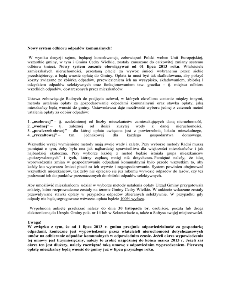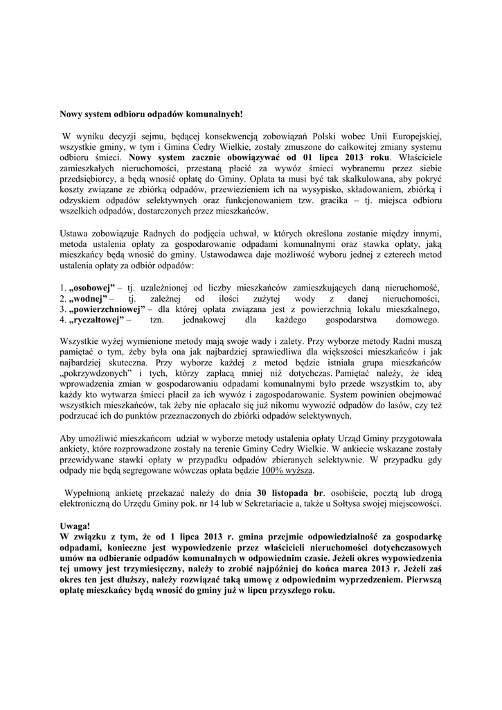 Nowy system odbioru odpadów komunalnych! W wyniku decyzji sejmu, będącej konsekwencją zobowiązań Polski wobec Unii Europejskiej, wszystkie gminy, w tym i Gmina Cedry Wielkie, zostały zmuszone do całkowitej zmiany systemu odbioru śmieci. Nowy system zacznie obowiązywać od 01 lipca 2013 roku. Właściciele zamieszkałych nieruchomości, przestaną płacić za wywóz śmieci wybranemu przez siebie przedsiębiorcy, a będą wnosić opłatę do Gminy. Opłata ta musi być tak skalkulowana, aby pokryć koszty związane ze zbiórką odpadów, przewiezieniem ich na wysypisko, składowaniem, zbiórką i odzyskiem odpadów selektywnych oraz funkcjonowaniem tzw. gracika – tj. miejsca odbioru wszelkich odpadów, dostarczonych przez mieszkańców. Ustawa zobowiązuje Radnych do podjęcia uchwał, w których określona zostanie między innymi, metoda ustalenia opłaty za gospodarowanie odpadami komunalnymi oraz stawka opłaty, jaką mieszkańcy będą wnosić do gminy. Ustawodawca daje możliwość wyboru jednej z czterech metod ustalenia opłaty za odbiór odpadów: 1. „osobowej” – tj. uzależnionej od liczby mieszkańców zamieszkujących daną nieruchomość, 2. „wodnej” – tj. zależnej od ilości zużytej wody z danej nieruchomości, 3. „powierzchniowej” – dla której opłata związana jest z powierzchnią lokalu mieszkalnego, 4. „ryczałtowej” – tzn. jednakowej dla każdego gospodarstwa domowego. Wszystkie wyżej wymienione metody mają swoje wady i zalety. Przy wyborze metody Radni muszą pamiętać o tym, żeby była ona jak najbardziej sprawiedliwa dla większości mieszkańców i jak najbardziej skuteczna. Przy wyborze każdej z metod będzie istniała grupa mieszkańców „pokrzywdzonych” i tych, którzy zapłacą mniej niż dotychczas. Pamiętać należy, że ideą wprowadzenia zmian w gospodarowaniu odpadami komunalnymi było przede wszystkim to, aby każdy kto wytwarza śmieci płacił za ich wywóz i zagospodarowanie. System powinien obejmować wszystkich mieszkańców, tak żeby nie opłacało się już nikomu wywozić odpadów do lasów, czy też podrzucać ich do punktów przeznaczonych do zbiórki odpadów selektywnych. Aby umożliwić mieszkańcom udział w wyborze metody ustalenia opłaty Urząd Gminy przygotowała ankiety, które rozprowadzone zostały na terenie Gminy Cedry Wielkie. W ankiecie wskazane zostały przewidywane stawki opłaty w przypadku odpadów zbieranych selektywnie. W przypadku gdy odpady nie będą segregowane wówczas opłata będzie 100% wyższa. Wypełnioną ankietę przekazać należy do dnia 30 listopada br. osobiście, pocztą lub drogą elektroniczną do Urzędu Gminy pok. nr 14 lub w Sekretariacie a, także u Sołtysa swojej miejscowości. Uwaga! W związku z tym, że od 1 lipca 2013 r. gmina przejmie odpowiedzialność za gospodarkę odpadami, konieczne jest wypowiedzenie przez właścicieli nieruchomości dotychczasowych umów na odbieranie odpadów komunalnych w odpowiednim czasie. Jeżeli okres wypowiedzenia tej umowy jest trzymiesięczny, należy to zrobić najpóźniej do końca marca 2013 r. Jeżeli zaś okres ten jest dłuższy, należy rozwiązać taką umowę z odpowiednim wyprzedzeniem. Pierwszą opłatę mieszkańcy będą wnosić do gminy już w lipcu przyszłego roku.