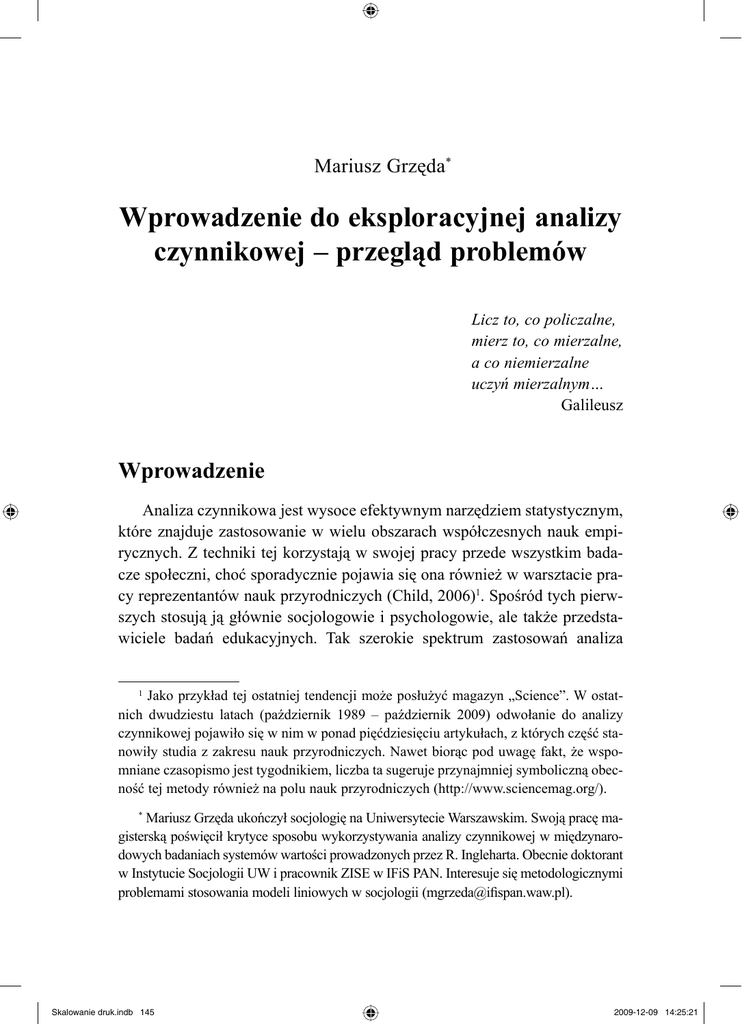 Mariusz Grzęda* Wprowadzenie do eksploracyjnej analizy czynnikowej – przegląd problemów Licz to, co policzalne, mierz to, co mierzalne, a co niemierzalne uczyń mierzalnym… Galileusz Wprowadzenie Analiza czynnikowa jest wysoce efektywnym narzędziem statystycznym, które znajduje zastosowanie w wielu obszarach współczesnych nauk empirycznych. Z techniki tej korzystają w swojej pracy przede wszystkim badacze społeczni, choć sporadycznie pojawia się ona również w warsztacie pracy reprezentantów nauk przyrodniczych (Child, 2006)1. Spośród tych pierwszych stosują ją głównie socjologowie i psychologowie, ale także przedstawiciele badań edukacyjnych. Tak szerokie spektrum zastosowań analiza Jako przykład tej ostatniej tendencji może posłużyć magazyn „Science”. W ostatnich dwudziestu latach (październik 1989 – październik 2009) odwołanie do analizy czynnikowej pojawiło się w nim w ponad pięćdziesięciu artykułach, z których część stanowiły studia z zakresu nauk przyrodniczych. Nawet biorąc pod uwagę fakt, że wspomniane czasopismo jest tygodnikiem, liczba ta sugeruje przynajmniej symboliczną obecność tej metody również na polu nauk przyrodniczych (http://www.sciencemag.org/). 1 Mariusz Grzęda ukończył socjologię na Uniwersytecie Warszawskim. Swoją pracę magisterską poświęcił krytyce sposobu wykorzystywania analizy czynnikowej w międzynarodowych badaniach systemów wartości prowadzonych przez R. Ingleharta. Obecnie doktorant w Instytucie Socjologii UW i pracownik ZISE w IFiS PAN. Interesuje się metodologicznymi problemami stosowania modeli liniowych w socjologii ([email protected]). * Skalowanie druk.indb 145 2009-12-09 14:25:21 146 Mariusz Grzęda czynnikowa zawdzięcza temu, że jest oparta na uniwersalnym schemacie analitycznym, który dobrze pasuje do wielu problemów badawczych, rozpatrywanych w wyżej wymienionych dziedzinach. W najogólniejszym bowiem sensie analiza czynnikowa jest narzędziem służącym do badania struktury relacji pomiędzy wieloma zmiennymi, które reprezentują zróżnicowanie jednostek2 poddanych badaniu statystycznemu (Alwin 2000). Celem tej techniki analitycznej jest dokonanie generalizacji informacji zawartej w analizowanym zestawie zmiennych. Generalizacja ta powstaje poprzez wskazanie (zgodnie z przyjętymi kryteriami), w każdej zmiennej tej części jej zróżnicowania, którą podziela ona wspólnie z innymi zmiennymi oraz pozostałej części, która pozostaje unikalna i specyficzna tylko dla niej (Child 2006). Opierając się na tym rozróżnieniu sekwencja procedur analitycznych zwana analizą czynnikową generuje jako wynik niewielką liczbę hipotetycznych zmiennych, zwanych zmiennymi ukrytymi lub czynnikami wspólnymi, które w sensie statystycznym reprezentują poddany analizie początkowy zbiór wielu zmiennych (Kim i Mueller 1978a). Początki analizy czynnikowej Koncepcja analizy czynnikowej jest oparta na zestawie kilku specyficznych założeń o charakterze filozoficznym, których najpierwotniejsze źródła sięgają czasów starożytnej Grecji. Podstawowa w tej analizie idea redukcji złożonej rzeczywistości do niewielkiej liczby pierwotnych, prostych czynników, pojawiła się około VI wieku p.n.e. w koncepcjach myślicieli z Miletu. Przedstawiciele tej szkoły filozoficznej sądzili, że obserwowalną różnorodność i złożoność świata dostępnego zmysłowo można wytłumaczyć istnieniem niewielkiej liczby pierwotnych, prostszych substancji. W ich koncepcjach świat widzialny w całej swej różnorodności był manifestacją różnego stopnia koncentracji i specyficznej konfiguracji kilku pojedynczych substancji pierwotnych takich jak np. woda czy powietrze. Obok filozofów z Miletu istotny wkład w ideę, na której wiele wieków później oparto koncepcję anaW przypadku badań społecznych analizowanymi jednostkami obserwacji mogą być zarówno pojedyncze osoby, jak i całe grupy, a także organizacje oraz jednostki terytorialne (np. szkoły, gminy, okręgi wyborcze, państwa itp). 2 Skalowanie druk.indb 146 2009-12-09 14:25:21 Wprowadzenie do eksploracyjnej analizy czynnikowej... 147 lizy czynnikowej, wniósł Parmenides. Wprowadził on podział na to co widoczne, dostępne zmysłowo i bezpośrednio obserwowalne oraz na to co ukryte, niedostępne w bezpośrednim doświadczeniu. Świat obserwowalny w koncepcji Parmenidesa był światem pełnym niestabilności i iluzji. Natomiast świat ukryty, mimo że niedostępny bezpośrednio, był prawdziwie realną, stabilną rzeczywistością, do której należy dotrzeć, by poznać prawdę. Ten schemat myślenia o naturze rzeczywistości został zaadaptowany przez wiele późniejszych szkół filozoficznych – m.in. przez atomistów, pitagorejczyków, a także Platona. Wszyscy wymienieni tu przedstawiciele starożytnej myśli filozoficznej przyjmowali założenie o tym, że rzeczywistość składa się z części dostępnej w bezpośrednim doświadczeniu oraz z części ukrytej, znajdującej się poza zasięgiem poznania zmysłowego. Wszyscy też zdecydowanie dezawuowali dostępną zmysłom część rzeczywistości, jako pełną iluzji i niewiele wartą z punktu widzenia poznania prawdy. Kolejnym starożytnym filozofem, który wniósł istotny wkład do idei, jakie legły u podstaw analizy czynnikowej, był Arystoteles. Uczeń Platona istotnie zmodyfikował sposób myślenia o rzeczywistości swoich poprzedników, zdecydowanie rehabilitując zmysłową, bezpośrednio dostępną stronę rzeczywistości. Arystoteles uznał, że obserwując regularności występujące w świecie danym bezpośrednio zmysłom można wysnuwać trafne wnioski na temat rzeczywistości. Stąd też jest on uznawany za ojca nauk empirycznych. Ponadto to właśnie jego myśli analiza czynnikowa zawdzięcza swoje kolejne fundamentalne założenie. Arystoteles w swoich pracach stosował bowiem schemat poznawczy, który wiele wieków później w zmieni