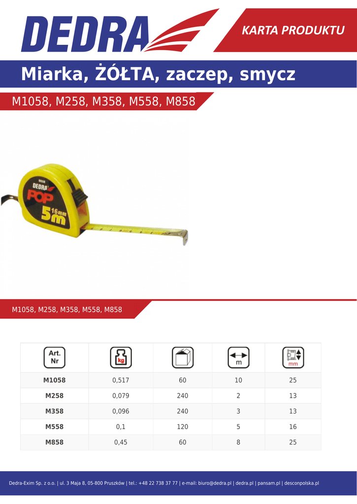 Miarka, ŻÓŁTA, zaczep, smycz M1058, M258, M358, M558, M858 M1058, M258, M358, M558, M858 M1058 0,517 60 10 25 M258 0,079 240 2 13 M358 0,096 240 3 13 M558 0,1 120 5 16 M858 0,45 60 8 25 Dedra-Exim Sp. z o.o. | ul. 3 Maja 8, 05-800 Pruszków | tel.: +48 22 738 37 77 | e-mail: [email protected] | dedra.pl | pansam.pl | desconpolska.pl
