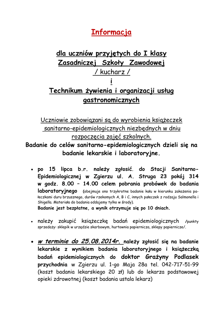 Informacja dla uczniów przyjętych do I klasy Zasadniczej Szkoły Zawodowej / kucharz / i Technikum żywienia i organizacji usług gastronomicznych Uczniowie zobowiązani są do wyrobienia książeczek sanitarno-epidemiologicznych niezbędnych w dniu rozpoczęcia zajęć szkolnych. Badanie do celów sanitarno-epidemiologicznych dzieli się na badanie lekarskie i laboratoryjne. po 15 lipca b.r. należy zgłosić. do Stacji SanitarnoEpidemiologicznej w Zgierzu ul. A. Struga 23 pokój 314 w godz. 8.00 – 14.00 celem pobrania probówek do badania laboratoryjnego (obejmuje ono trzykrotne badanie kału w kierunku zakażenia pałeczkami duru brzusznego, durów rzekomych A, B i C, innych pałeczek z rodzaju Salmonella i Shigella. Materiała do badania oddajemy tylko w środy). Badanie jest bezpłatne, a wynik otrzymuje się po 10 dniach. należy zakupić książeczkę badań epidemiologicznych /punkty sprzedaży: sklepik w urzędzie skarbowym, hurtownia papiernicza, sklepy papiernicze/. w terminie do 25.08.2014r. należy zgłosić się na badanie lekarskie z wynikiem badania laboratoryjnego i książeczką badań epidemiologicznych do doktor Grażyny Podlasek przychodnia w Zgierzu ul. 1-go Maja 28a tel. 042-717-51-99 (koszt badania lekarskiego 20 zł) lub do lekarza podstawowej opieki zdrowotnej (koszt badania ustala lekarz) Na rozpoczęcie roku szkolnego tj. 1 września proszę przynieść: 1. 2. książeczkę badań epidemiologicznych orzeczenie lekarskie do celów sanitarnoepidemiologicznych.