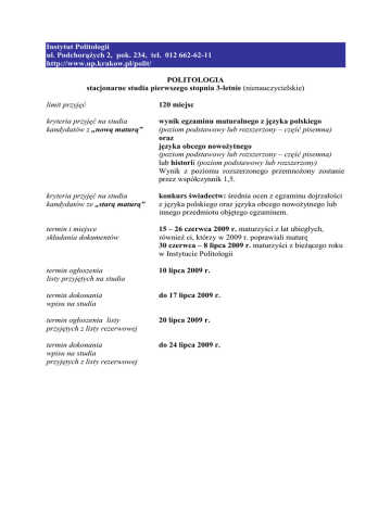Instytut Politologii ul. PodchorąŜych 2, pok. 234, tel. 012 662-62-11 http://www.up.krakow.pl/polit/ POLITOLOGIA stacjonarne studia pierwszego stopnia 3-letnie (nienauczycielskie) limit przyjęć 120 miejsc kryteria przyjęć na studia kandydatów z „nową maturą” wynik egzaminu maturalnego z języka polskiego (poziom podstawowy lub rozszerzony – część pisemna) oraz języka obcego nowoŜytnego (poziom podstawowy lub rozszerzony – część pisemna) lub historii (poziom podstawowy lub rozszerzony) Wynik z poziomu rozszerzonego przemnoŜony zostanie przez współczynnik 1,5. kryteria przyjęć na studia kandydatów ze „starą maturą” konkurs świadectw: średnia ocen z egzaminu dojrzałości z języka polskiego oraz języka obcego nowoŜytnego lub innego przedmiotu objętego egzaminem. termin i miejsce składania dokumentów 15 – 26 czerwca 2009 r. maturzyści z lat ubiegłych, równieŜ ci, którzy w 2009 r. poprawiali maturę 30 czerwca – 8 lipca 2009 r. maturzyści z bieŜącego roku w Instytucie Politologii termin ogłoszenia listy przyjętych na studia 10 lipca 2009 r. termin dokonania wpisu na studia do 17 lipca 2009 r. termin ogłoszenia listy przyjętych z listy rezerwowej 20 lipca 2009 r. termin dokonania wpisu na studia przyjętych z listy rezerwowej do 24 lipca 2009 r. Instytut Politologii ul. PodchorąŜych 2, pok. 234, tel. 012 662-62-11 http://www.up.krakow.pl/polit/ POLITOLOGIA niestacjonarne studia pierwszego stopnia 3-letnie (nienauczycielskie) Rekrutacja uzupełniająca do 30 września 2009 r. Studia prowadzone będą w Krakowie, w Limanowej oraz w Tarnowie limit przyjęć 120 miejsc Kraków 30 miejsc Limanowa 60 miejsc Tarnów kryteria przyjęć na studia kandydatów z „nową maturą” wynik egzaminu maturalnego z języka polskiego (poziom podstawowy lub rozszerzony – część pisemna) oraz języka obcego nowoŜytnego (poziom podstawowy lub rozszerzony – część pisemna) lub historii (poziom podstawowy lub rozszerzony) Wynik z poziomu rozszerzonego przemnoŜony zostanie przez współczynnik 1,5. kryteria przyjęć na studia kandydatów ze „starą maturą” konkurs świadectw: średnia ocen z egzaminu dojrzałości z języka polskiego oraz języka obcego nowoŜytnego lub innego przedmiotu objętego egzaminem. termin i miejsce składania dokumentów I termin: 30 czerwca – 8 lipca 2009 r. 1. w Krakowie, w Instytucie Politologii 2. w Limanowej, ul. Zygmunta Augusta 8, tel. 018 337-54-74 3. w Tarnowie, ul. Nowy Świat 30, tel. 014 688-88-10 Rekrutacja uzupełniająca do 30 września 2009 r. II termin pod warunkiem nie wypełnienia limitu: 1 – 18 września 2009 r. termin ogłoszenia listy przyjętych na studia termin dokonania wpisu na studia I termin: 10 lipca 2009 r. II termin: 22 września 2009 r. I termin: do 17 lipca 2009 r. II termin: do 30 września 2009 r. termin ogłoszenia listy przyjętych z listy rezerwowej I termin: 20 lipca 2009 r. II termin: 2 października 2009 r. termin dokonania wpisu na studia przyjętych z listy rezerwowej wg ustaleń Instytutu kwota opłaty z rok nauki 3000 zł Politologii ul. PodchorąŜych 2, pok. 234, tel. 012 662-62-11 http://www.up.krakow.pl/polit/ POLITOLOGIA niestacjonarne studia drugiego stopnia 2-letnie (nienauczycielskie) dla absolwentów studiów zawodowych z dyplomem licencjata kierunków politologia lub stosunki międzynarodowe limit przyjęć 200 miejsc kryteria przyjęć na studia konkurs dyplomów termin i miejsce składania dokumentów 21 – 25 września 2009 r. w Instytucie Politologii termin ogłoszenia listy przyjętych na studia 29 września 2009 r. termin dokonania wpisu na studia do 6 października 2009 r. termin ogłoszenia listy przyjętych z listy rezerwowej 8 października 2009 r. termin dokonania wpisu na studia z listy rezerwowej wg ustaleń Instytutu kwota opłaty z rok nauki 3000 zł Politologii ul. PodchorąŜych 2, pok. 234, tel. 012 662-62-11 http://www.up.krakow.pl/polit/ POLITOLOGIA niestacjonarne studia drugiego stopnia 2,5-letnie (nienauczycielskie) dla absolwentów studiów zawodowych z dyplomem WyŜszych Szkół Oficerskich lub dyplomem licencjata kierunków humanistycznych, ekonomicznych, pedagogicznych, prawa i administracji, geografii, turystyki lub kierunków pokrewnych z wyłączeniem politologii limit przyjęć 60 miejsc kryteria przyjęć na studia konkurs dyplomów termin i miejsce składania dokumentów 21 – 25 września 2009 r. w Instytucie Politologii termin ogłoszenia listy przyjętych na studia 29 września 2009 r. termin dokonania wpisu na studia do 6 października 2009 r. termin ogłoszenia listy przyjętych z listy rezerwowej 8 października 2009 r. termin dokonania wpisu na studia z listy rezerwowej wg ustaleń Instytutu kwota opłaty z rok nauki 3200 zł