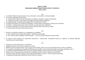 REGULAMIN MIEJSKIEJ BIBLIOTEKI PUBLICZNEJ W ŚWIECIU FILIA NR 2 1. 2. 3. 4. 5. 6. 7. §1 Z zasobów biblioteki mogą korzystać wszyscy obywatele, a korzystanie z nich jest bezpłatne. Przy zapisie zgłaszający się powinien: a) okazać dowód osobisty lub inny dokument stwierdzający tożsamość i miejsce zamieszkania b) wypełnić kartę zapisu i zobowiązać się podpisem do przestrzegania regulaminu. Za niepełnoletniego czytelnika odpowiadają rodzice lub opiekunowie prawni. Czytelnik zobowiązany jest informować bibliotekę o zmianie miejsca zamieszkania, miejsca pracy lub szkoły. Czytelnik, w którego domu panuje choroba zakaźna, nie może korzystać z biblioteki. Czytelnik przychodząc do wypożyczalni zostawia teczkę lub torbę na krześle przy stoliku. W wypożyczalni obowiązuje zakaz palenia tytoniu. §2 1. Kaucje od czytelników pobierane są w następujących wypadkach: a) jeśli czytelnik nie jest stałym mieszkańcem – aktualna wartość książki b) przy wypożyczaniu szczególnie cennych książek – w kwocie równej dwukrotnej wartości książki. 2. Po upływie trzech miesięcy od zaprzestania korzystania z wypożyczalni, nieodebrana kaucja jest wpłacana na dochody biblioteki i przeznaczana na zakup książek. §3 1. 2. 3. 4. 5. 6. 7. 8. Wypożyczyć można jednorazowo 5 woluminów. Książki wypożycza się na okres nie dłuższy niż 30 dni. Biblioteka może przesunąć termin zwrotu wypożyczonej książki, jeżeli nie ma na nią zapotrzebowania ze strony czytelników. W szczególnie uzasadnionych przypadkach biblioteka może zażądać zwrotu książek przed upływem terminu ustalonego w pkt. 2. Na prośbę czytelnika biblioteka może rezerwować książki aktualnie wypożyczone przez innych czytelników. Dzieci do lat 15 mogą wypożyczać książki dla czytelników dorosłych, tylko za zgodą tych czytelników. Wybrane książki czytelnik rejestruje u dyżurującego bibliotekarza, jemu też zwraca wypożyczone książki. Z księgozbioru podręcznego biblioteki korzysta się tylko na miejscu. §4 Biblioteka na prośbę czytelnika udziela informacji o książkach, pomaga w doborze literatury, korzystaniu z katalogów, wydawnictw informacyjnych, itp. §5 1. Czytelnik jest obowiązany do poszanowania książek będących własnością społeczną, powinien też zwrócić uwagę na stan książki przed jej wypożyczeniem. Zauważone uszkodzenia należy zgłosić bibliotekarzowi. 2. Za szkody wynikłe z zagubienia, uszkodzenia lub zniszczenia książki odpowiada czytelnik uiszczając odszkodowanie, którego wysokość odpowiada wartości książki ustalonej przez bibliotekarza w oparciu o aktualną cenę rynkową. Na sumy wpłacone z tytułu zagubienia lub uszkodzenia książki biblioteka wydaje czytelnikowi pokwitowanie. §6 1. Za przetrzymywanie książek ponad termin określony w § 3 pkt. 2 biblioteka pobiera opłaty w kwocie 0,25 zł. od woluminu za każdy rozpoczynający się tydzień po terminie zwrotu. Za wysłane upomnienia biblioteka pobiera opłatę za znaczek pocztowy. 2. Jeżeli czytelnik mimo upomnień wysyłanych przez bibliotekę odmawia zwrotu książki lub nie uiszcza należnych opłat, biblioteka dochodzi swych roszczeń zgodnie z przepisami prawa. §7 Skargi i wnioski czytelnicy mogą wpisywać do księgi skarg i wniosków, która znajduje się w czytelni MBP. §8 Czytelnik niestosujący się do przepisów regulaminu może być czasowo, a w szczególnie drastycznych wypadkach na stałe pozbawiony prawa do korzystania z wypożyczalni. Decyzję w tej sprawie podejmuje kierownik biblioteki. §9 Czytelnik podpisujący zobowiązanie oświadcza, iż zna regulamin biblioteki i jednocześnie wyraża zgodę na przetwarzanie danych osobowych do celów statystycznych biblioteki. Świecie, dn. 01.01.2007r.