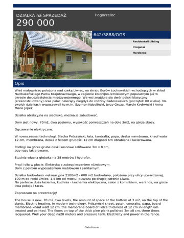 Pogorzelec DZIAŁKA na SPRZEDAŻ 290 000 642/3888/OGS ResidentalBuilding Irregular Hardened Opis Wieś malowniczo położona nad rzeką Liwiec, na skraju Borów Łochowskich wchodzących w skład Nadbużańskiego Parku Krajobrazowego, w regionie kolonijno-letniskowym popularnym już w okresie dwudziestolecia międzywojennego. We wsi znajduje się dwór polski klasyczny (zrekonstruowany) oraz pałac należący niegdyś do rodziny Paderewskich (początek XX wieku). Na swoich działkach wypoczywali tu m.in. Szymon Kobyliński, Jerzy Gruza, Marcin Kydryński i Anna Maria Jopek. Działka atrakcyjna na siedlisko, można ja zabudować. Dom jest nowy, 70m2, dwa poziomy, wysokość pomieszczeń na dole 3m2, na górze skosy. Ogrzewanie elektryczne. W nowoczesnej technologi. Blacha Prószyński, łata, kontralta, papa, deska membrana, knauf wata 12 cm, membrana, deska z felcem grubości 12 cm długości 6m obrabiana i lakierowana. Podłogi na górze grube deski sosnowe szlifowane 3m x 8 cm, trzy razy lakierowane. Studnia własna głęboka na 28 metrów i hydrofor. Prąd i siła w plocie. Elektryka z zabezpieczeniem różnicowym. Dom z pełnym wyposażeniem meblowym i sanitarnym. Działka budowlano -rekreacyjna 2100m2 - 600 m2 budowlana, położona przy ulicy utwardzonej, 100 m od rzeki Liwiec, 1,5 km od mostu, puszcza po drugiej stronie Liwca. Na parterze duża łazienka, kuchnia - kuchenka elektryczna, salon z kominkiem, weranda, na górze dwa pokoje i taras. Zapraszam na prezentację! The house is new, 70 m2, two levels, the amount of space at the bottom of 3 m2, on the top of the slants. Electric heating. In modern technology. Prószyński sheet, patch, contralto, papa, board membrane knauf watt 12 cm, the membrane board of Felce thickness of 12 cm in length 6m treated and painted. The floors on top of the thick pine plank polished 3m x8 cm, three times lacquered. Well your deep na28 meters and pressure tank. Electricity and power in the fence. Gata House Electronics with differential protection. House fully equipped furniture and sanitary. The recreational Plot Construction of 2100 m2. On the ground floor a large bathroom, kitchen - electric stove, living room with fireplace, porch, upstairs two bedrooms and a terrace. Picturesque village located on the river Liwiec, on the edge of the Bory Łochowskich included in the Bug Landscape Park, in the region Camps resort popular already in the interwar period. The village has a classical Polish manor house (reconstructed) and the palace once belonging to the family of Paderewski (early twentieth century). They rested on their plots, among others, Simon Kobyliński, Jerzy debris, Marcin Kydryński and Anna Maria Jopek. GATA HOUSE ul. Puławska 24a lok.1 02-512 Warszawa Wiesława Jędrzejewska tel. 882 052 250 tel. 22 4000370 email: [email protected] Gata House Powered by TCPDF (www.tcpdf.org)