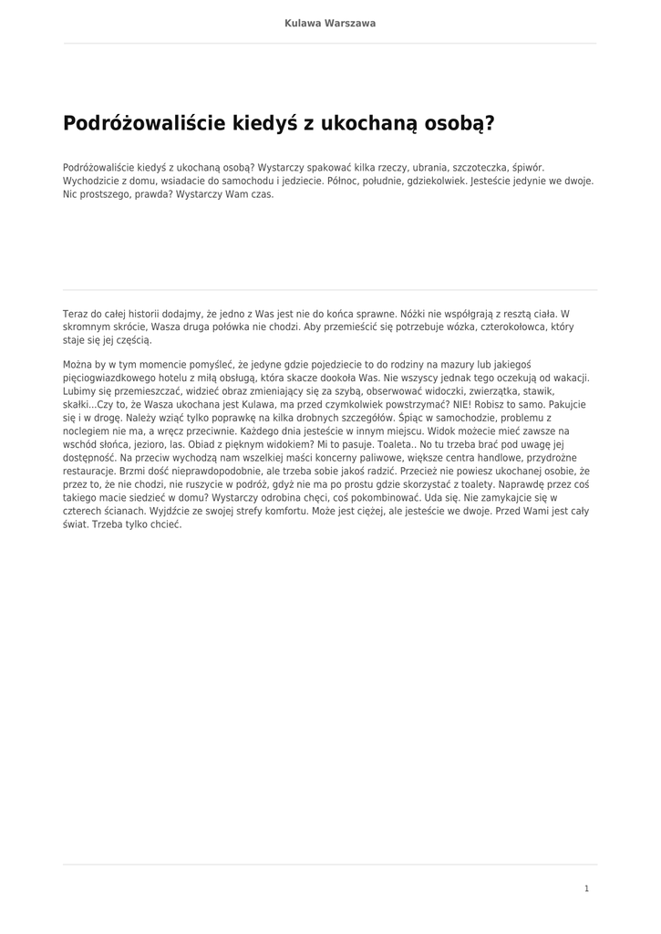 Kulawa Warszawa Podróżowaliście kiedyś z ukochaną osobą? Podróżowaliście kiedyś z ukochaną osobą? Wystarczy spakować kilka rzeczy, ubrania, szczoteczka, śpiwór. Wychodzicie z domu, wsiadacie do samochodu i jedziecie. Północ, południe, gdziekolwiek. Jesteście jedynie we dwoje. Nic prostszego, prawda? Wystarczy Wam czas. Teraz do całej historii dodajmy, że jedno z Was jest nie do końca sprawne. Nóżki nie współgrają z resztą ciała. W skromnym skrócie, Wasza druga połówka nie chodzi. Aby przemieścić się potrzebuje wózka, czterokołowca, który staje się jej częścią. Można by w tym momencie pomyśleć, że jedyne gdzie pojedziecie to do rodziny na mazury lub jakiegoś pięciogwiazdkowego hotelu z miłą obsługą, która skacze dookoła Was. Nie wszyscy jednak tego oczekują od wakacji. Lubimy się przemieszczać, widzieć obraz zmieniający się za szybą, obserwować widoczki, zwierzątka, stawik, skałki...Czy to, że Wasza ukochana jest Kulawa, ma przed czymkolwiek powstrzymać? NIE! Robisz to samo. Pakujcie się i w drogę. Należy wziąć tylko poprawkę na kilka drobnych szczegółów. Śpiąc w samochodzie, problemu z noclegiem nie ma, a wręcz przeciwnie. Każdego dnia jesteście w innym miejscu. Widok możecie mieć zawsze na wschód słońca, jezioro, las. Obiad z pięknym widokiem? Mi to pasuje. Toaleta.. No tu trzeba brać pod uwagę jej dostępność. Na przeciw wychodzą nam wszelkiej maści koncerny paliwowe, większe centra handlowe, przydrożne restauracje. Brzmi dość nieprawdopodobnie, ale trzeba sobie jakoś radzić. Przecież nie powiesz ukochanej osobie, że przez to, że nie chodzi, nie ruszycie w podróż, gdyż nie ma po prostu gdzie skorzystać z toalety. Naprawdę przez coś takiego macie siedzieć w domu? Wystarczy odrobina chęci, coś pokombinować. Uda się. Nie zamykajcie się w czterech ścianach. Wyjdźcie ze swojej strefy komfortu. Może jest ciężej, ale jesteście we dwoje. Przed Wami jest cały świat. Trzeba tylko chcieć. 1