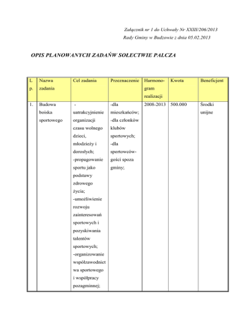 Załącznik nr 1 do Uchwały Nr XXIII/206/2013 Rady Gminy w Budzowie z dnia 05.02.2013 OPIS PLANOWANYCH ZADAŃW SOŁECTWIE PALCZA L Nazwa p. zadania Cel zadania Przeznaczenie Harmono- Kwota Beneficjent gram realizacji 1. Budowa - -dla boiska uatrakcyjnienie mieszkańców; sportowego organizacji -dla członków czasu wolnego klubów dzieci, sportowych; młodzieży i -dla dorosłych; sportowców- -propagowanie gości spoza sportu jako gminy; podstawy zdrowego życia; -umożliwienie rozwoju zainteresowań sportowych i pozyskiwania talentów sportowych; -organizowanie współzawodnict wa sportowego i współpracy pozagminnej; 2008-2013 500.000 Środki unijne -pozyskanie terenu na imprezy masowe lokalne i pozagminne; 2. Remont dróg poprawa stanu -dla gminnych w bezpieczeństwa mieszkańców; sołectwie w gminie; -dla Palcza 5 km -polepszenie przyjezdnych, warunków turystów, komunikacyjny gości; 2009-2013 900.000 Środki własne ch; -umożliwienie stworzenia dogodnych połączeń między przysiółkami; 3. Rozbudowa -propagowanie -dla dzieci, infrastruktury zdrowego stylu młodzieży i Własne turystycznej, życia; dorosłych Środki z budowa -przygotowanie mieszkańców; funduszy ścieżek infrastruktury -dla turystów; unijnych rowerowych turystycznej oraz szlaków jako turystycznych polepszenie oferty turystycznej; -organizacja i wykorzystanie czasu wolnego przez 2010-2015 1.000.000 Środki mieszkańców i gości; -podniesienie walorów estetycznych miejscowości; 4. Termomodern -realizacja -dla 2010-2013 500.000 izacja zadań pracowników własne, obiektów proekologiczny i petentów; WFOŚ użyteczności ch; -dla gości; publicznej -wprowadzenie -dla oszczędności w mieszkańców; Środki systemie grzewczym; -poprawa warunków socjalnych pracowników i petentów w obiektach użyteczności publicznej; 5. Wykonanie -szukanie -dla instalacji oszczędności i korzystającyc własne, systemu rezerw w h z budynków środki słonecznego zakresie użyteczności unijne, ogrzewania ogrzewania publicznej, środki wody w wody; mieszkańców WFOŚ budynkach -wykorzystanie i użyteczności najnowszych pracowników publicznej źródeł energii; tych -realizacja budynków; zadań 2010-2013 2.000.000 Środki proekologiczny ch; 6. Rozbudowa i -poprawa -dla modernizacja warunków mieszkańców, oświetlenia bezpieczeństwa turystów, ulicznego w w Palczy; gości; Palczy (30 -uatrakcyjnienie opraw) wizerunku 2010-2013 100.000 Środki własne Palczy jako miejscowości; wyeksponowani e walorów estetycznych ulic; 7. Zagospodaro poprawa jakości -dla wanie terenu życia na mieszkańców, przy boisku obszarach turystów, sportowym wiejskich przez gości; ORLIK kształtowanie obszarów o szczególnym znaczeniu dla zaspokojenia potrzeb mieszkańców, 2013-2014 200.000 Środki własne 6. OPIS ZADANIA PRIORYTETOWEGO Budowa boiska sportowego Zdjęcie nr 3: Boisko sportowe w Palczy Źródło: materiał własny autorów W sołectwie Palcza jest możliwość i konieczność wybudowania boiska sportowego, albowiem są warunki techniczne i osoby zaangażowane w budowę tego typu obiektu. By jednak boisko zyskało poziom wg najnowszych standardów, potrzeba odpowiednich przygotowań i utwardzenia gruntu, a także zakup koniecznych i niezbędnych urządzeń sportowych z atestami. By móc przechowywać sprzęt sportowy, potrzebne jest też zaplecze i szatnie dla osób korzystających z boiska. Planowane jest oświetlenie boiska i wyposażenie w ławeczki dla kibiców. Tak zagospodarowane boisko spełniać będzie wiele ról. Będzie miejscem integracji lokalnego społeczeństwa, pozwoli propagować ruch i zdrowy tryb życia, rozwijać uzdolnienia sportowe, uczyć „zdrowej” rywalizacji i współdziałania w zespole. Zapewni współprace z innymi klubami sportowymi i wymianę doświadczeń w tym zakresie. Ponadto umożliwi organizację imprez sportowych i kulturalnych także o skali gminnej i ponadgminnej. Będzie znakomitą wizytówką sołectwa i da możliwość większej integracji społeczności lokalnej oraz umożliwi wykorzystanie czasu wolnego przez dzieci i dorosłych ucząc dobrych wzorów.