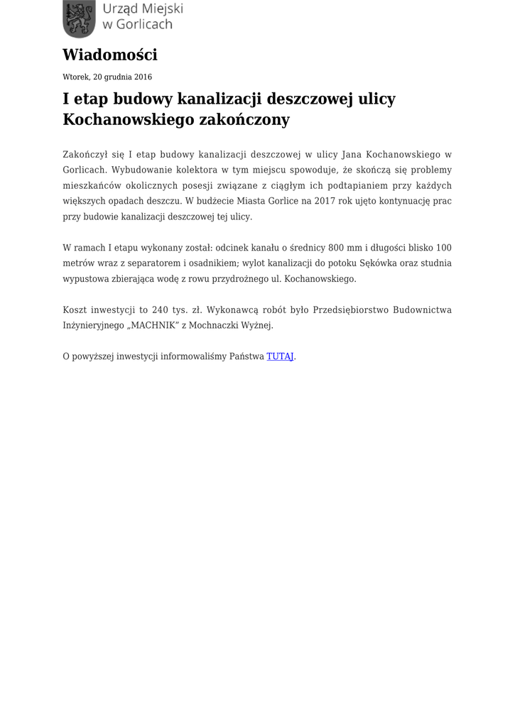 Wiadomości Wtorek, 20 grudnia 2016 I etap budowy kanalizacji deszczowej ulicy Kochanowskiego zakończony Zakończył się I etap budowy kanalizacji deszczowej w ulicy Jana Kochanowskiego w Gorlicach. Wybudowanie kolektora w tym miejscu spowoduje, że skończą się problemy mieszkańców okolicznych posesji związane z ciągłym ich podtapianiem przy każdych większych opadach deszczu. W budżecie Miasta Gorlice na 2017 rok ujęto kontynuację prac przy budowie kanalizacji deszczowej tej ulicy. W ramach I etapu wykonany został: odcinek kanału o średnicy 800 mm i długości blisko 100 metrów wraz z separatorem i osadnikiem; wylot kanalizacji do potoku Sękówka oraz studnia wypustowa zbierająca wodę z rowu przydrożnego ul. Kochanowskiego. Koszt inwestycji to 240 tys. zł. Wykonawcą robót było Przedsiębiorstwo Budownictwa Inżynieryjnego „MACHNIK” z Mochnaczki Wyżnej. O powyższej inwestycji informowaliśmy Państwa TUTAJ.